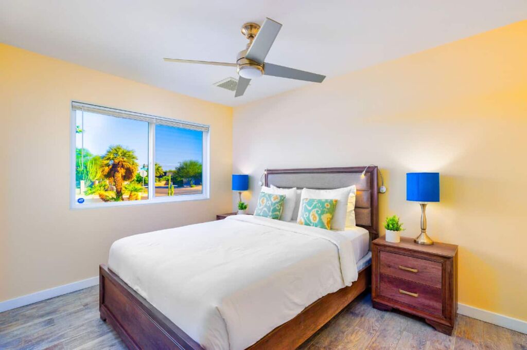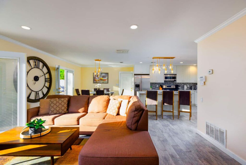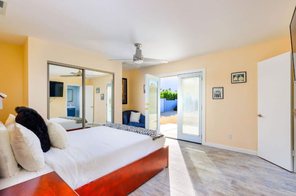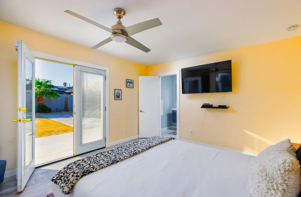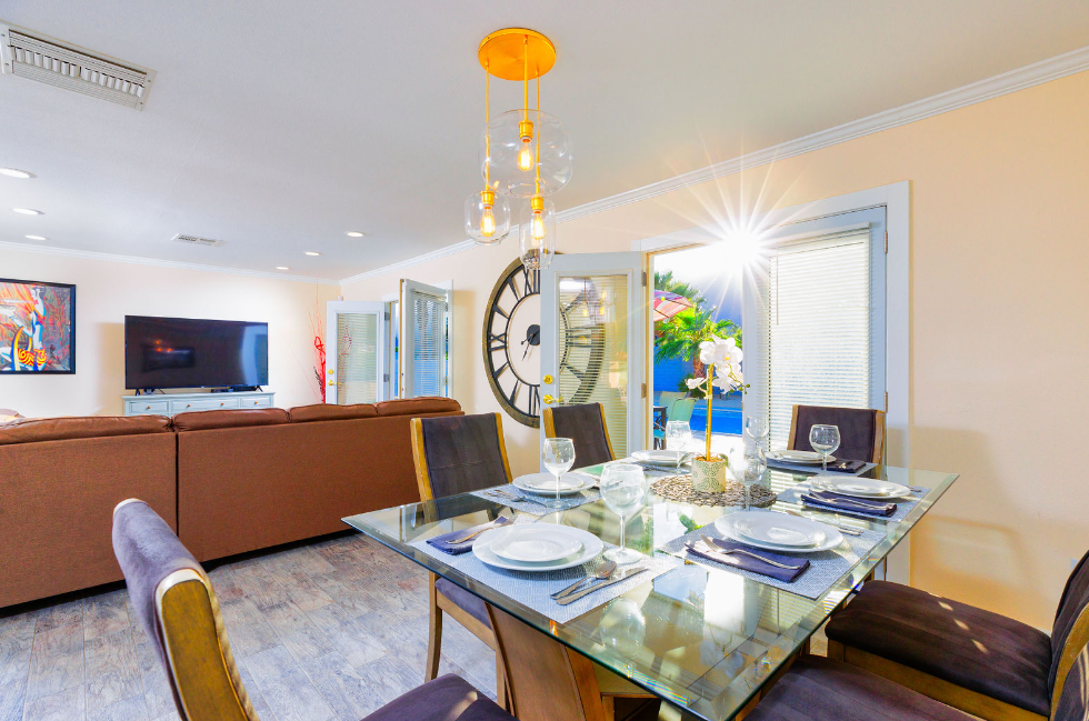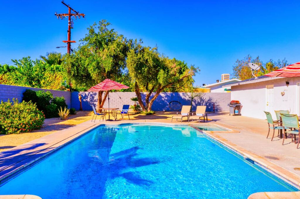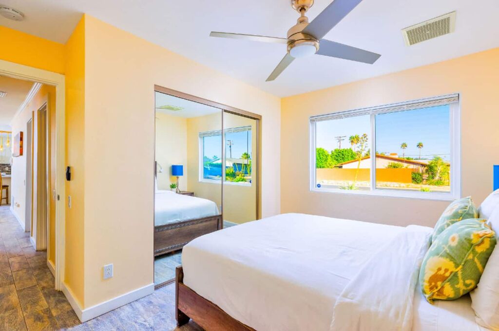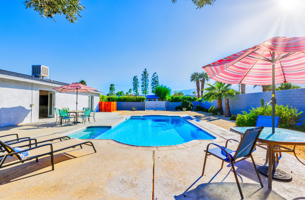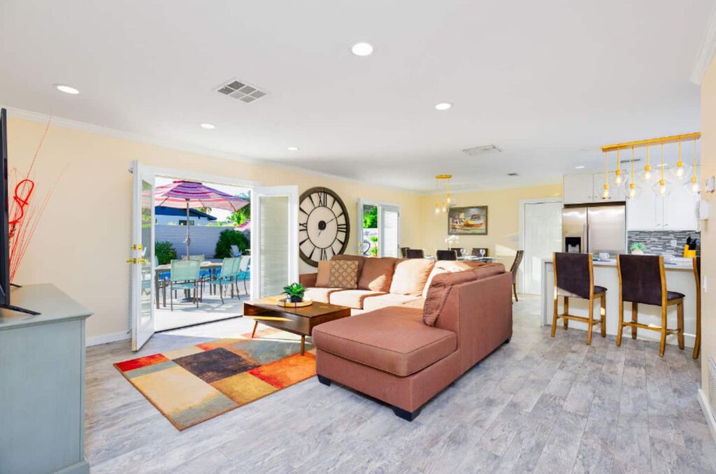 This contemporary home boasts brand new appliances, wood-tone tile flooring, modern furnishings, and vibrant decor throughout. It perfectly embodies the Palm Springs lifestyle, known for its seamless indoor-outdoor living. Step onto the patio and soak up the abundant sunshine while sipping cocktails with friends or take a refreshing dip in the sparkling pool (heating available for an additional fee) while enjoying the backdrop of majestic mountains. In the evening, gather with loved ones and unwind while stargazing from the in-ground spa. The open floor plan makes dining and entertaining a breeze, and the well-equipped kitchen is ready for your culinary creations, with seating available in the stylish dining area or at the kitchen island. The brightly decorated living area features a comfy sectional sofa, a splendid 50” HDTV, and a captivating view of the outdoor pool and the distant mountains.