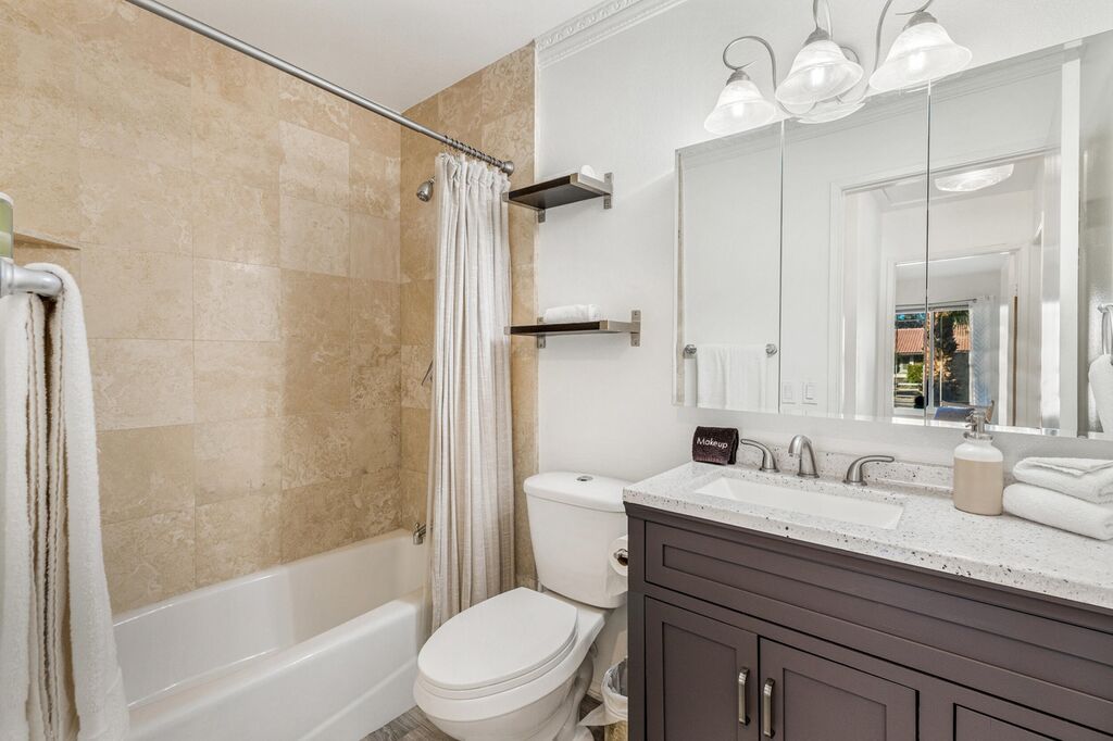 However, the real magic awaits outdoors. Step through sliding glass doors to your private oasis, where a sparkling pool invites you to take a refreshing dip or lounge under the warm California sun. Unwind in the soothing spa as you soak in views of the majestic mountains surrounding Palm Springs. Lush palm trees sway in the gentle breeze, completing the picture-perfect scene of relaxation and tranquility.