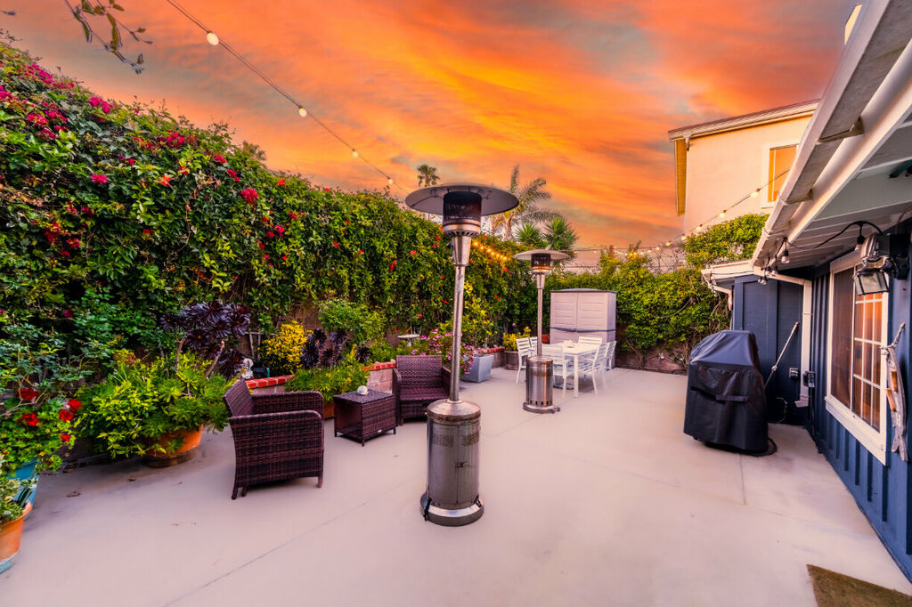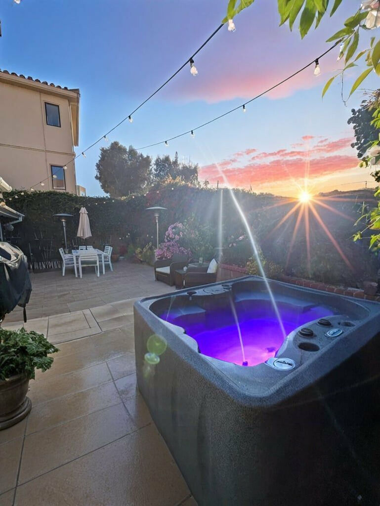 The backyard is a refreshing private patio that is bursting with gorgeous vegetation, while the jacuzzi offers a place to relax and soak up some rays. Have dinner outdoors at a dining table for six -- the grill is nearby, and if it gets chilly, there's a heater to warm things up.