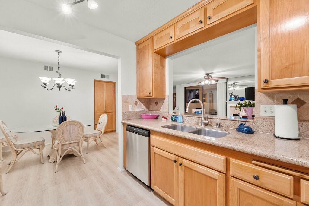 The detached two-car garage sits close enough to the patio that it can be opened with a remote, making parking simple. The villa faces a greenbelt, giving the outdoor space a pleasant, open feel. Recent updates give the home a refreshed and well-maintained feel.