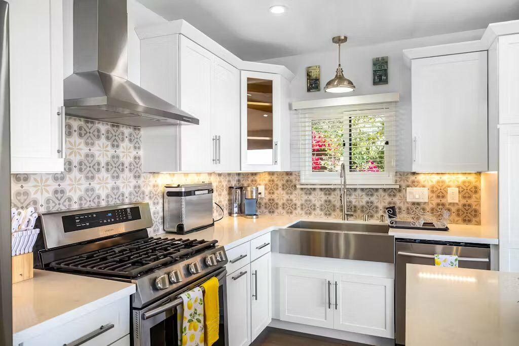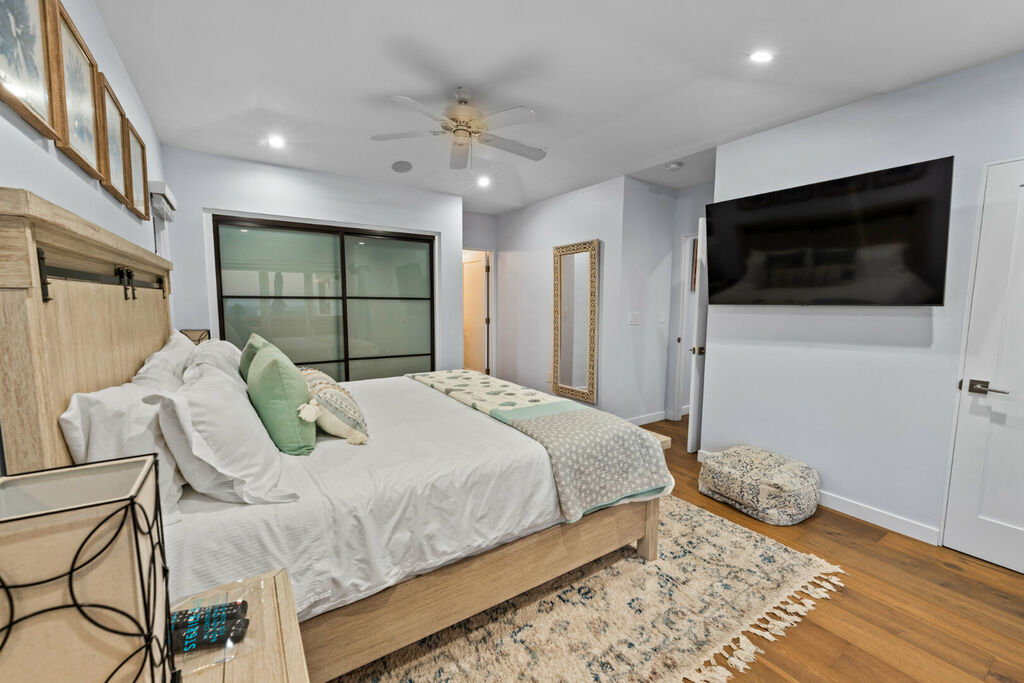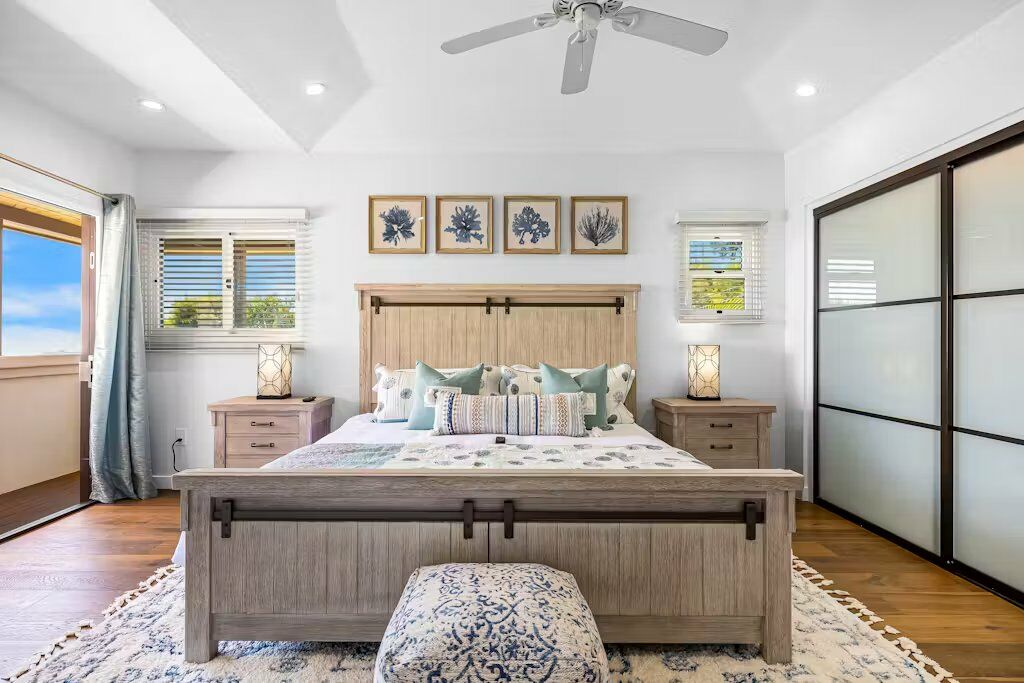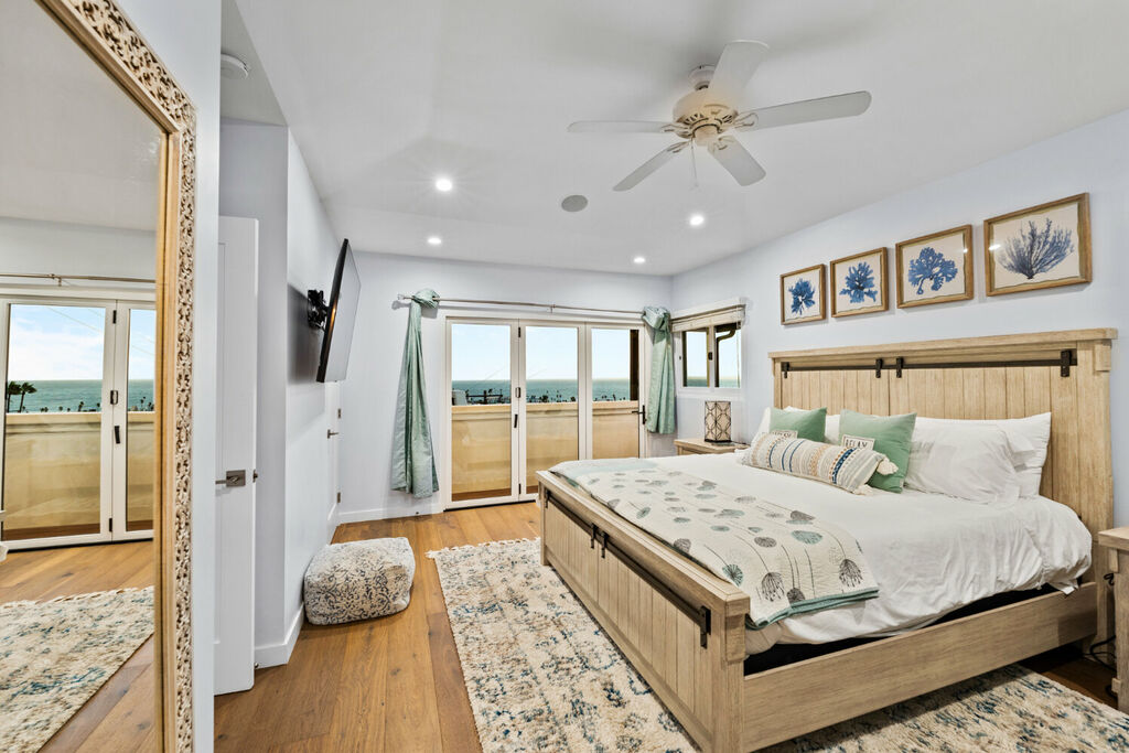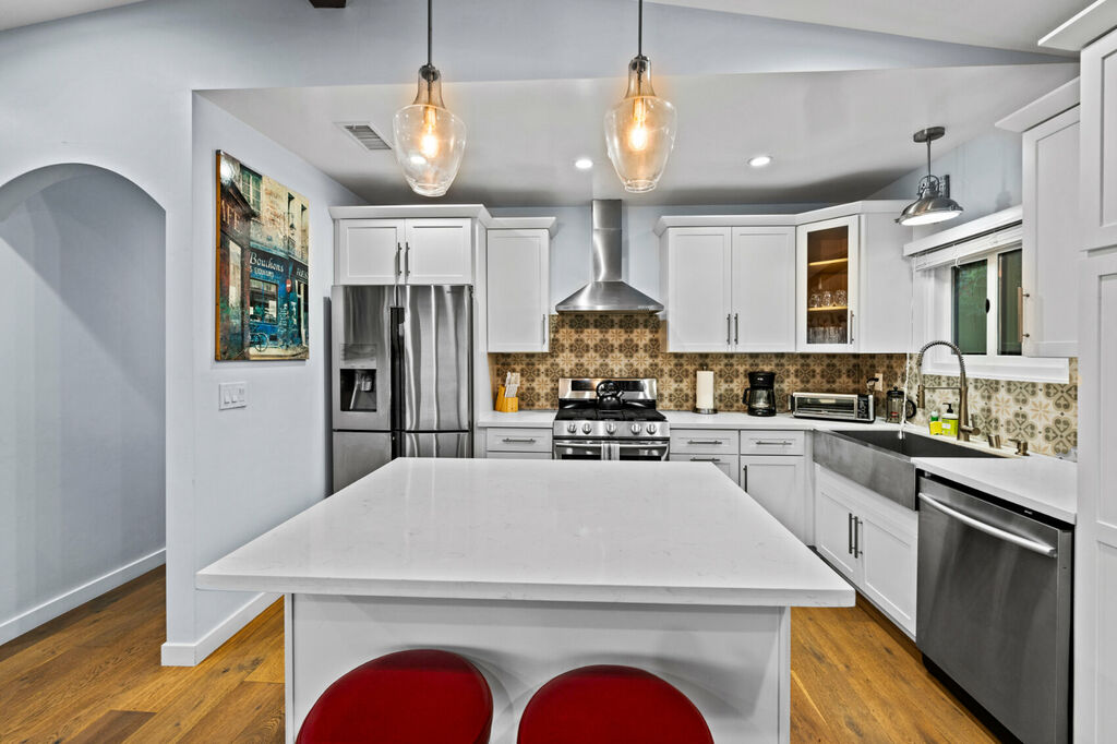 The heart of the home is the kitchen, equipped with stainless steel appliances and a floating island breakfast bar, ideal for preparing everything from group meals to beach picnic snacks. Whether dining indoors or alfresco at the outdoor dining table, you’ll savor every moment against the backdrop of Ventura’s stunning sunsets.