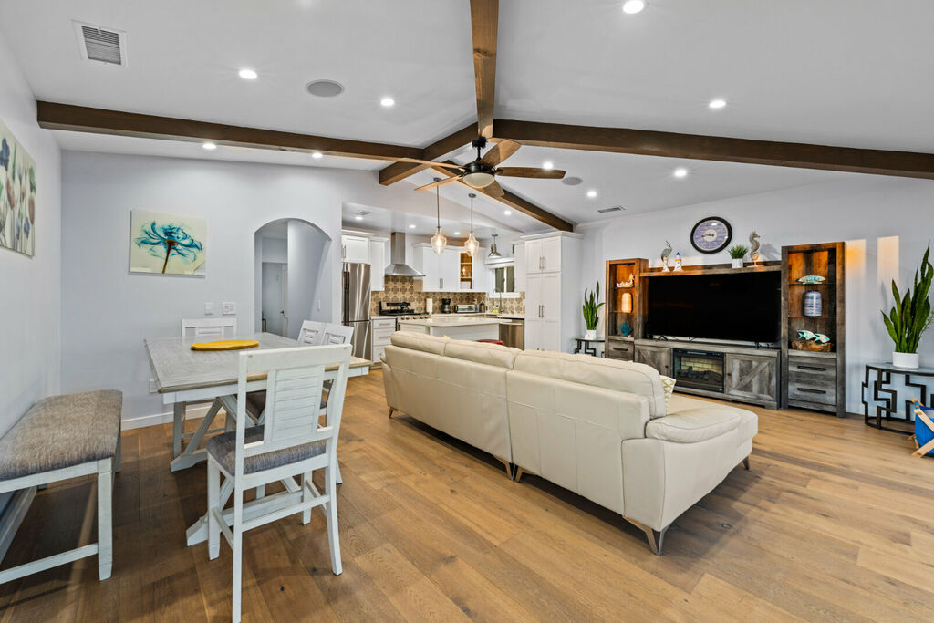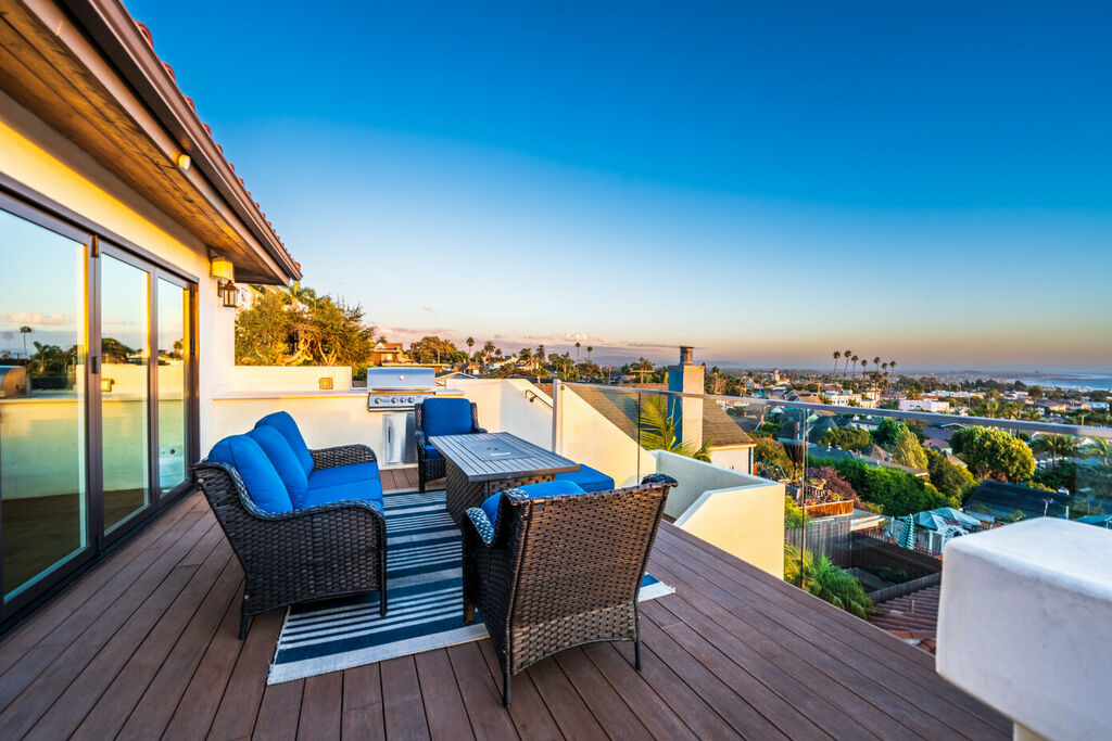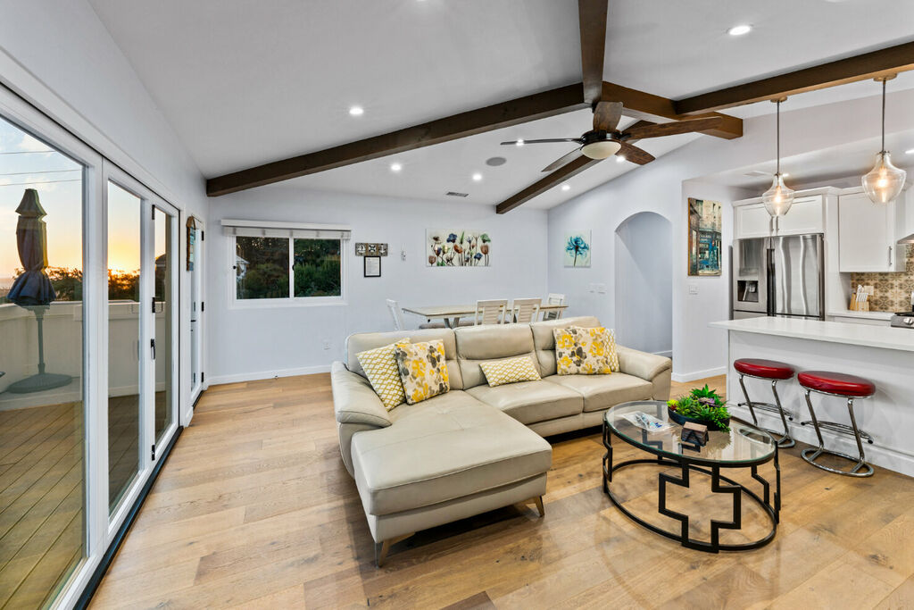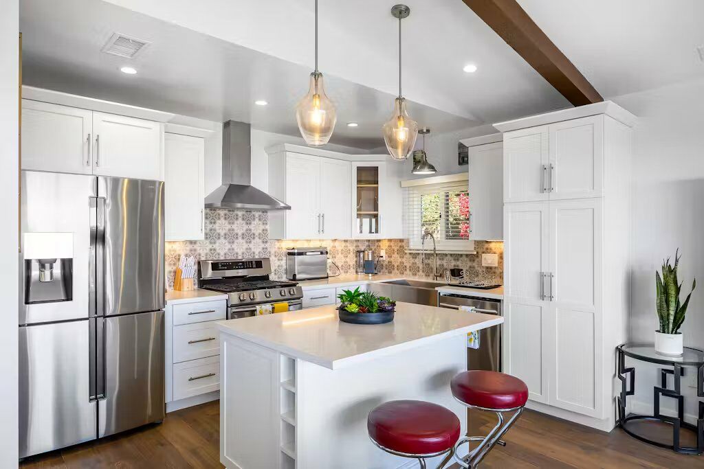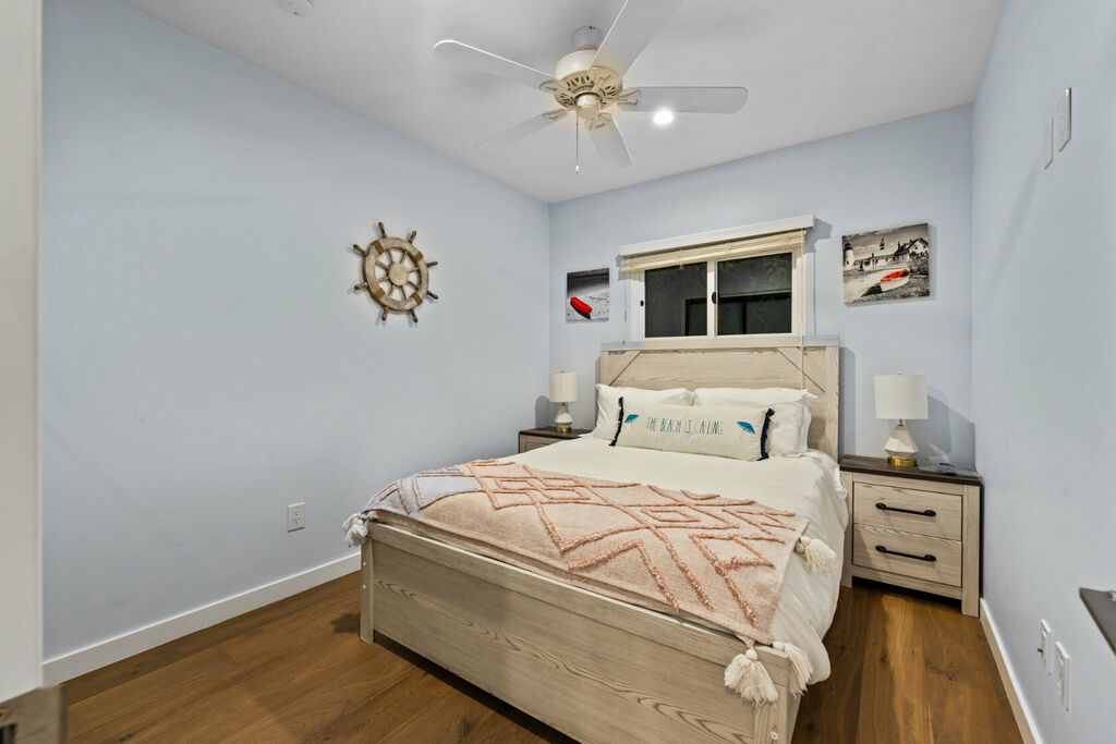 The heart of the home is the kitchen, equipped with stainless steel appliances and a floating island breakfast bar, ideal for preparing everything from group meals to beach picnic snacks. Whether dining indoors or alfresco at the outdoor dining table, you’ll savor every moment against the backdrop of Ventura’s stunning sunsets.