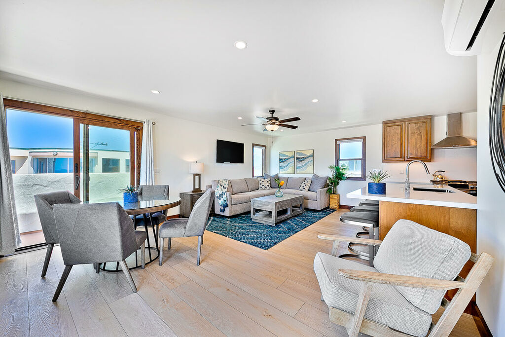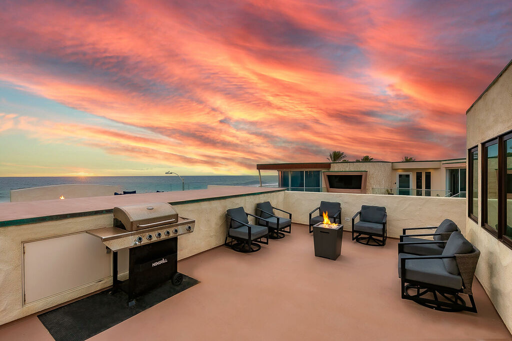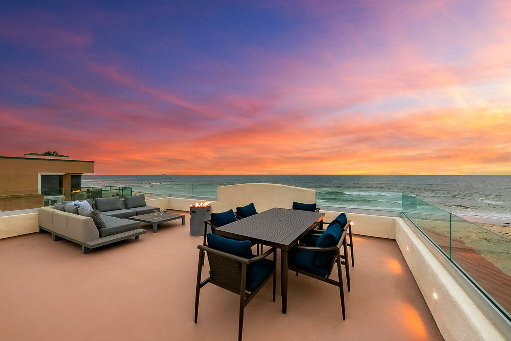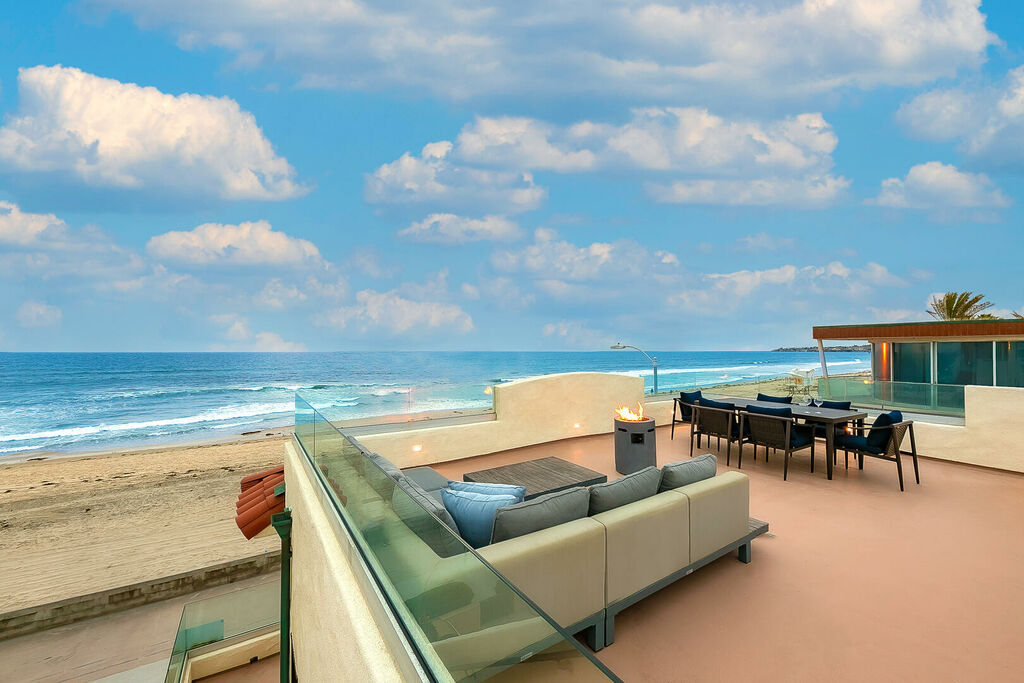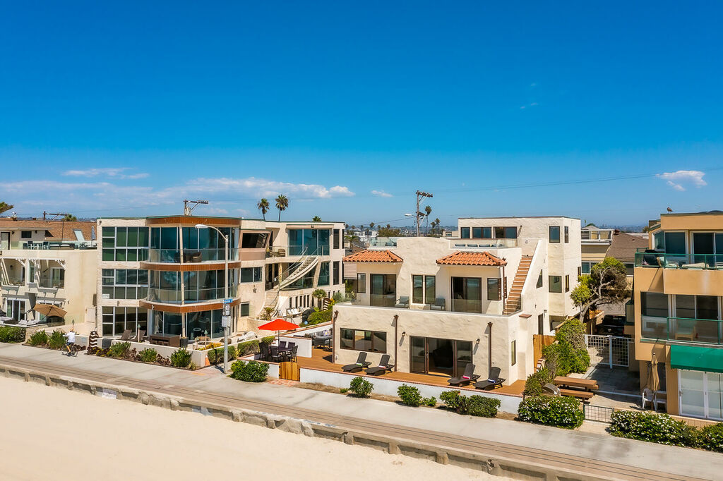 Across both residences, sun-filled living and dining areas flow seamlessly into brand-new kitchens equipped with stainless steel appliances, ample cabinetry, and modern finishes. Expansive sliding glass doors open to a large oceanfront patio where you can watch the energy of the boardwalk below, while outdoor amenities invite you to relax in the hot tub, gather around the fire pit, or grill meals as the sea breeze rolls in. The rooftop deck crowns the property with panoramic coastal views and is the ultimate spot for sunset cocktails, group dinners, or simply soaking up the Southern California lifestyle. Additional conveniences include air conditioning throughout, in-unit washers and dryers, multiple TVs, and easy access to San Diego’s top attractions, dining, and shopping.