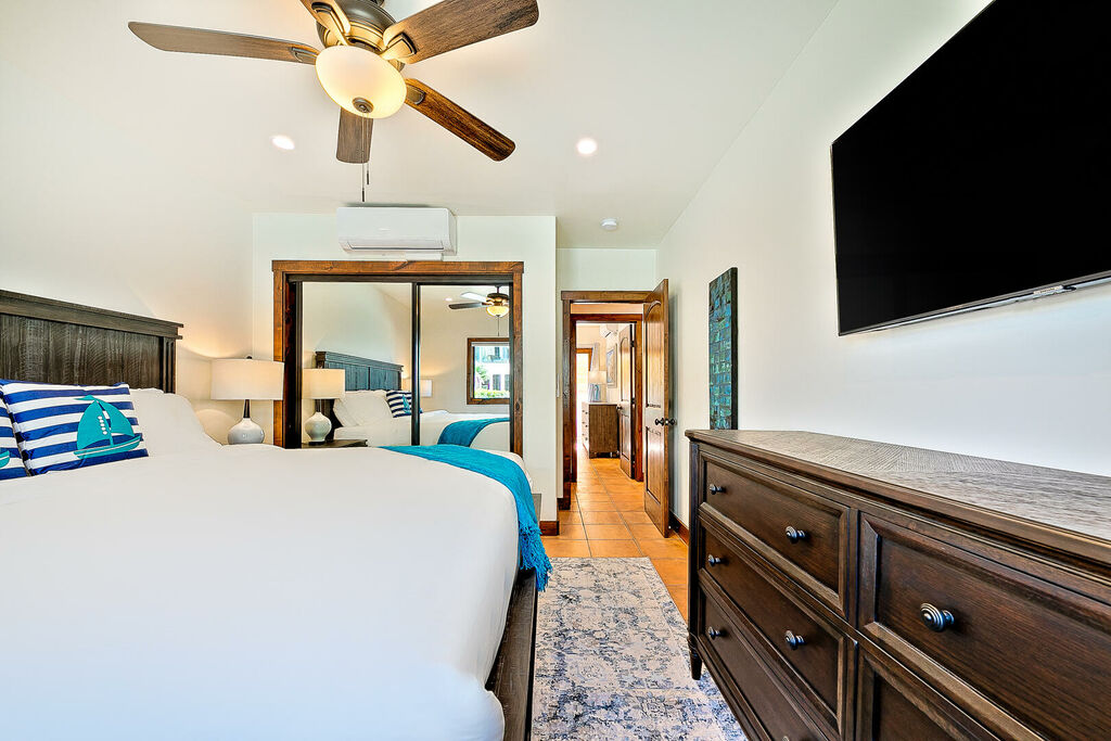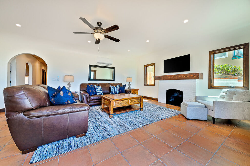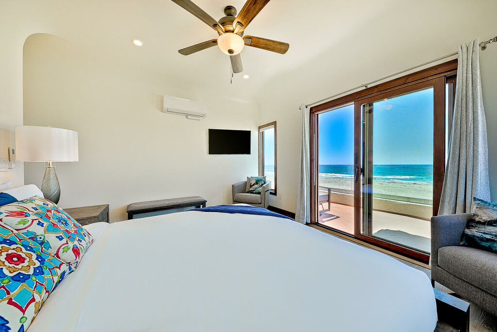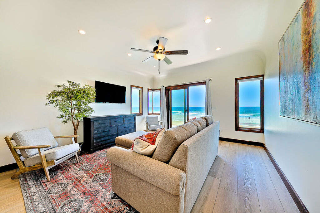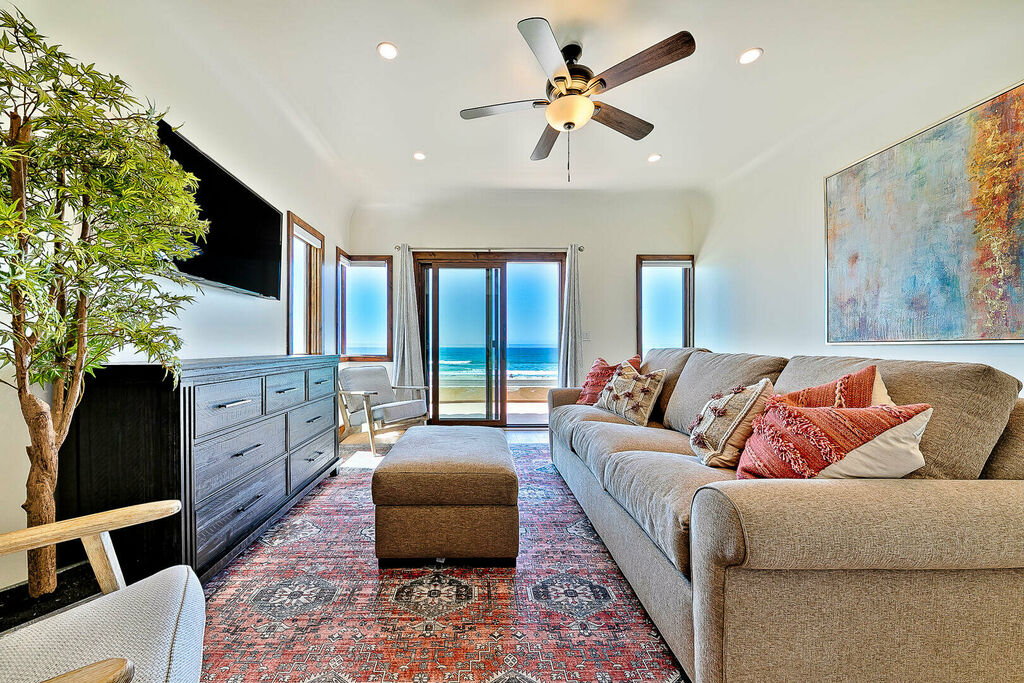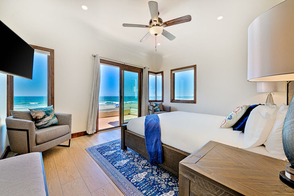 Sleeping accommodations are thoughtfully distributed across both homes to comfortably host large groups. 'La Hacienda', the main oceanfront residence, includes a second-floor primary suite with a king bed, along with three king bedrooms on the first floor. The second floor also features an additional king bedroom and a queen bedroom, plus an upstairs living room with a queen sleeper sofa, allowing the main house to sleep up to 14 guests. 'La Siesta', the attached residence, adds even more flexibility with a second-floor primary bedroom featuring a king bed, an additional queen bedroom on the same level, and an upstairs living room with a queen sleeper sofa. Together, the two homes create a spacious eight-bedroom retreat with multiple living areas, ideal for gathering together while still enjoying privacy.