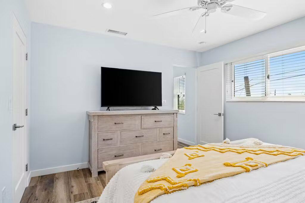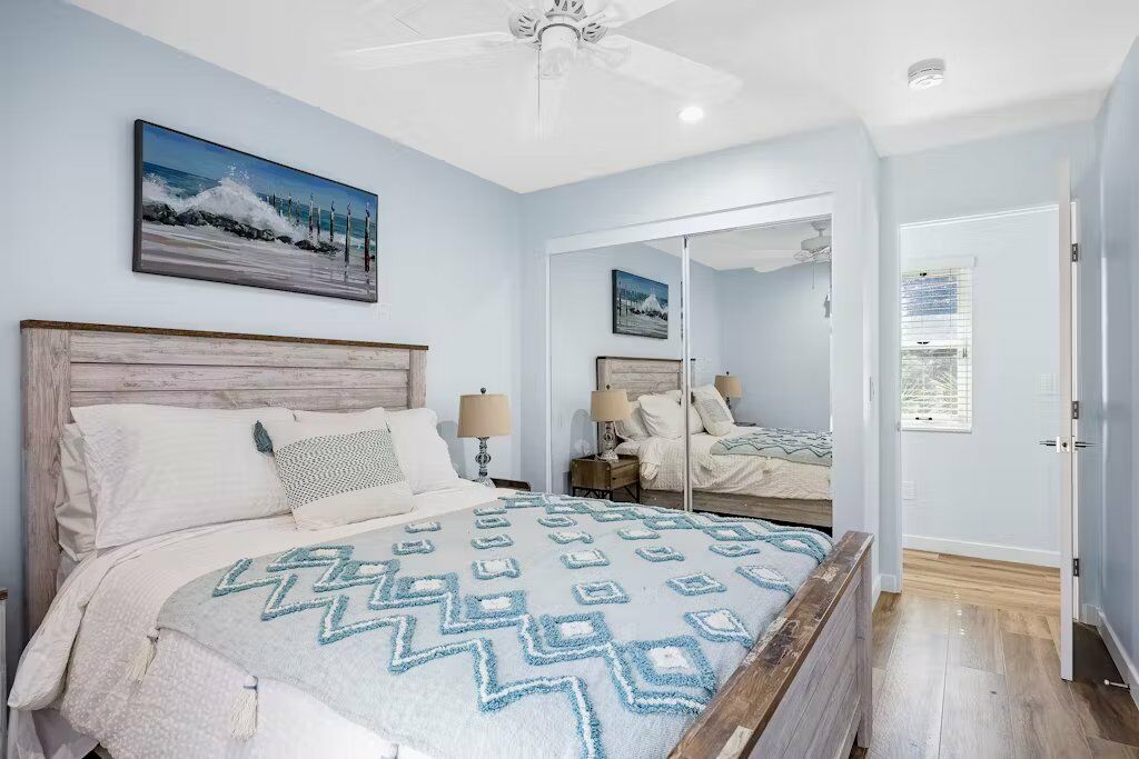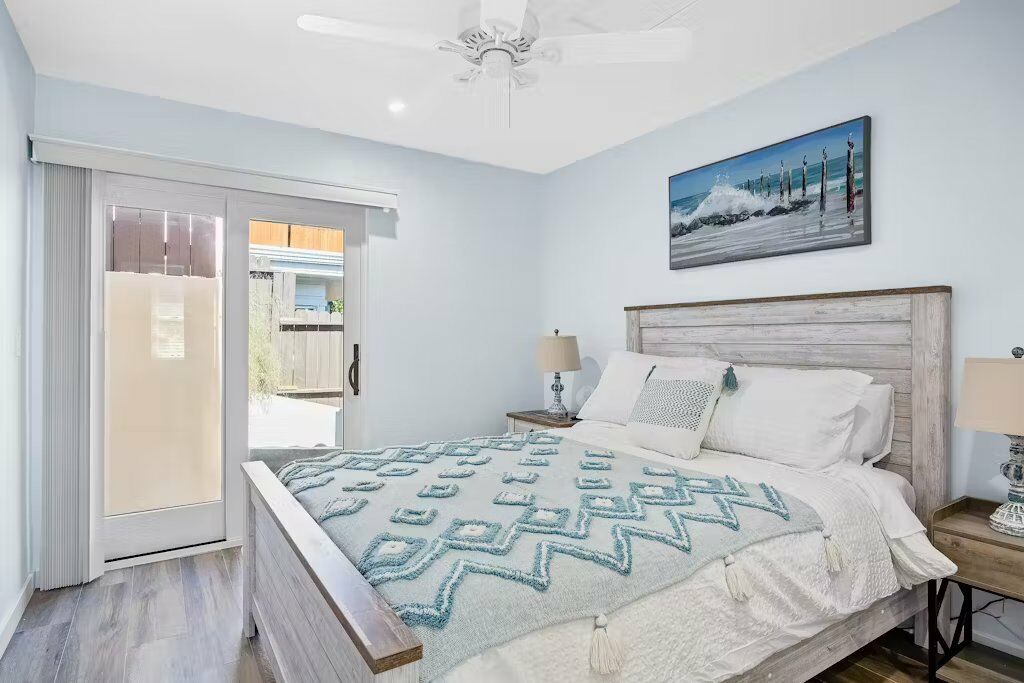 This charming two-bedroom cottage, just minutes from the vibrant downtown and a mile from the golden shores, offers a perfect setting for coastal tranquility and relaxation. Bathed in natural light, the open living spaces boast stylish décor and a serene ambiance, making it an inviting retreat for small families or groups.
