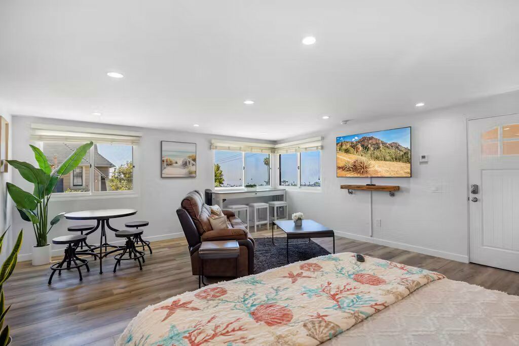 The charm of Ventura comes alive in this cozy studio retreat. The moment you step inside, you’re greeted by a space that feels both intimate and expansive, and offers a relaxed ambiance of coastal living. Enjoy sun filled mornings, followed by leisurely strolls to Ventura Beach, just two miles away. In the evening, the private patio offers breathtaking ocean views that perfectly complement a glass of wine during sunset. The private patio with a grill sets the scene for a delightful barbecue with friends or a romantic dinner for two. The sleeping arrangement offers a comfortable queen sized bed, with a full size bathroom which includes a walk-in shower.