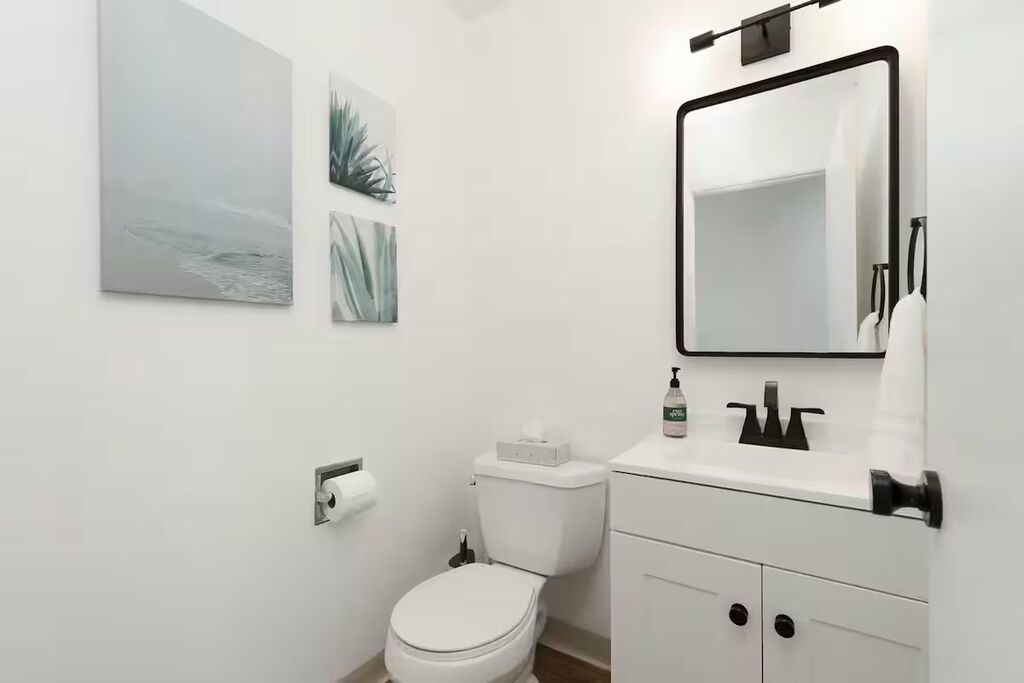 Step inside and you’ll notice the fresh touches throughout, the kind that make a place feel cared for. The main level opens with a kitchen prepared for simple breakfasts before a morning walk, or packed picnic lunches ready to accompany you to the shoreline. The dining area flows into a comfortable living room where evenings tend to wind down with a movie, soft lighting, and the distant hum of the ocean. A convenient half bath completes the space.
