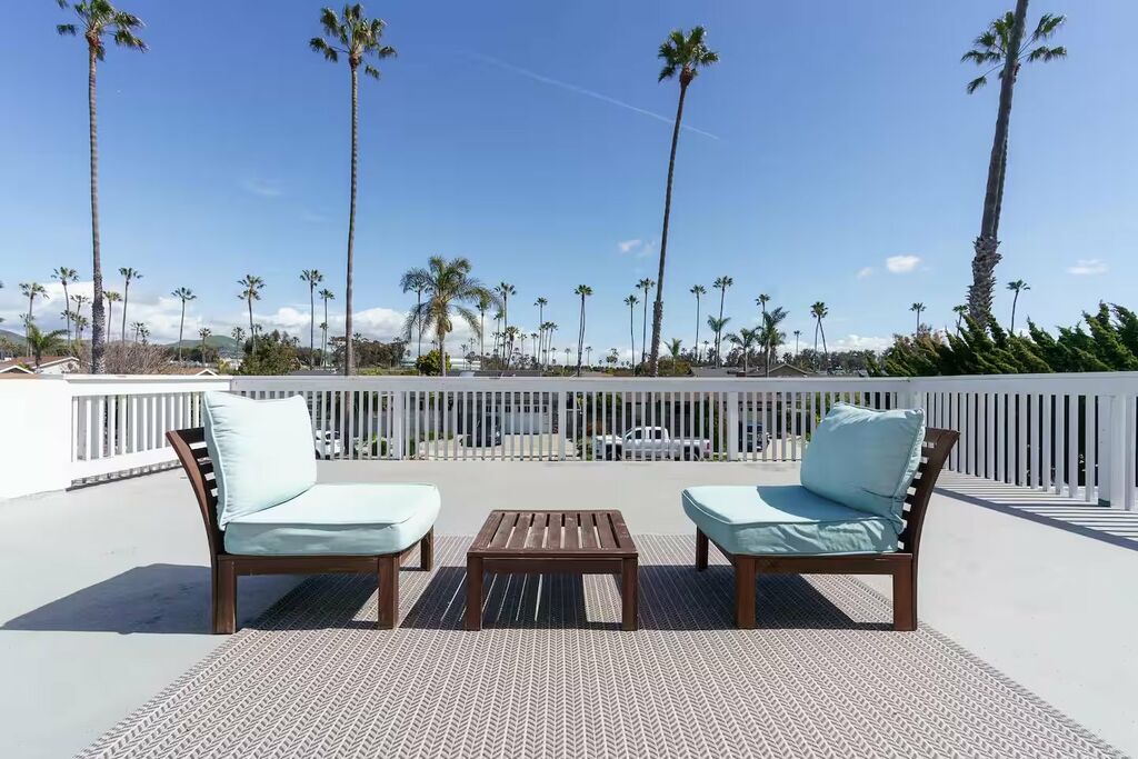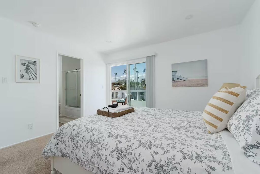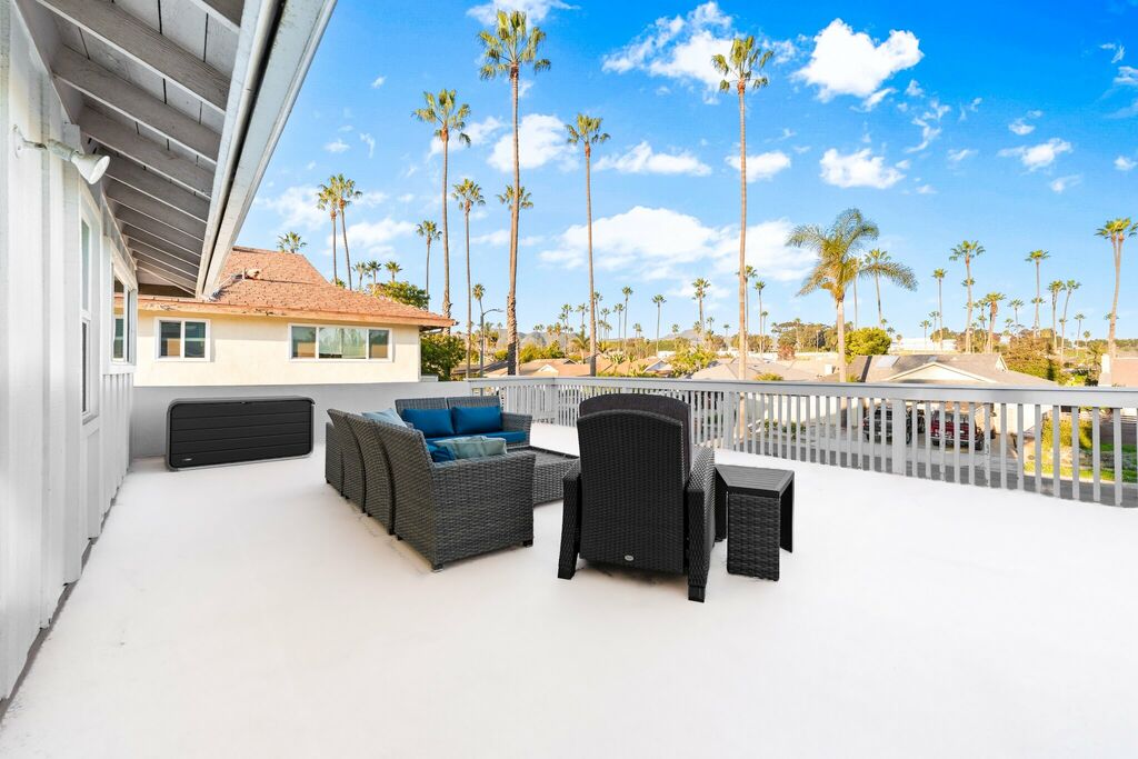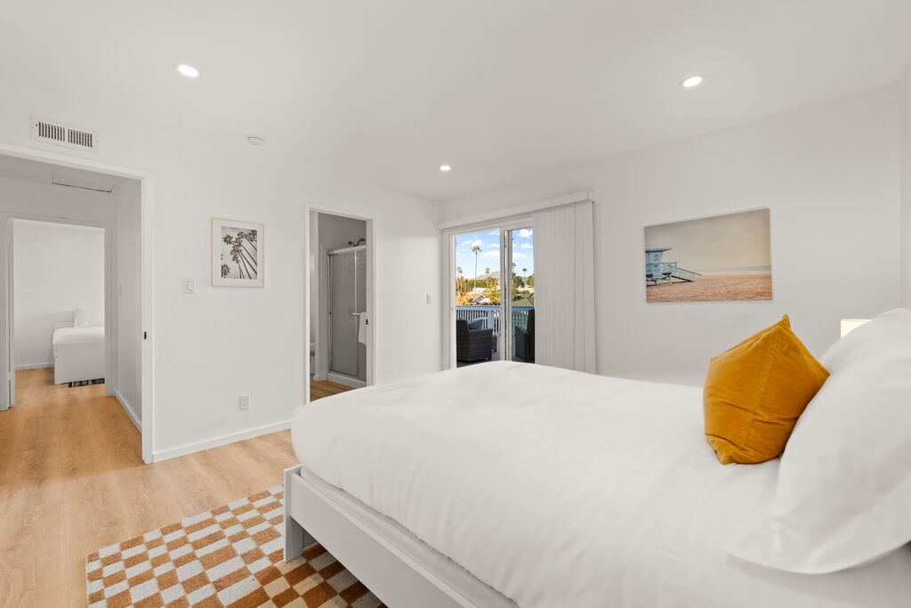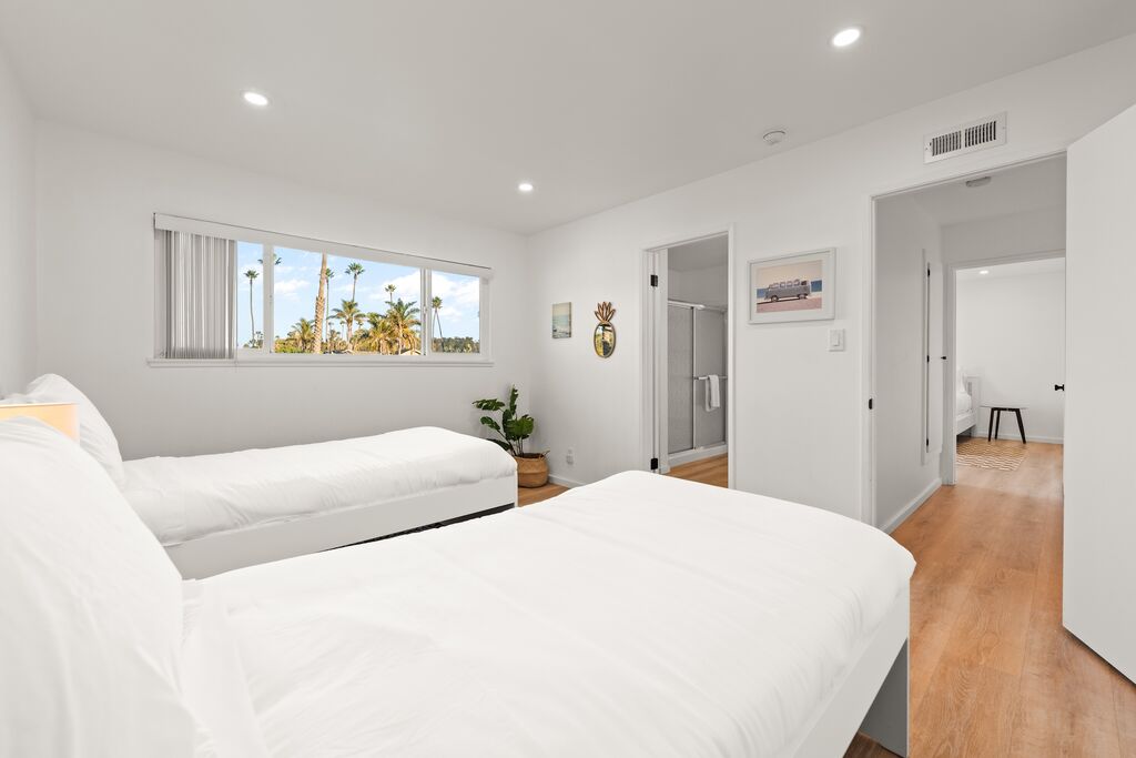Upstairs, two restful bedrooms wait beneath the palms, connected by a shared “Jack and Jill” bath. Each room offers a calm retreat after a day spent biking the coast, wandering local shops, or simply soaking up the sun. Step onto the second-story balcony and you’ll find a small perch above the neighborhood—a quiet spot to sip coffee, feel the breeze, or watch the sky settle into dusk.