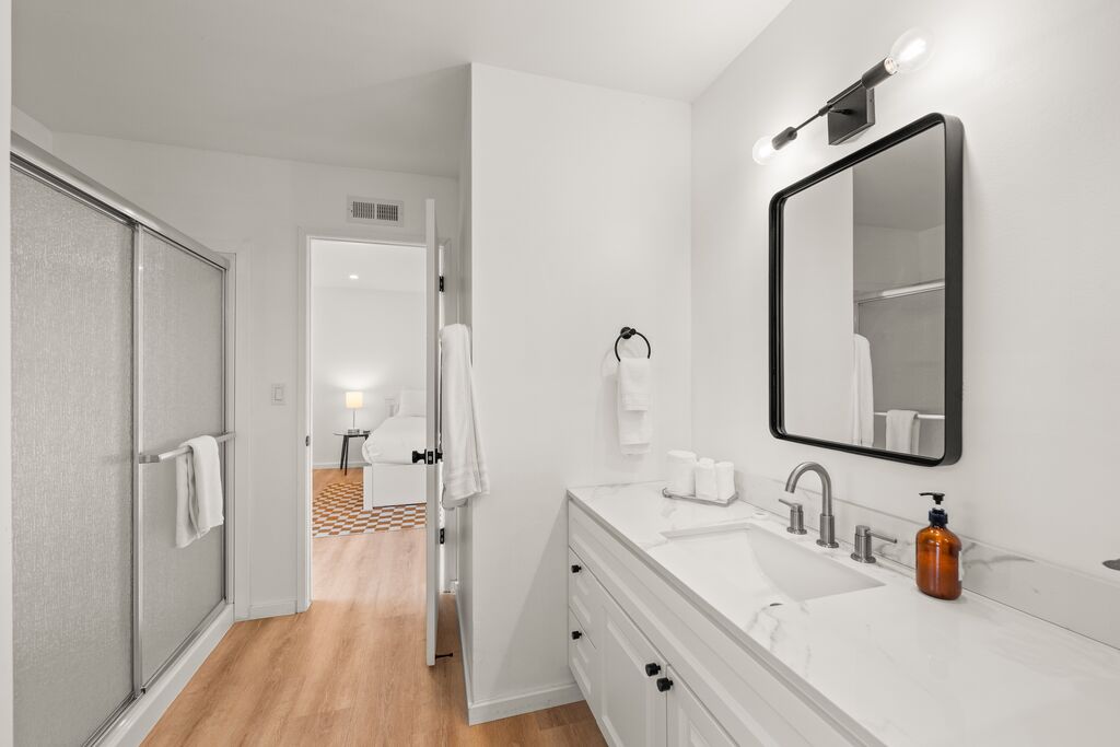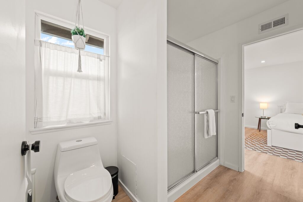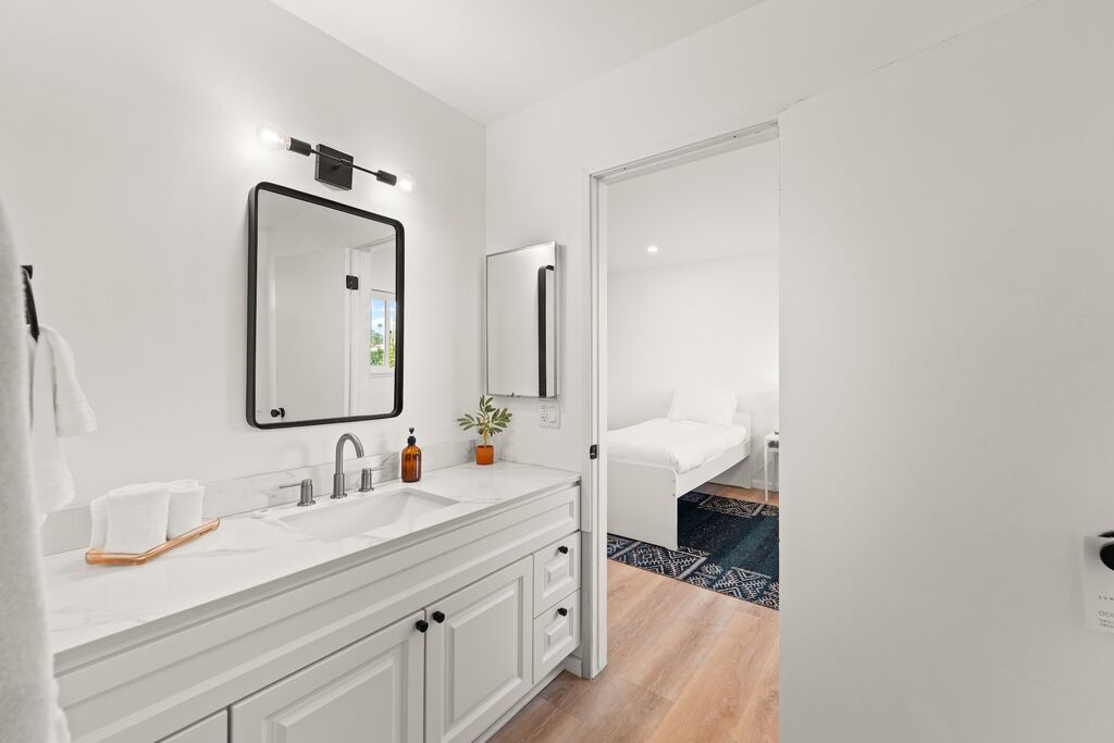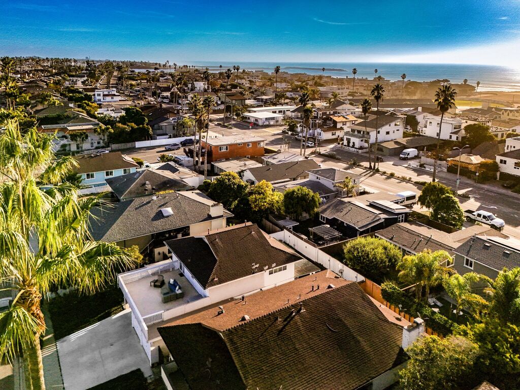 Upstairs, two restful bedrooms wait beneath the palms, connected by a shared “Jack and Jill” bath. Each room offers a calm retreat after a day spent biking the coast, wandering local shops, or simply soaking up the sun. Step onto the second-story balcony and you’ll find a small perch above the neighborhood—a quiet spot to sip coffee, feel the breeze, or watch the sky settle into dusk.
