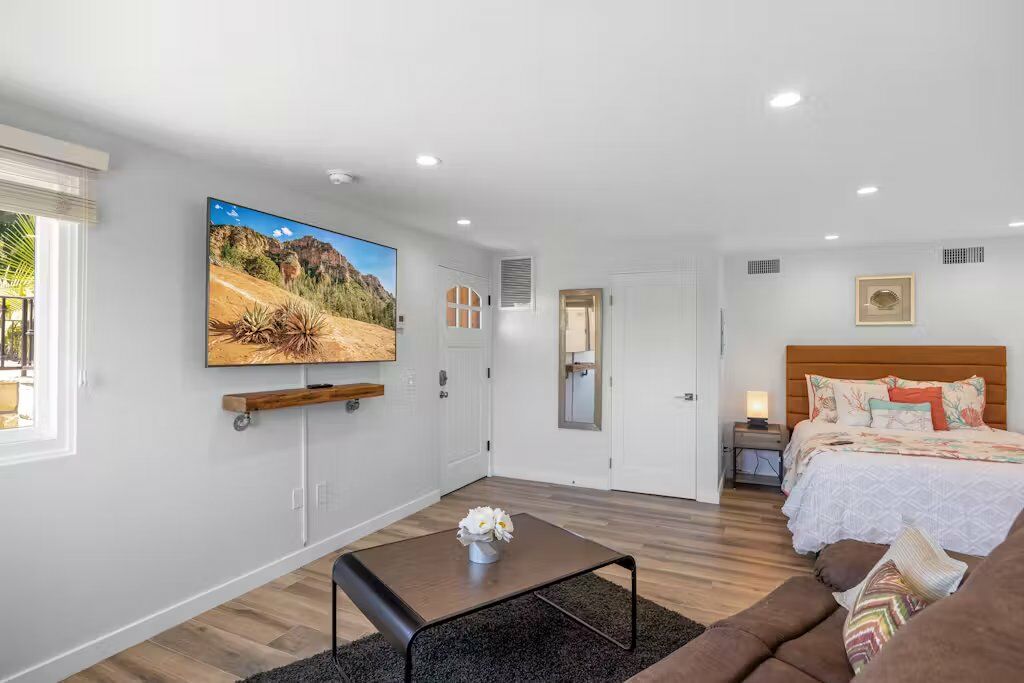 The charm of Ventura comes alive in this cozy studio retreat. The moment you step inside, you’re greeted by a space that feels both intimate and expansive and offers a relaxed ambiance of coastal living. Enjoy sun filled mornings, followed by leisurely strolls to Ventura Beach, just two miles away. In the evening, the private patio offers breathtaking ocean views that perfectly complement a glass of wine by the outdoor fire table during sunset. The private patio with a grill sets the scene for a delightful barbecue with friends or a romantic dinner for two. The sleeping arrangement offers a comfortable queen-sized bed, with a full-size bathroom which includes a walk-in shower.