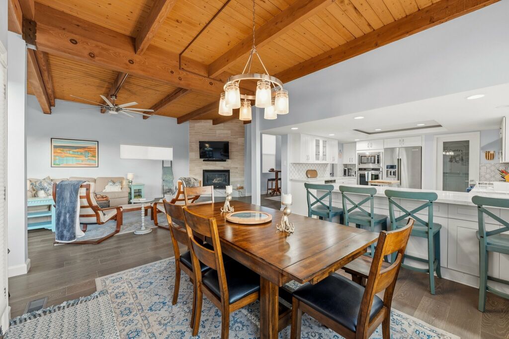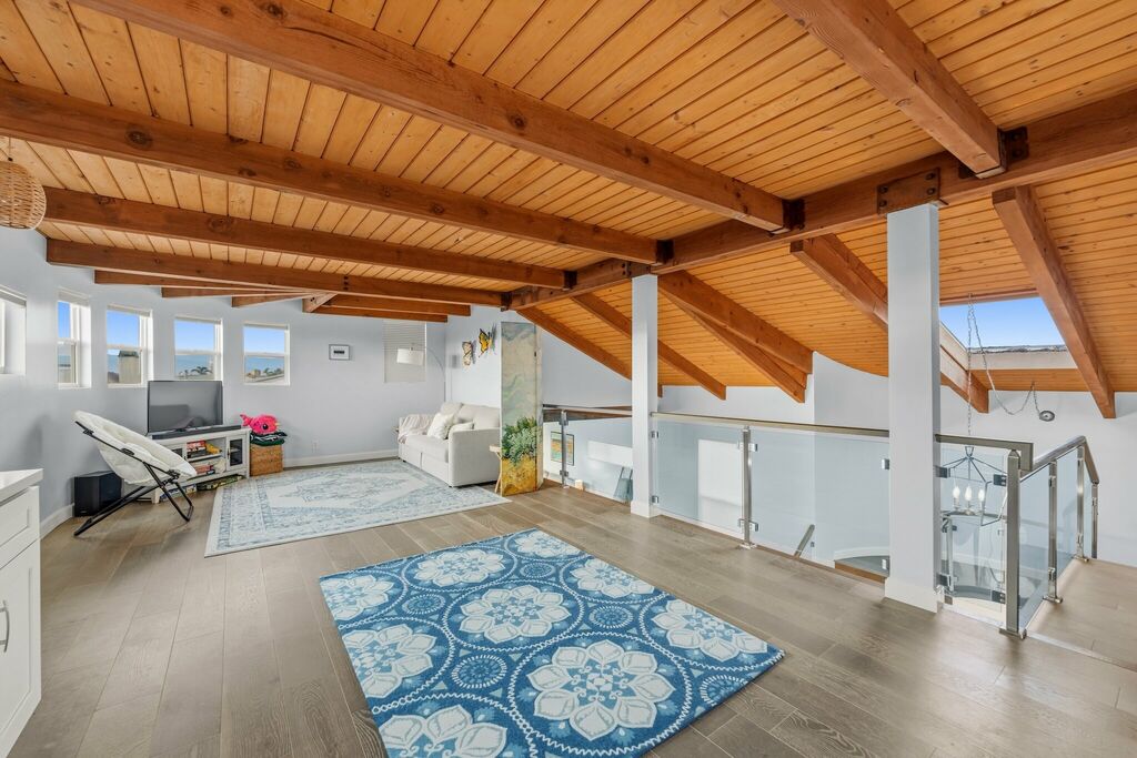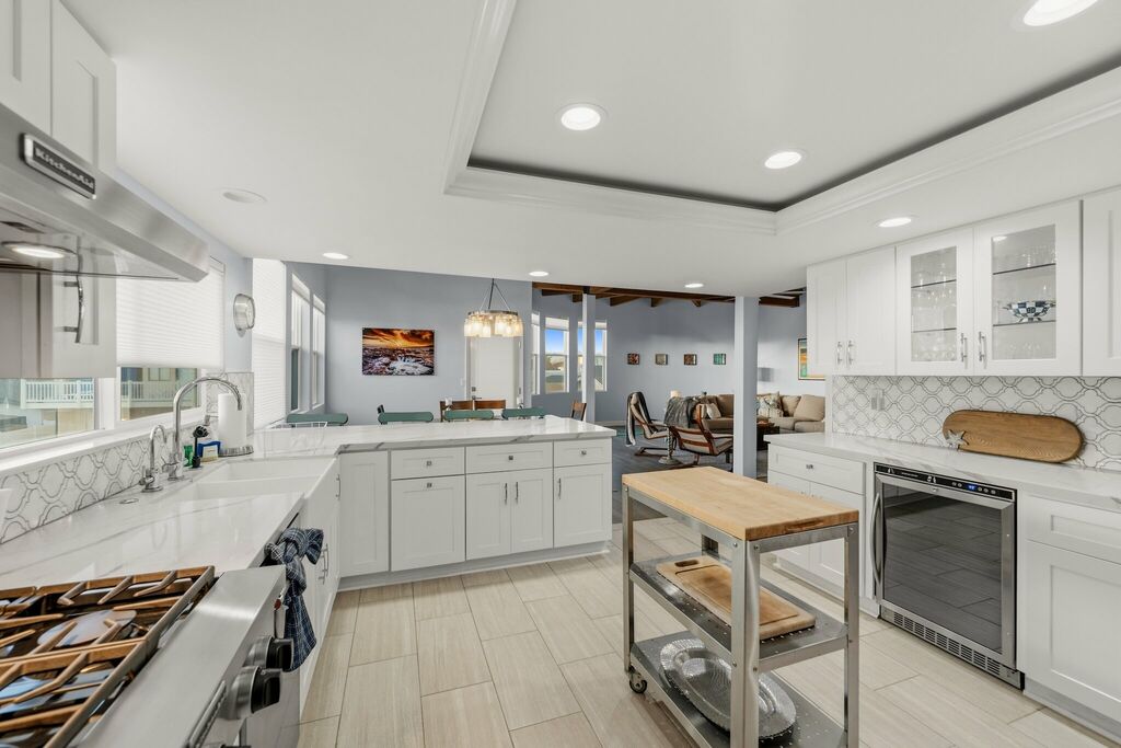 Spanning over 3,100 square feet across a thoughtfully designed tri-level layout, the home is filled with natural light and high-quality finishes throughout. The main living level serves as the heart of the home, featuring a welcoming fireplace, an open-concept layout, and a gourmet kitchen outfitted with quartz countertops, stainless steel appliances, and breakfast bar seating—perfect for daily living and entertaining alike. A spacious deck extends the living area outdoors, offering ocean breezes and a relaxing place to unwind at the end of the day.