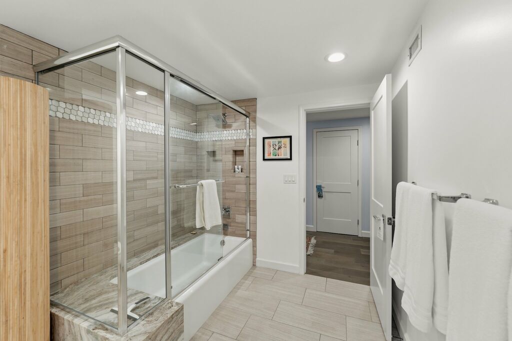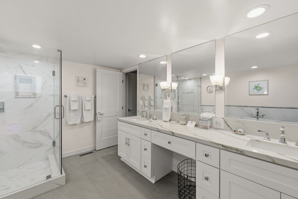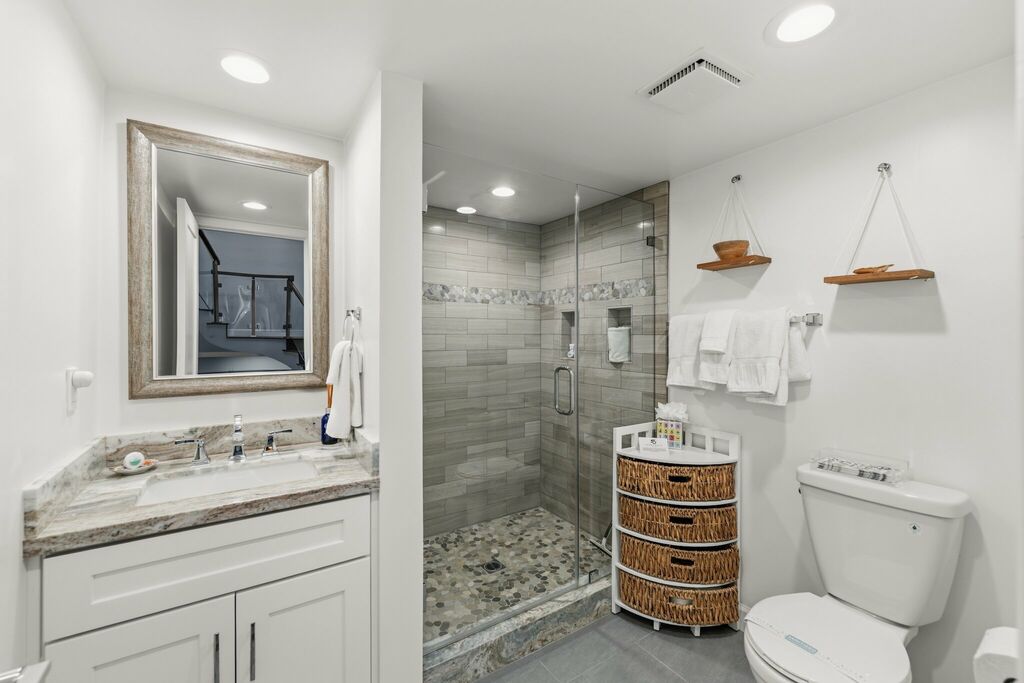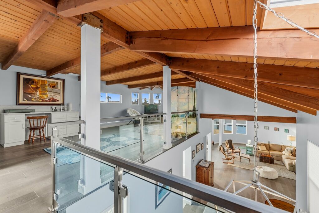 All bedrooms are thoughtfully appointed for comfort, featuring one king bed and three queen beds to ensure a great night’s sleep for every guest, while a queen sleeper sofa provides additional flexibility for guests or visiting family. The master suite includes an ensuite bathroom, and additional bathrooms are conveniently positioned to serve the remaining bedrooms with ease. A bonus office or den on the top level opens to its own ocean-view deck, offering an ideal work-from-home setup or quiet retreat.