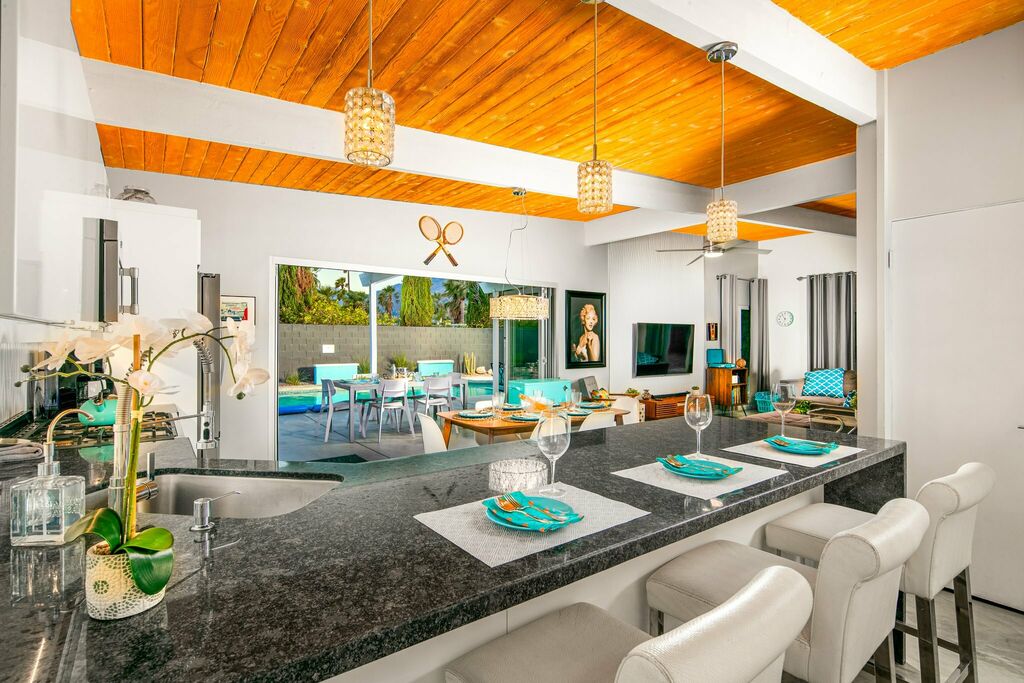 Inside, the modern kitchen is set up for easy meals and poolside snacks, with updated appliances, generous prep space, and bar seating. The open dining and living areas flow naturally to the outdoor deck, encouraging long, unhurried evenings under the sky.