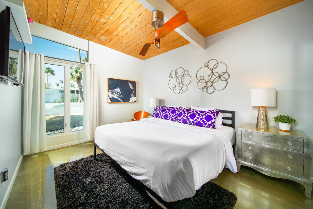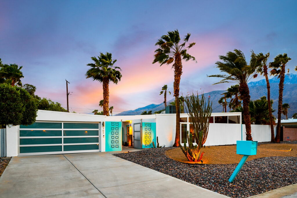 Surrounded by mountain views and designed for seamless indoor-outdoor living, this stylish Palm Springs home offers a peaceful, grounded escape just minutes from downtown. With clean lines, high ceilings, upper accent windows, and a striking butterfly roof, the home blends iconic mid-century style with thoughtful modern updates.