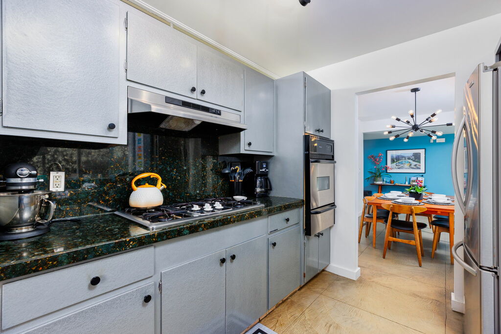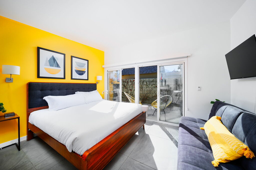 Each bedroom features a king-sized bed with TV and an exit to outdoor seating space, and the living area features a work space and a well-stocked, galley-style kitchen and bar area -- featuring stainless steel appliances and generous cabinet space.