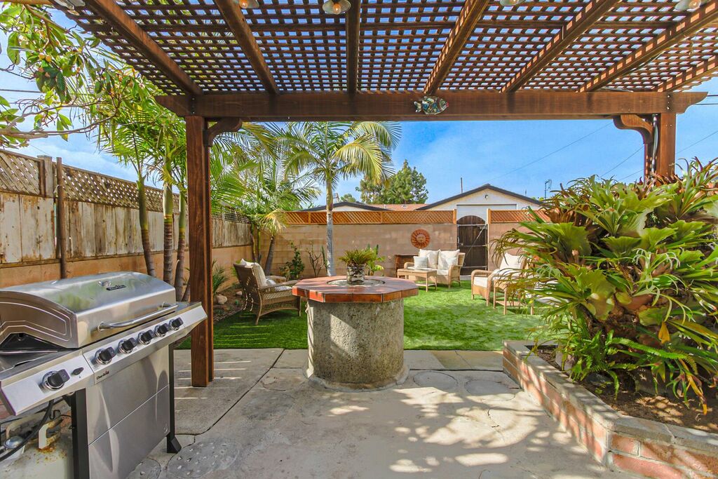 Outdoor living is a standout feature, with both front and backyard spaces designed for gathering and relaxation. Enjoy outdoor dining, firepit evenings, and BBQ cookouts in the oasis-inspired backyard, complete with a pergola and café lighting that sets the mood for memorable nights under the stars. Ample parking, including garage space and off-street or RV parking, makes arrivals and departures easy for larger groups. This pet-friendly home welcomes up to two dogs, making it an excellent option for travelers bringing along four-legged family members.