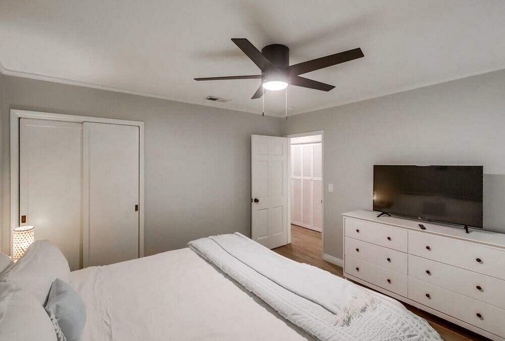 Sleeping accommodations are flexible and well-suited for families or group trips. The home includes three king bedrooms, one of which is a detached bedroom located just steps from the back door of the main house, offering extra privacy but no attached bathroom. A studio-style queen bedroom sits adjacent to one of the living rooms in an open floor plan with a closet. Three additional sleeper sofas—two in the east living room and one in the south living room—allow the home to sleep up to twelve guests total, with eight in beds and four on sleeper sofas.