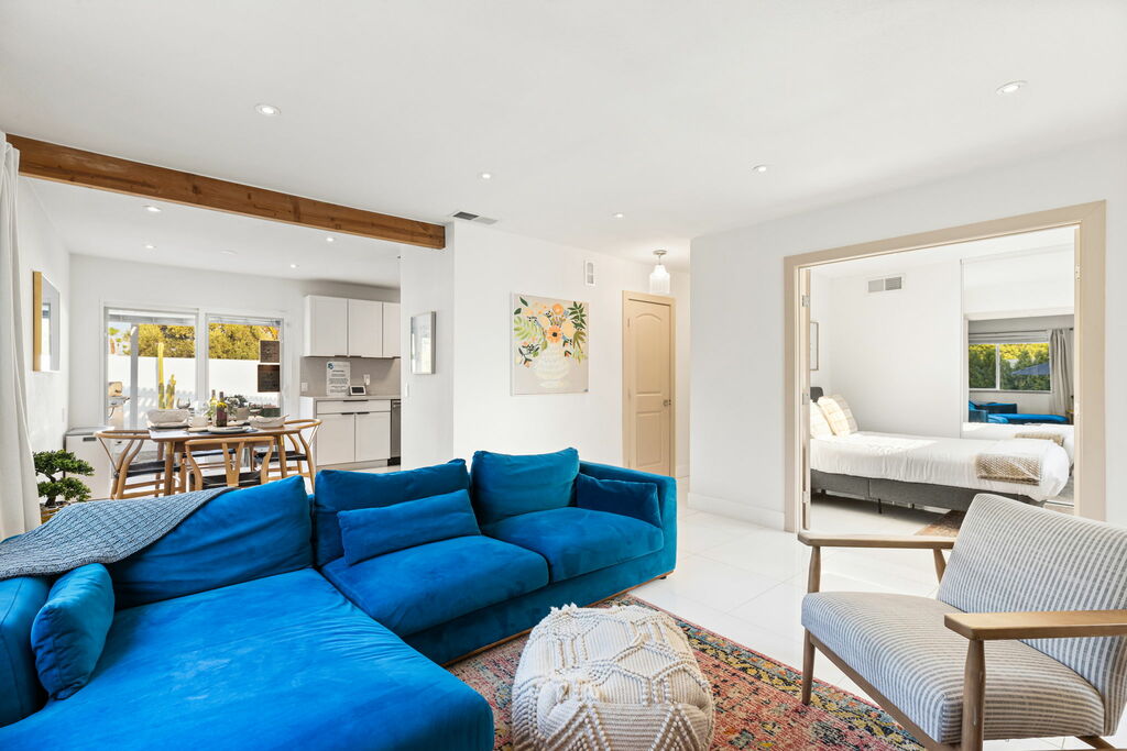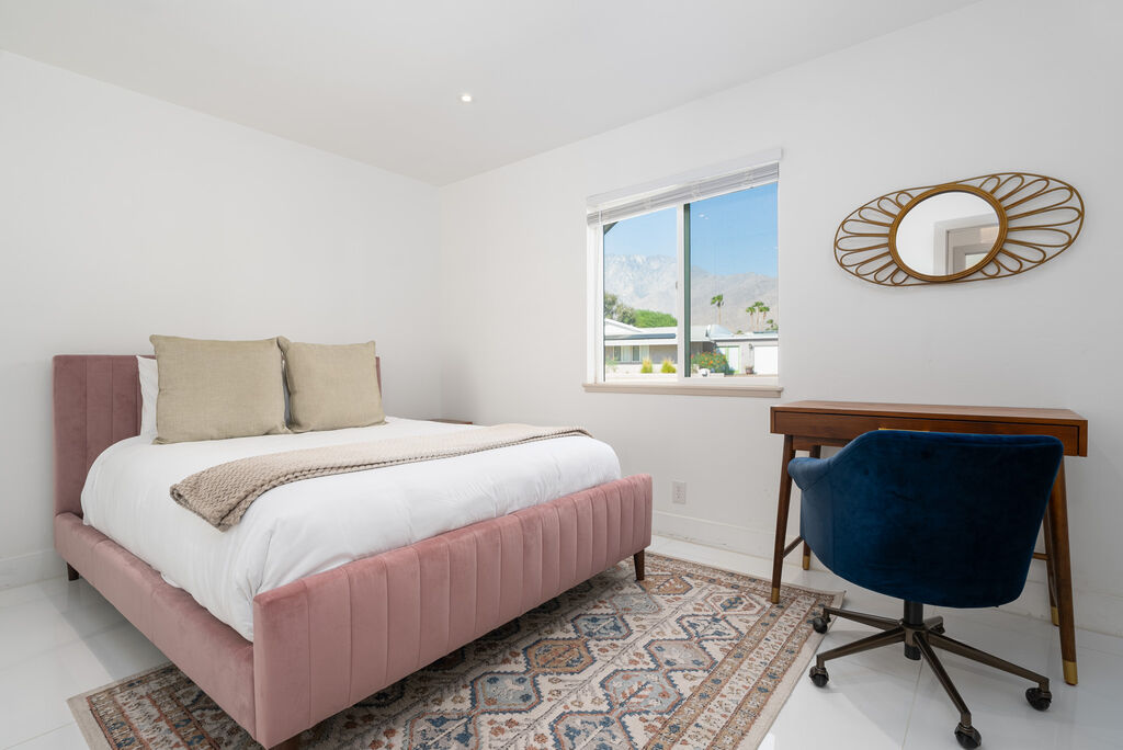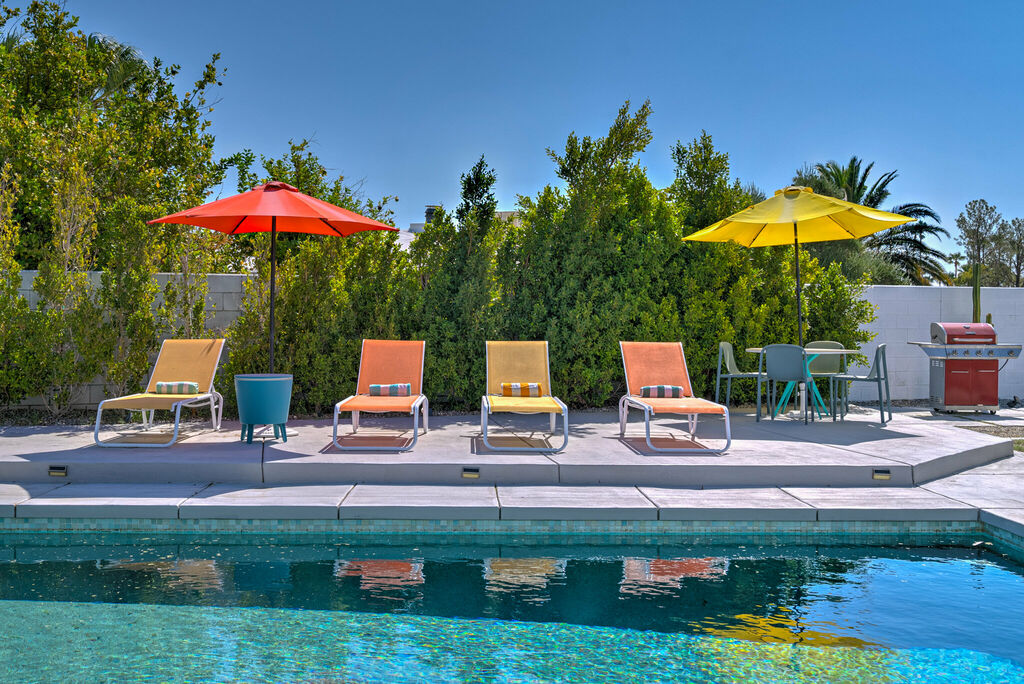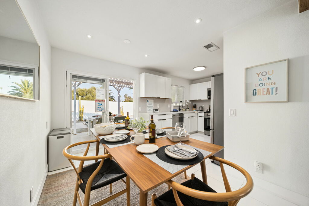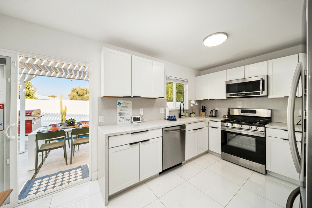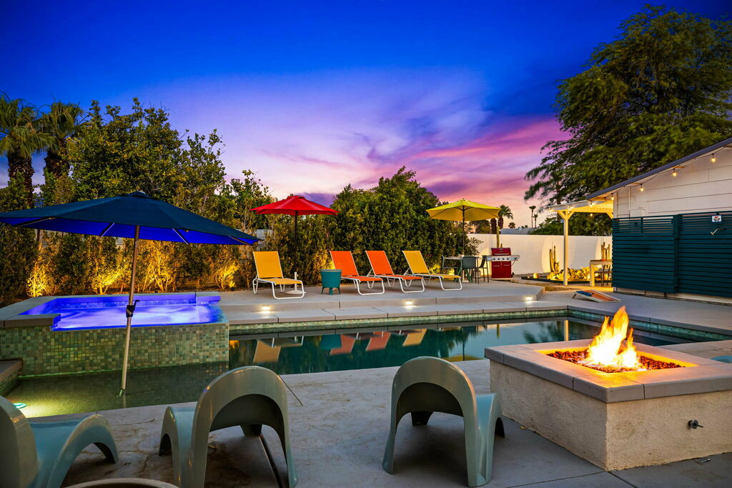 This stylish 3-bedroom, 2-bathroom layout provides the perfect blend of privacy and shared spaces for you and your group to enjoy. Whip up culinary delights in the fully stocked kitchen, or head outside to the expansive wrap-around backyard, where a newly installed pebble-bottom pool, inviting hot tub, and built-in fire pit await. Dine al fresco under the covered patio, fire up the BBQ grill, and savor the desert breeze as you bask in the beauty of your surroundings.