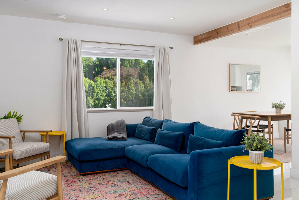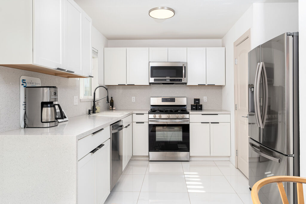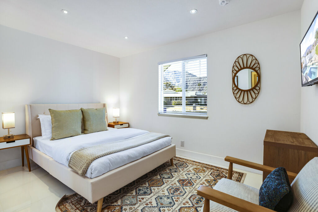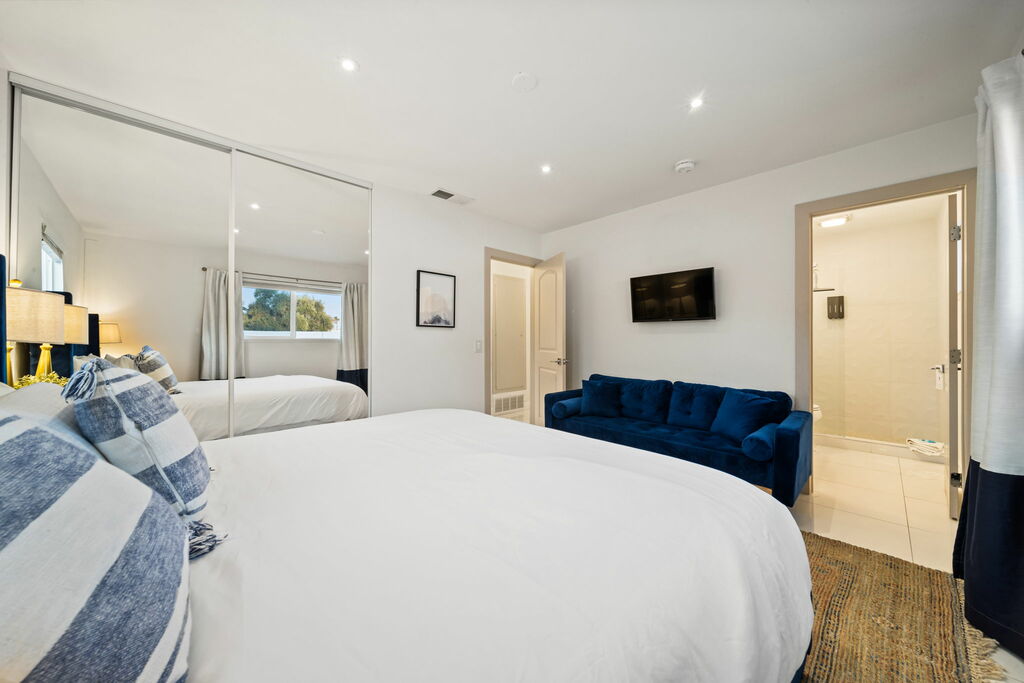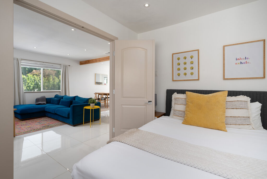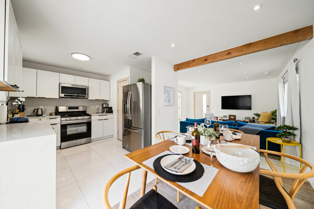 This stylish 3-bedroom, 2-bathroom layout provides the perfect blend of privacy and shared spaces for you and your group to enjoy. Whip up culinary delights in the fully stocked kitchen, or head outside to the expansive wrap-around backyard, where a newly installed pebble-bottom pool, inviting hot tub, and built-in fire pit await. Dine al fresco under the covered patio, fire up the BBQ grill, and savor the desert breeze as you bask in the beauty of your surroundings.