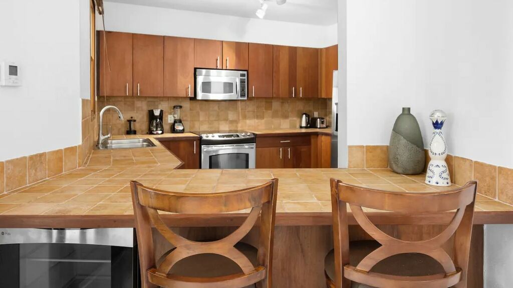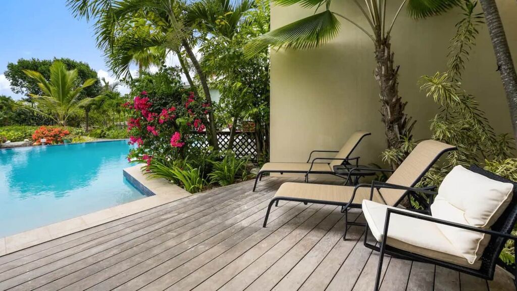 A private deck area, accessible from the main living space, offers a charming outdoor oasis. Here, you can indulge in outdoor dining, lounge in comfortable seating, and enjoy direct access to the refreshing pool. A grill completes the setup, providing the ideal spot for culinary adventures.