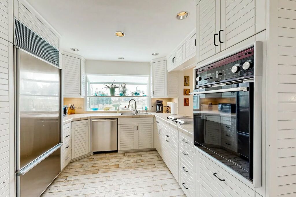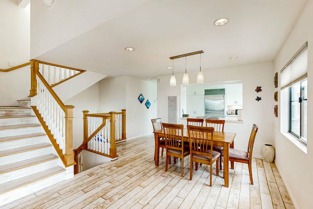 Inside, the open-concept living space on the second floor features whitewashed wood floors, vaulted beam ceilings, and large windows that let in the ocean breeze. The living room has a 50" TV, gas fireplace, and plenty of cozy seating—perfect for winding down after a day outdoors. The well-equipped kitchen with a Sub-Zero fridge and gas stove makes meal prep a breeze, whether it’s a quick breakfast before the beach or a family dinner.