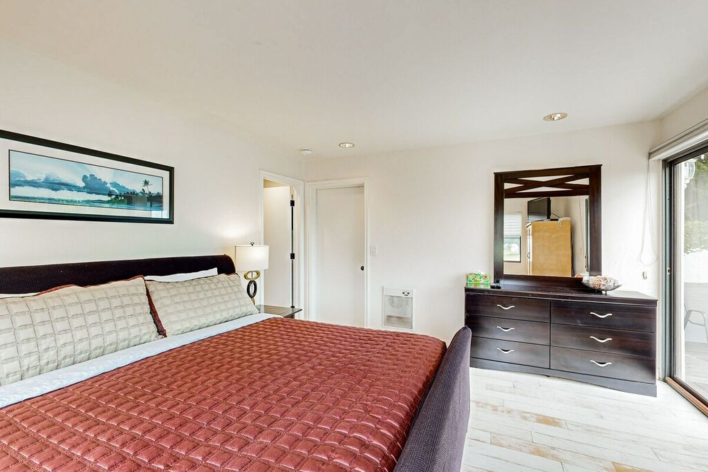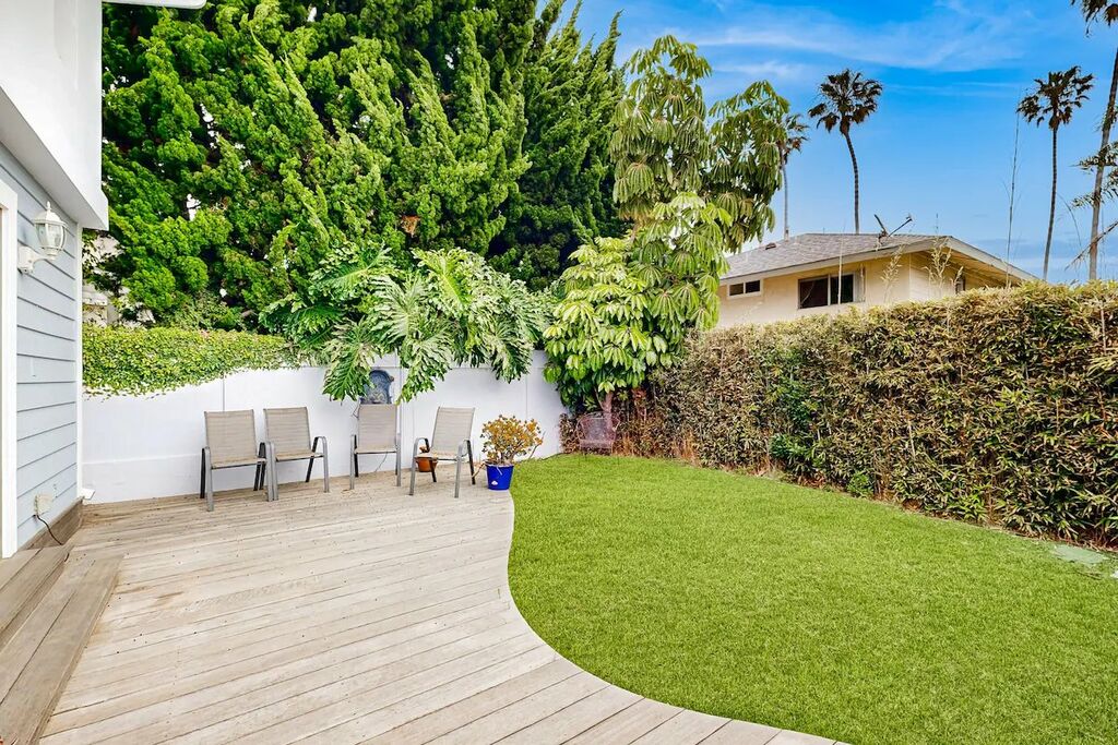 Out back, you’ll find a fenced yard with grassy space for kids to play, a bistro table for morning coffee, and an outdoor shower for rinsing off after the sand.