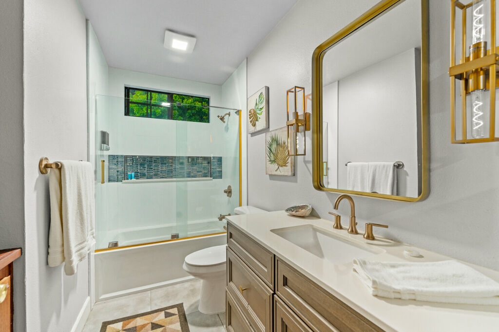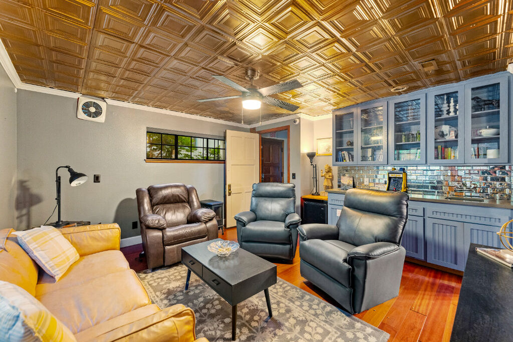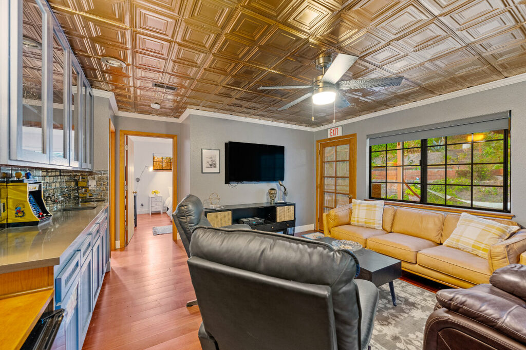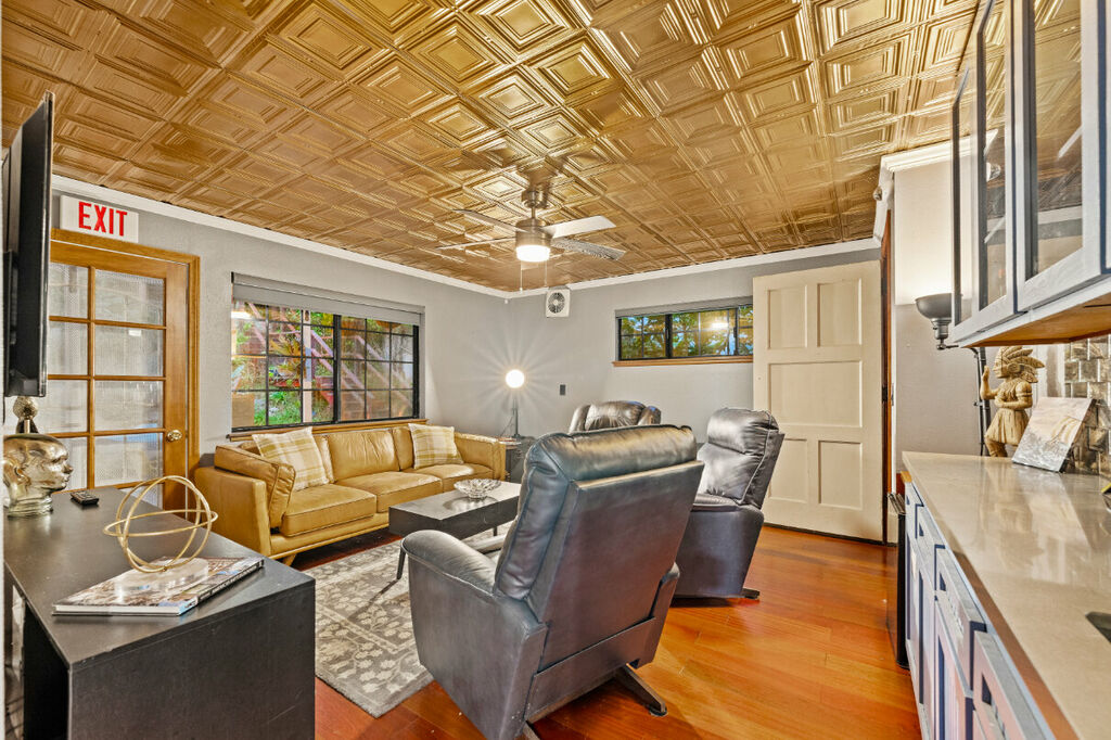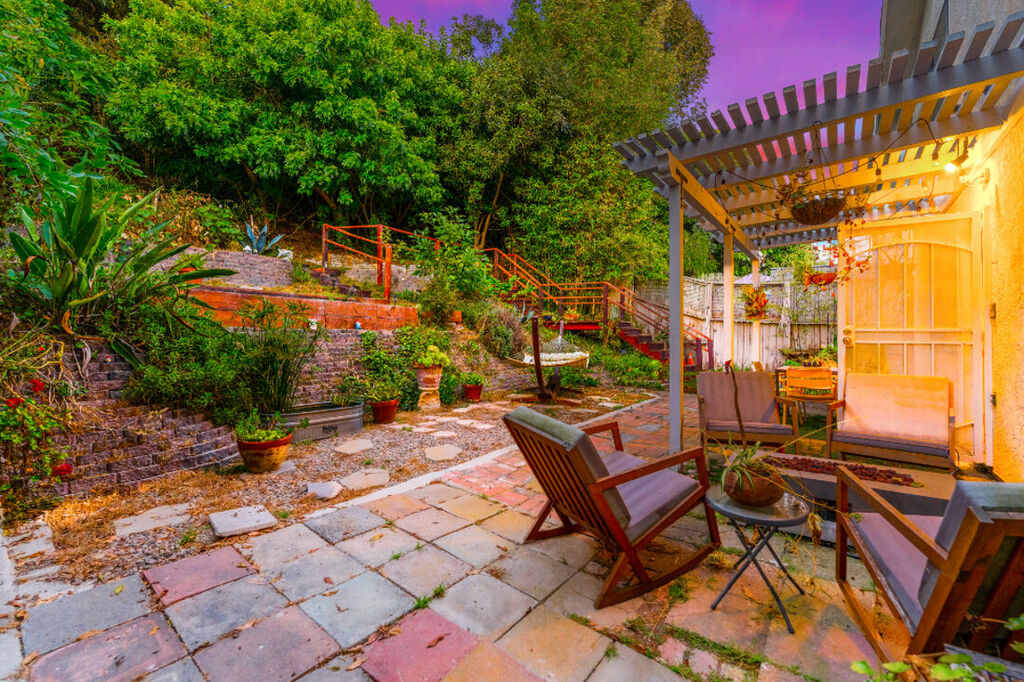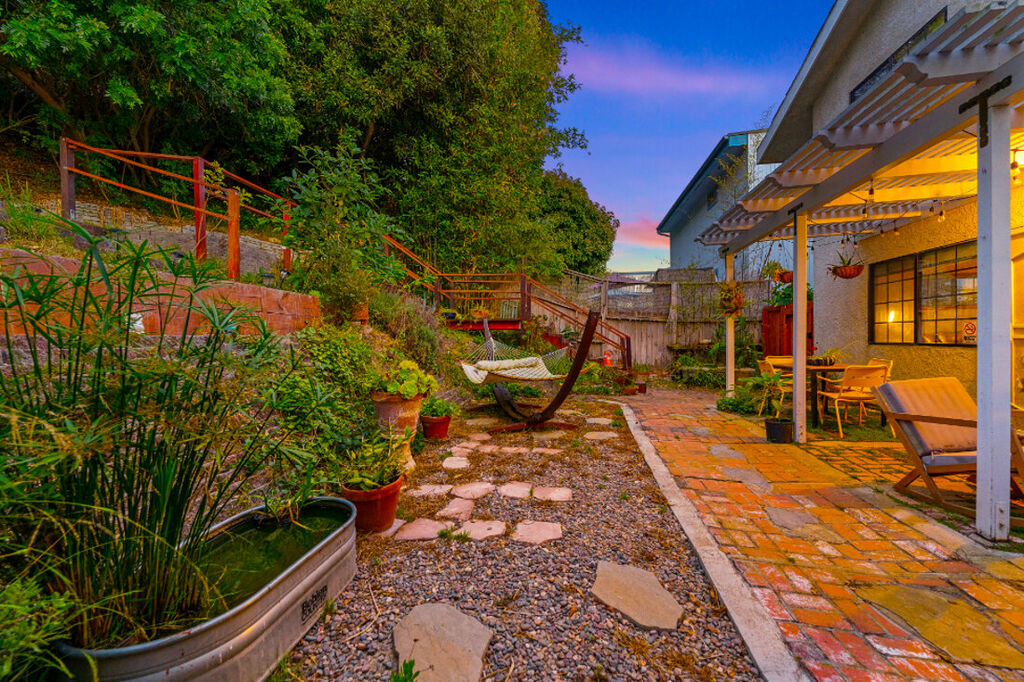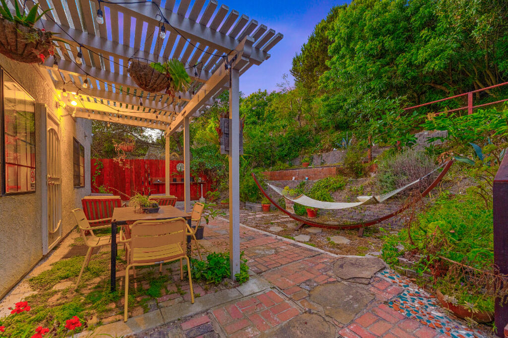 The backyard is a true sanctuary. With no neighbors behind the home, you can relish the privacy and tranquility provided by the large hills that create a picturesque backdrop. The outdoor space is perfect for relaxation and entertainment, featuring a hammock where you can lounge and soak up the sun. The outdoor seating area and unique decor elements make it an ideal spot for morning coffee, evening cocktails, or simply enjoying the serene ambiance.