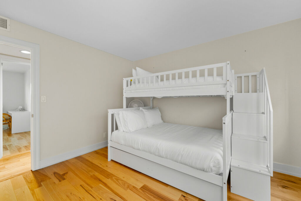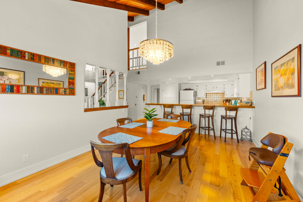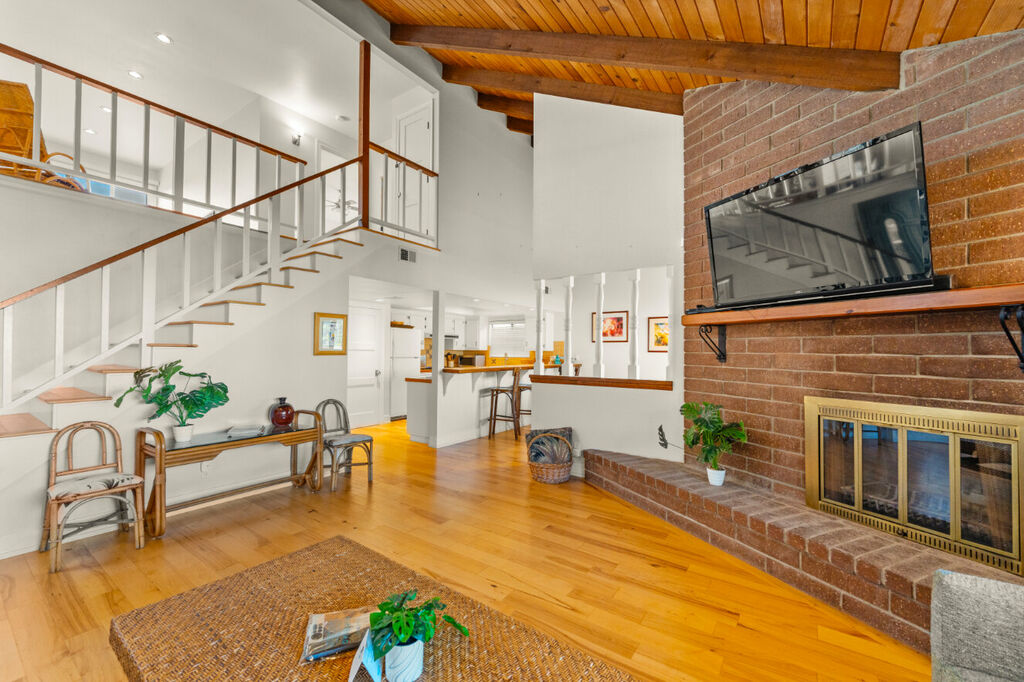 The upper level boasts a chic loft-style design with an open layout, perfect for gathering. The stylish living area flows seamlessly into a fully equipped kitchen and dining space, where you can whip up delicious meals with all the cookware you’ll need throughout your stay. Kick back and relax in the comfortable living room, featuring plush seating and a large flat-screen TV for your entertainment, making it the perfect spot for movie nights or lazy afternoons.