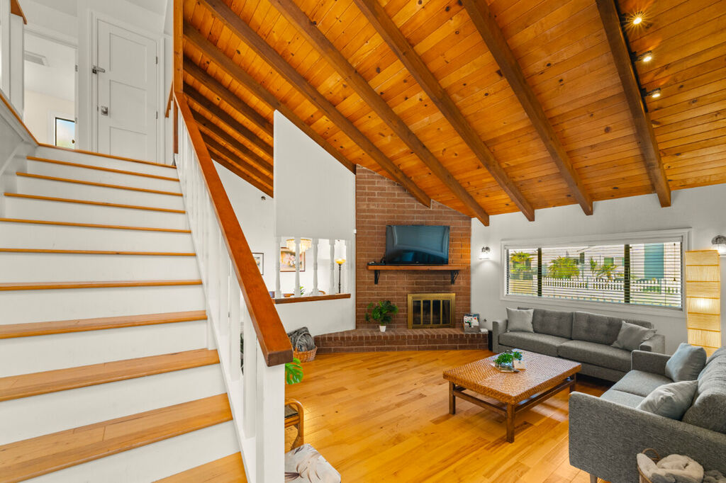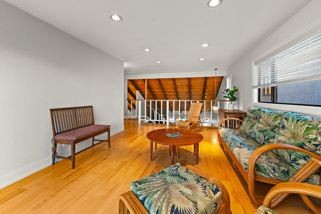 The upper level boasts a chic loft-style design with an open layout, perfect for gathering. The stylish living area flows seamlessly into a fully equipped kitchen and dining space, where you can whip up delicious meals with all the cookware you’ll need throughout your stay. Kick back and relax in the comfortable living room, featuring plush seating and a large flat-screen TV for your entertainment, making it the perfect spot for movie nights or lazy afternoons.