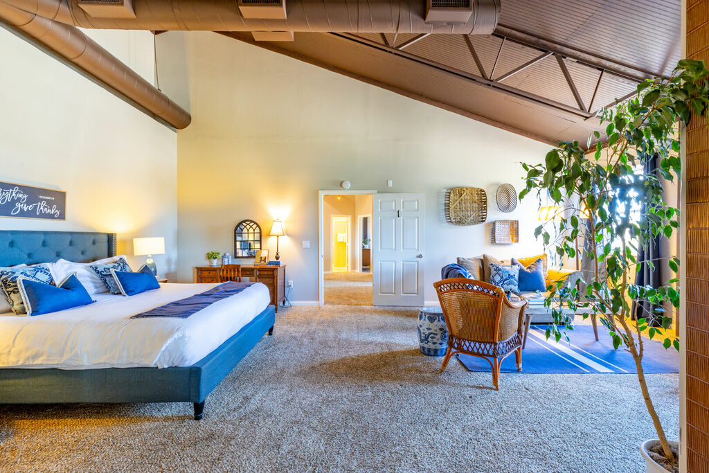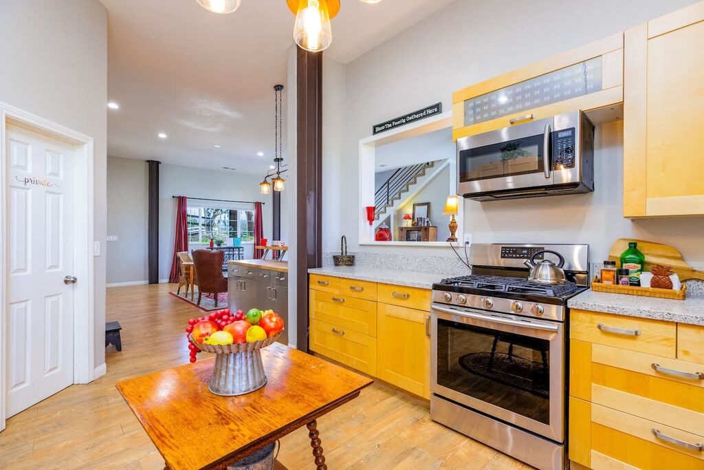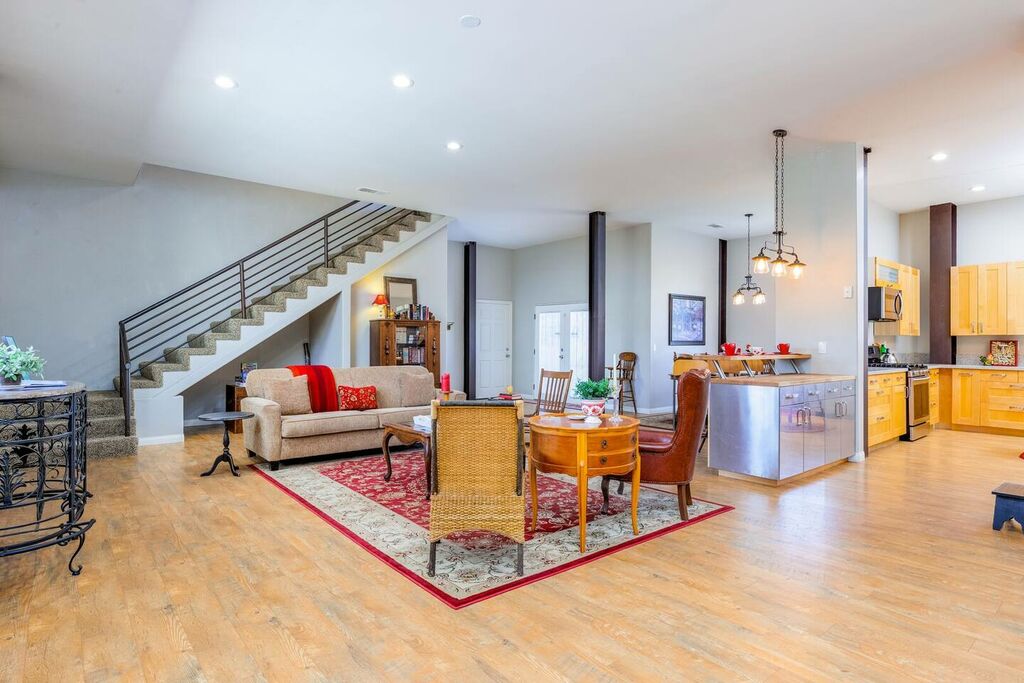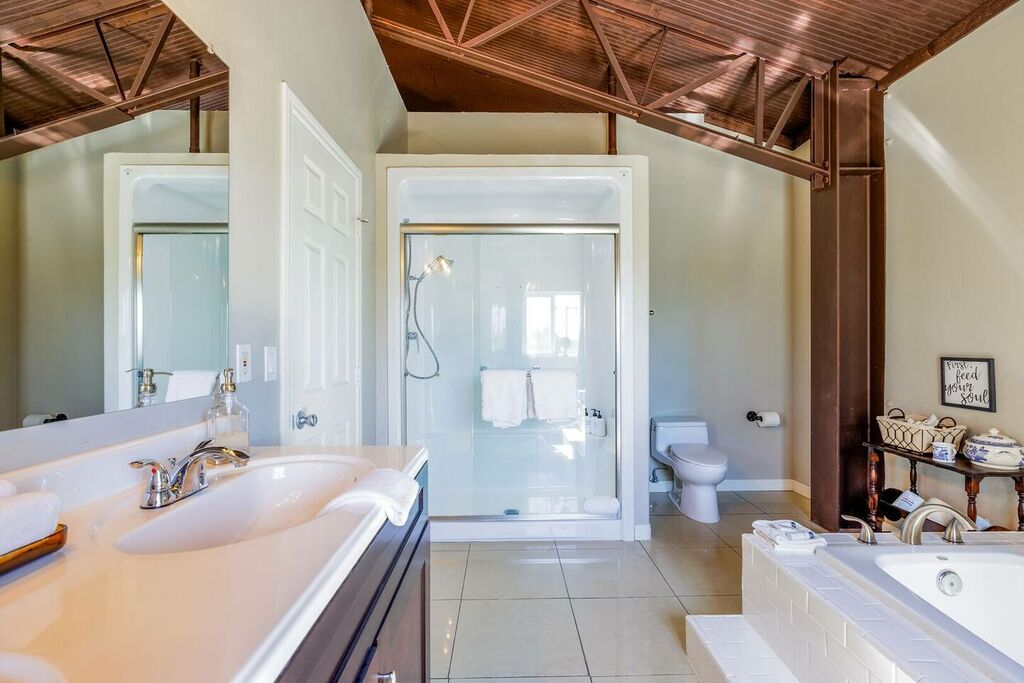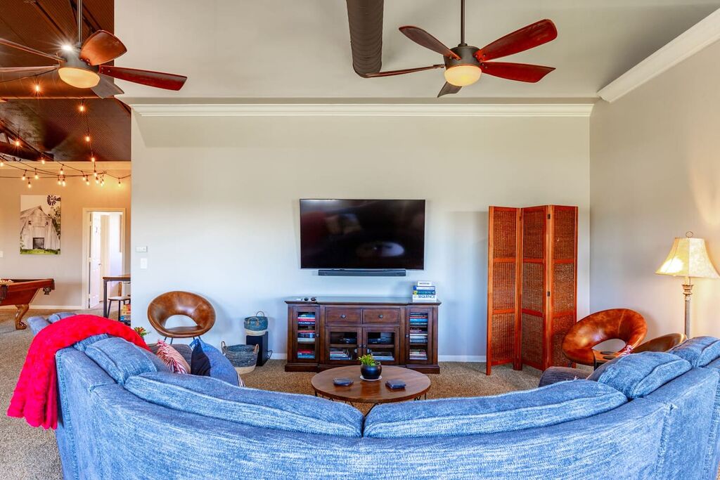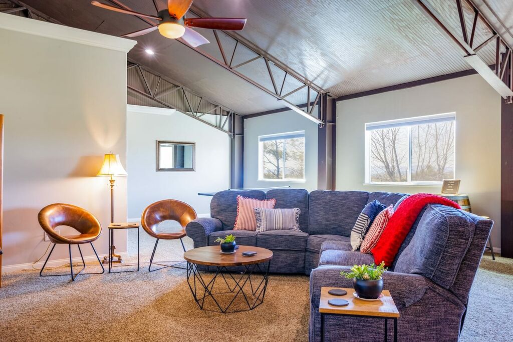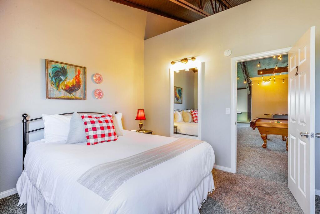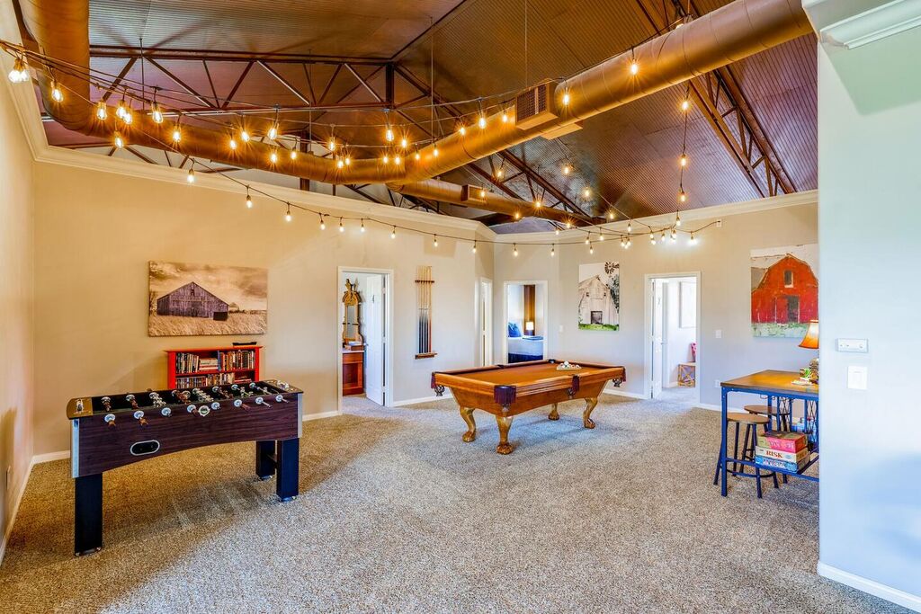 The upstairs is a loft style floor plan with a spacious and open living environment for all the family to congregate and play. Step inside to find a spacious living area with high ceilings and large windows that flood the space with natural light. The comfortable seating provides the perfect place to relax and unwind after a day of exploring the local wineries.