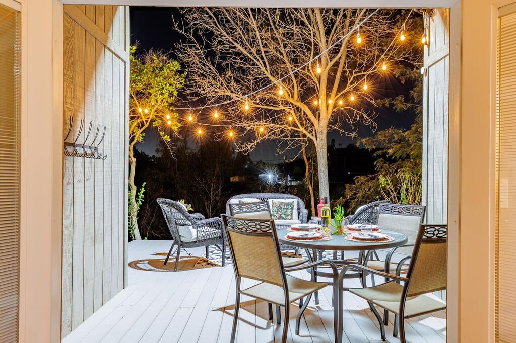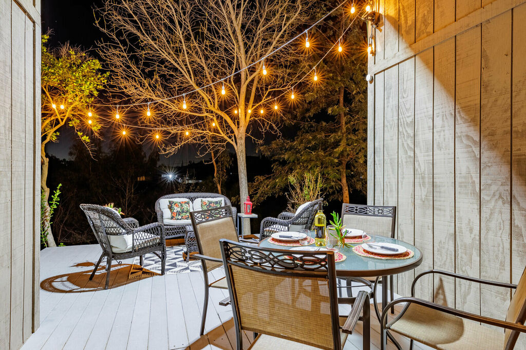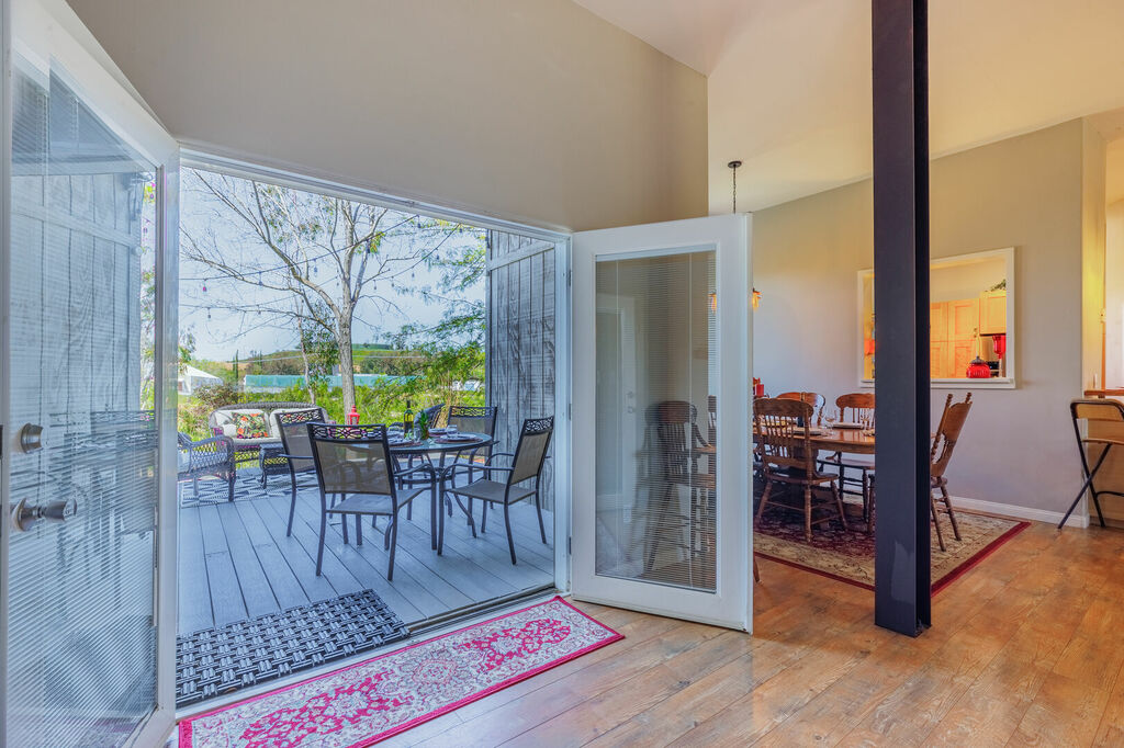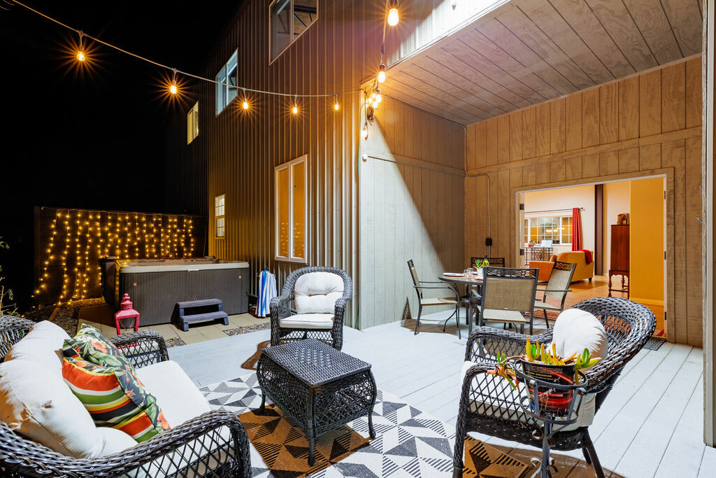 Step outside onto the private deck and take in the stunning views of the surrounding countryside. The outdoor seating area is perfect for sipping your morning coffee or enjoying a glass of wine as the sun sets. The hot tub provides the perfect way to relax and unwind after a day of wine tasting.