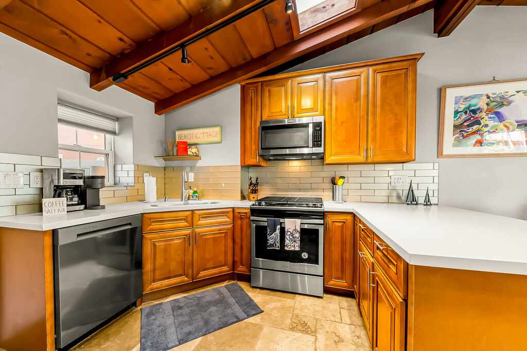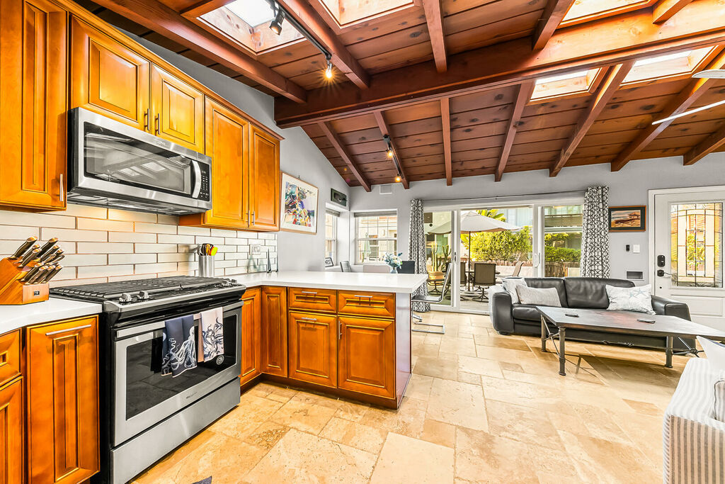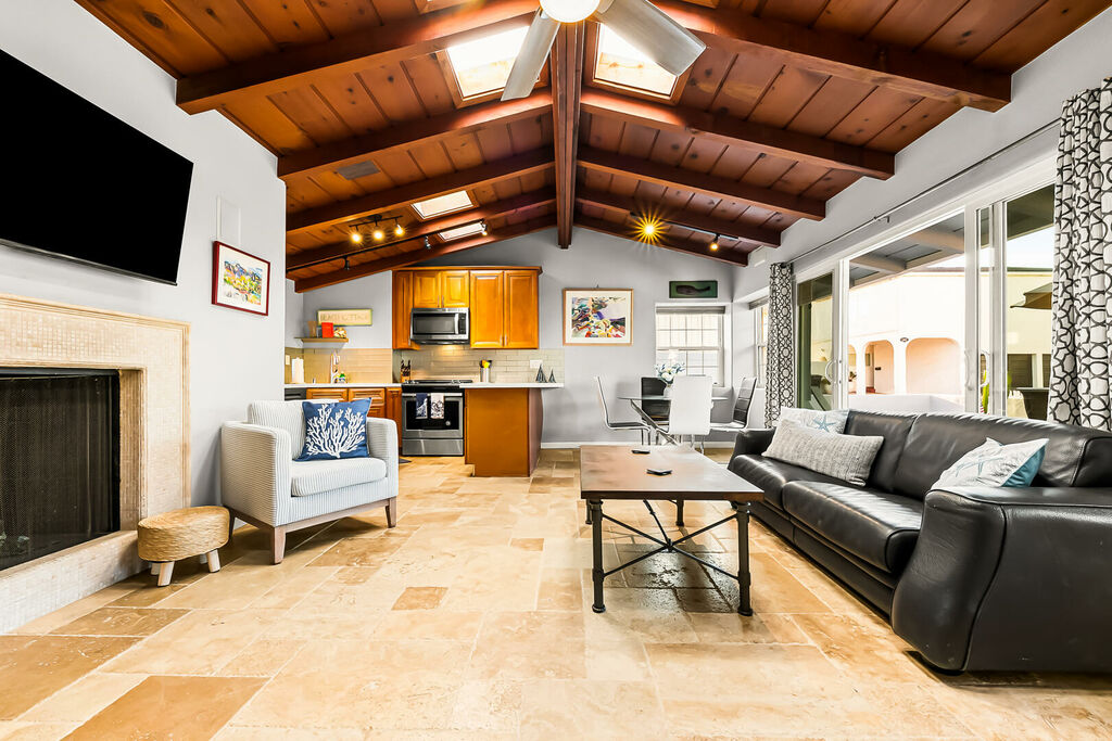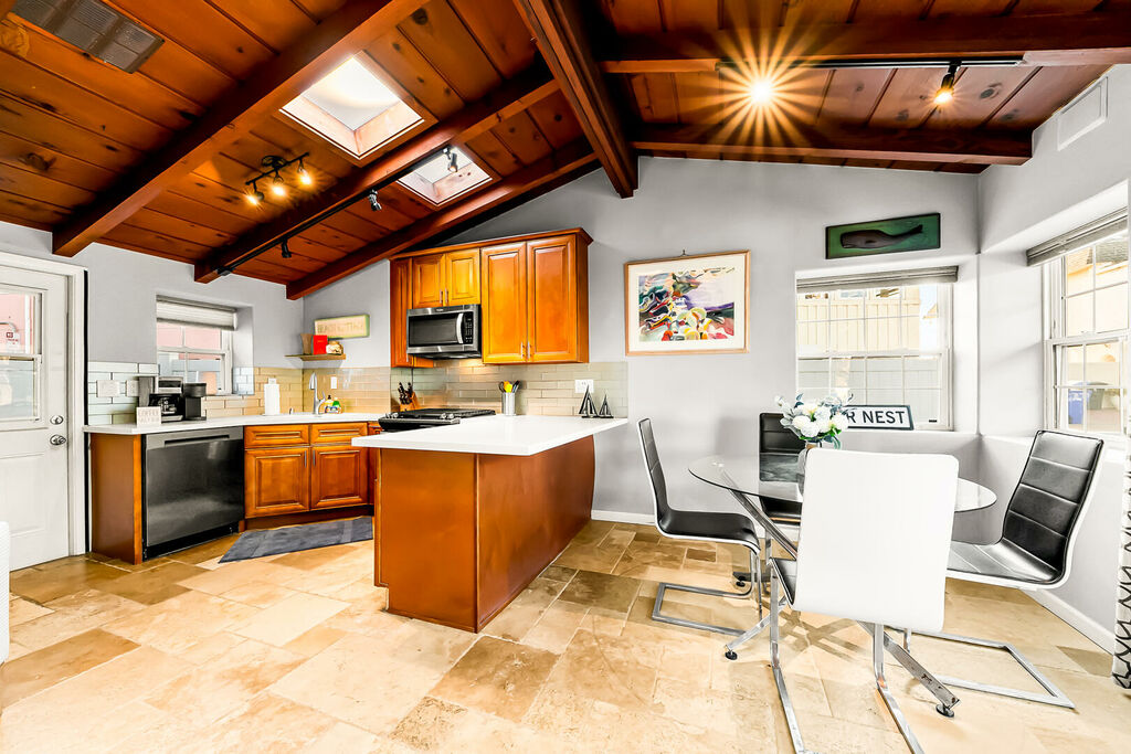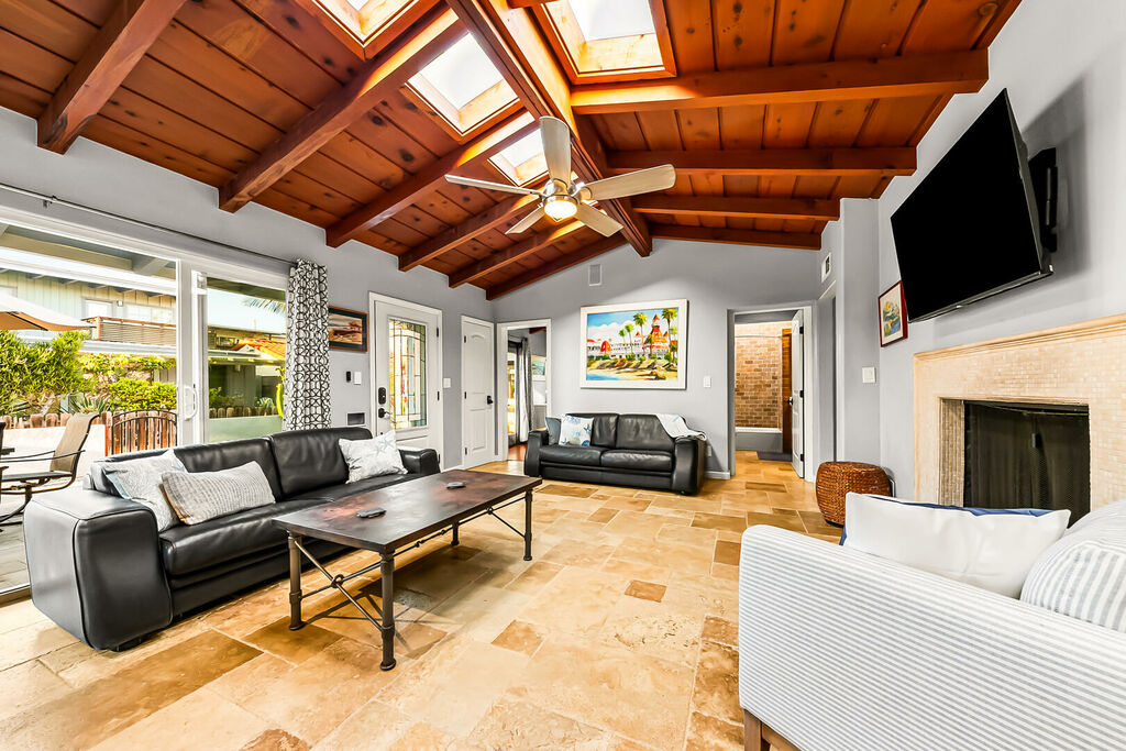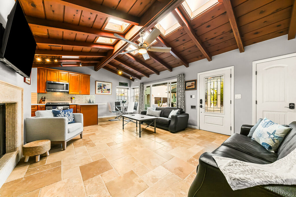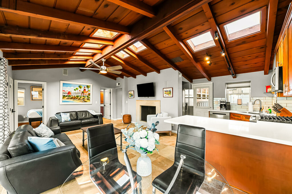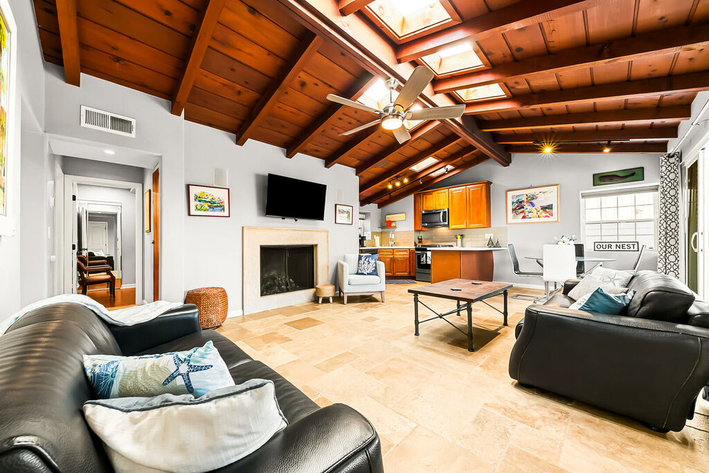 Just steps from the soft sands of South Mission Beach, 'Sea-Battical' is a bright and breezy single-level coastal cottage designed for effortless vacation living. From the moment you walk through the door, vaulted wood-beam ceilings, skylights, and relaxed coastal décor create an airy, sunlit ambiance that instantly puts you in beach mode. The open-concept living area flows seamlessly into a fully updated kitchen and extends out to an expansive front patio, making indoor-outdoor living feel completely natural. Whether you’re enjoying a slow morning coffee, soaking up the afternoon sun, or firing up the grill for an evening BBQ as the sky glows with a classic Southern California sunset, this home captures the easy rhythm of life by the ocean.