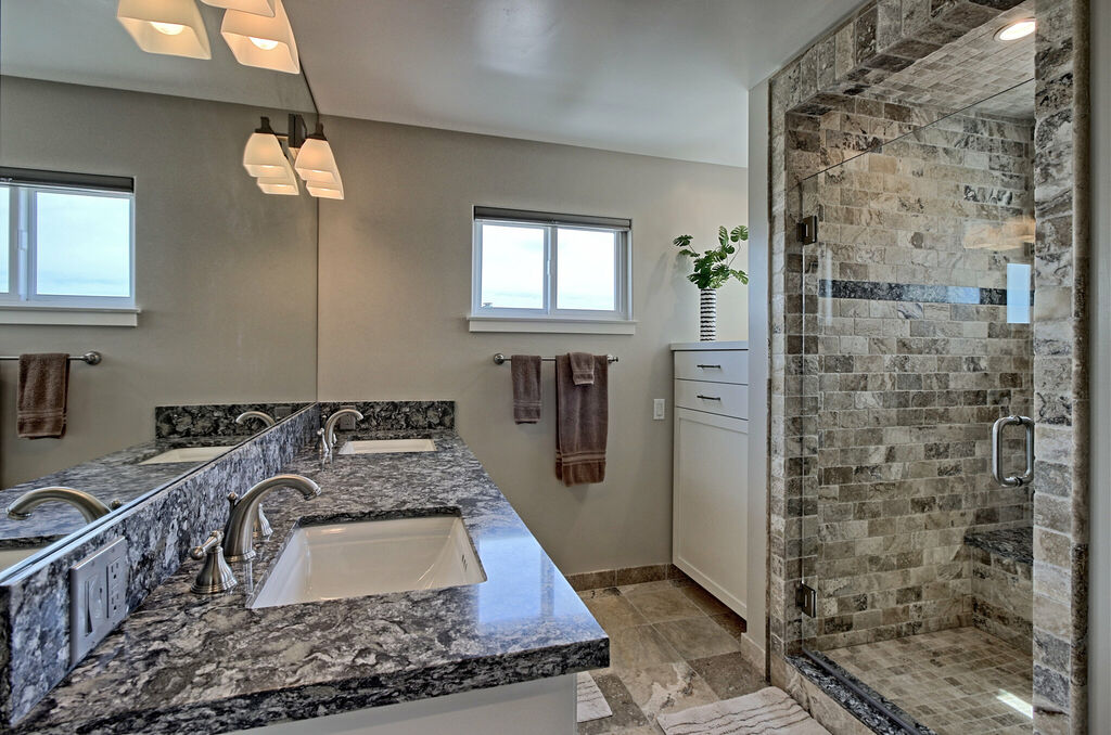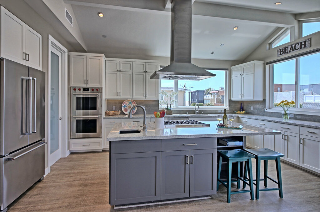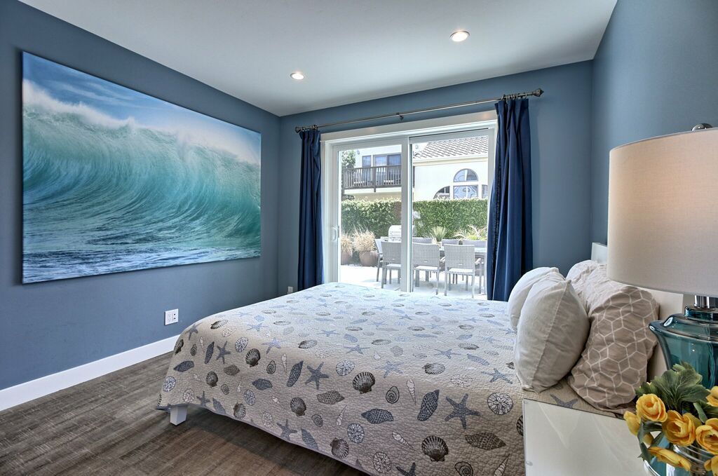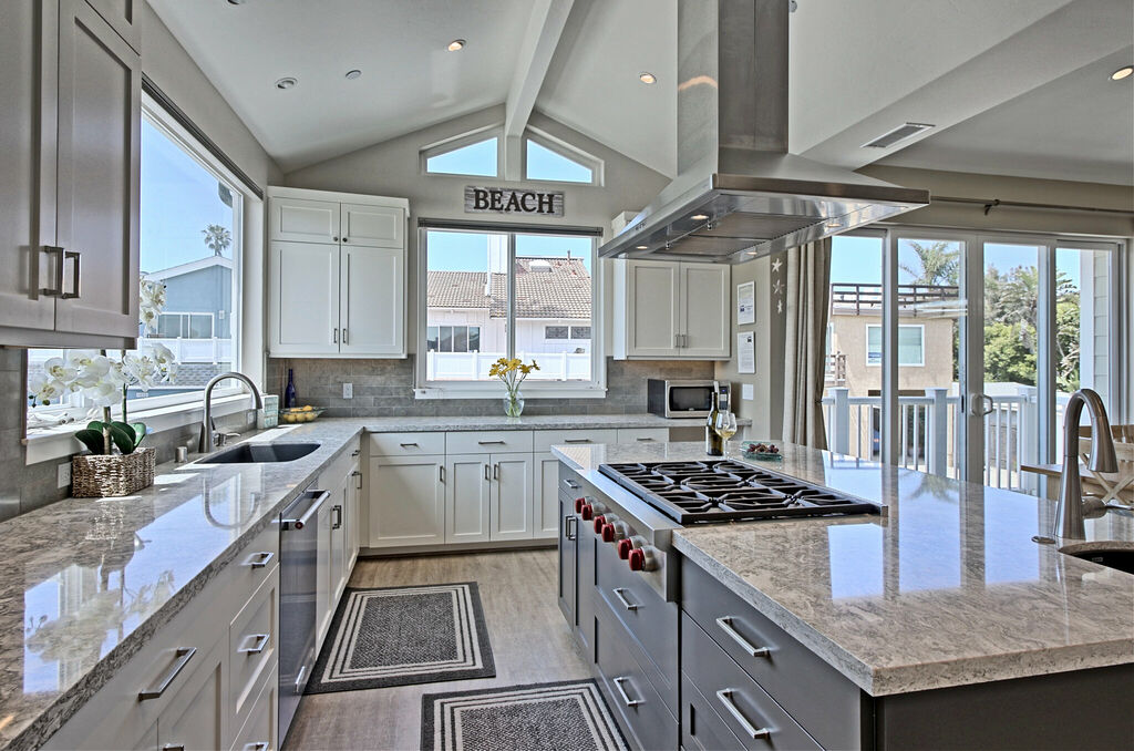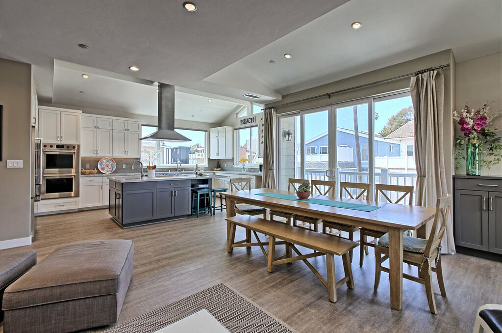 The heart of the home is the open-concept great room, where a sprawling sectional sofa and a 55” HDTV invite you to sink in and relax after a day in the surf. Natural light pours through picture windows, illuminating the gourmet kitchen with Wolf appliances, a large island, and Cambria countertops. Gather around the dining table, which seats twelve, for home-cooked meals or fresh local fare from Ventura’s nearby farmers' markets.