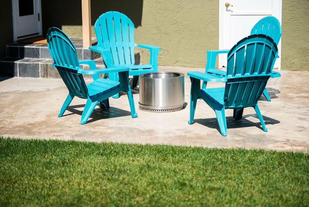 The large private backyard is where families really fall in love with this home. There’s plenty of room for kids to run and play, stretch out on the grass, or enjoy outdoor games like cornhole while adults relax nearby. Sun loungers and a hammock offer a perfect spot for soaking up the coastal sunshine, and the fire pit creates an easy gathering place for s’mores, stories, and winding down together in the evenings.