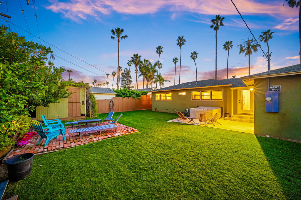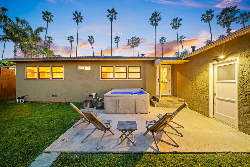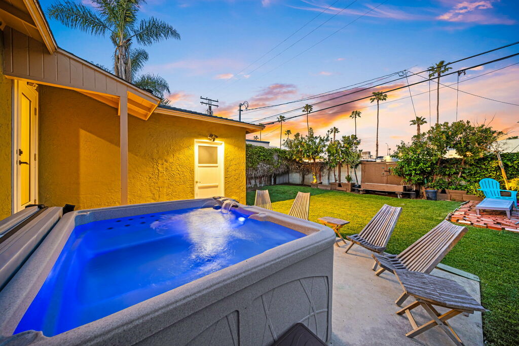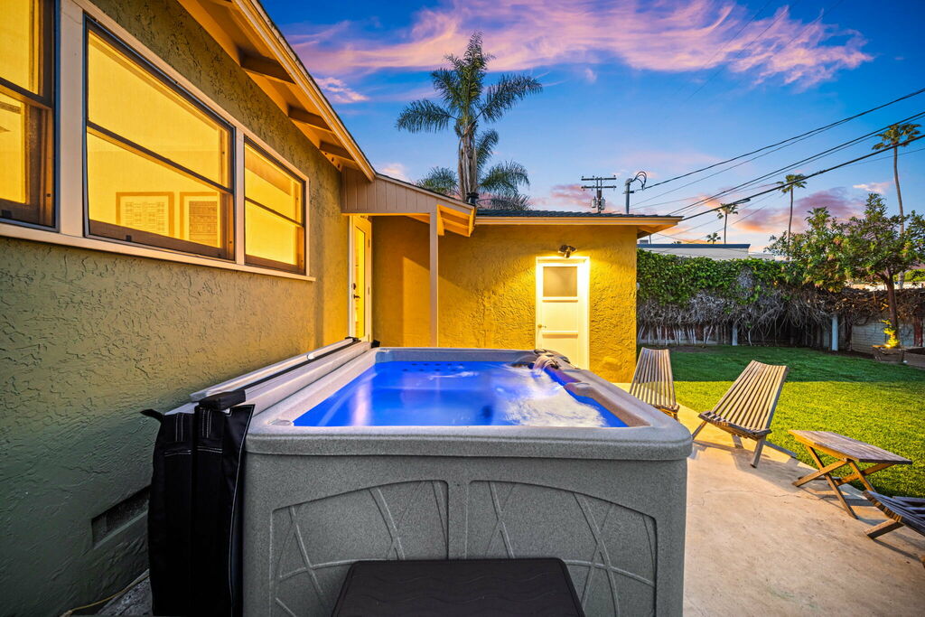 The large private backyard is where families really fall in love with this home. There’s plenty of room for kids to run and play, stretch out on the grass, or enjoy outdoor games like cornhole while adults relax nearby. Sun loungers and a hammock offer a perfect spot for soaking up the coastal sunshine, and the private jacuzzi adds a luxurious touch for unwinding in warm, bubbling waters. The fire pit creates an easy gathering place for s’mores, stories, and winding down together in the evenings.