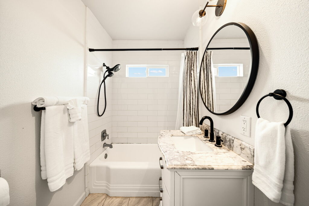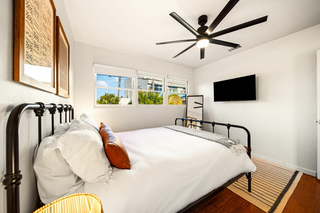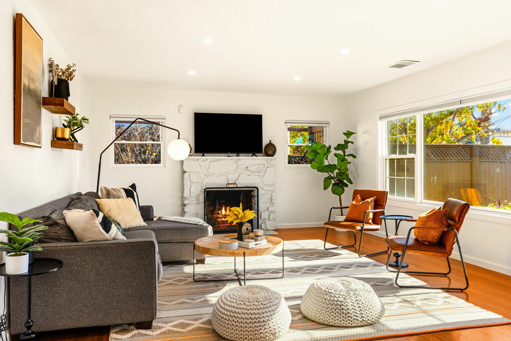 Inside, the home blends a clean, modern design with a cozy comfort that’s ideal for families. The living room features a fireplace for relaxed evenings after the beach, comfortable seating for movie nights, and a queen sleeper sofa for extra sleeping space. Two inviting bedrooms include a king bed and a queen bed, while the full bathroom is conveniently located to serve both bedrooms and common areas with ease.