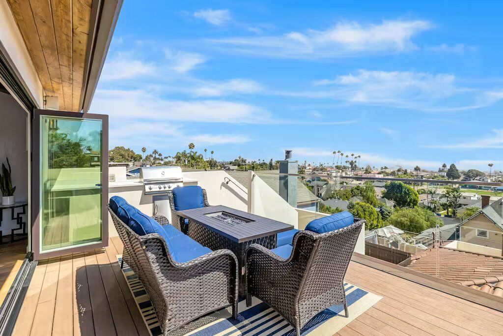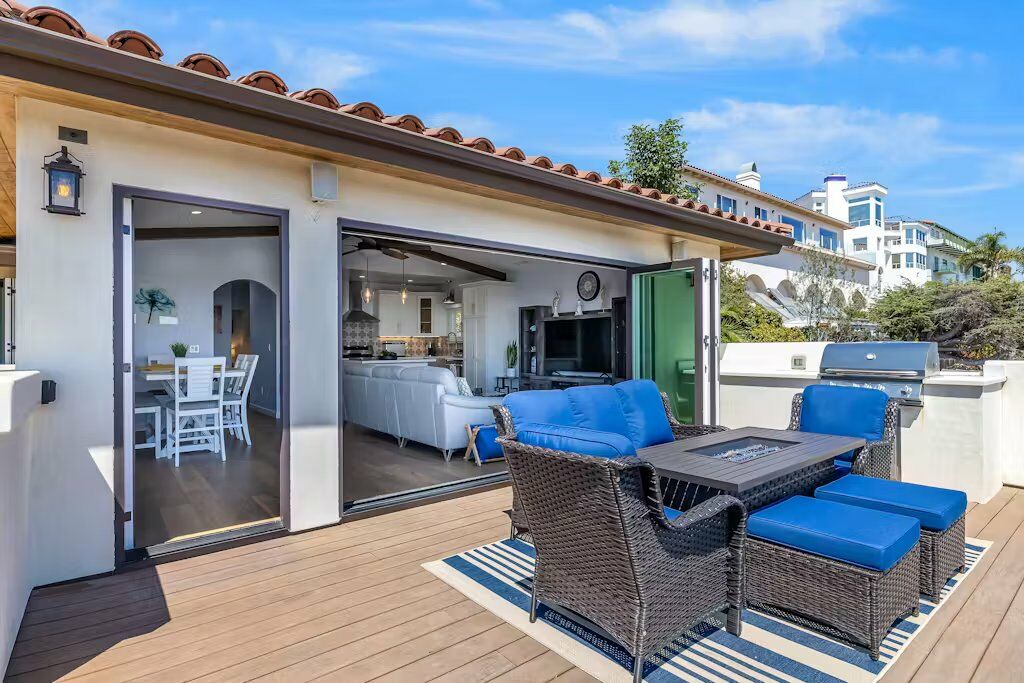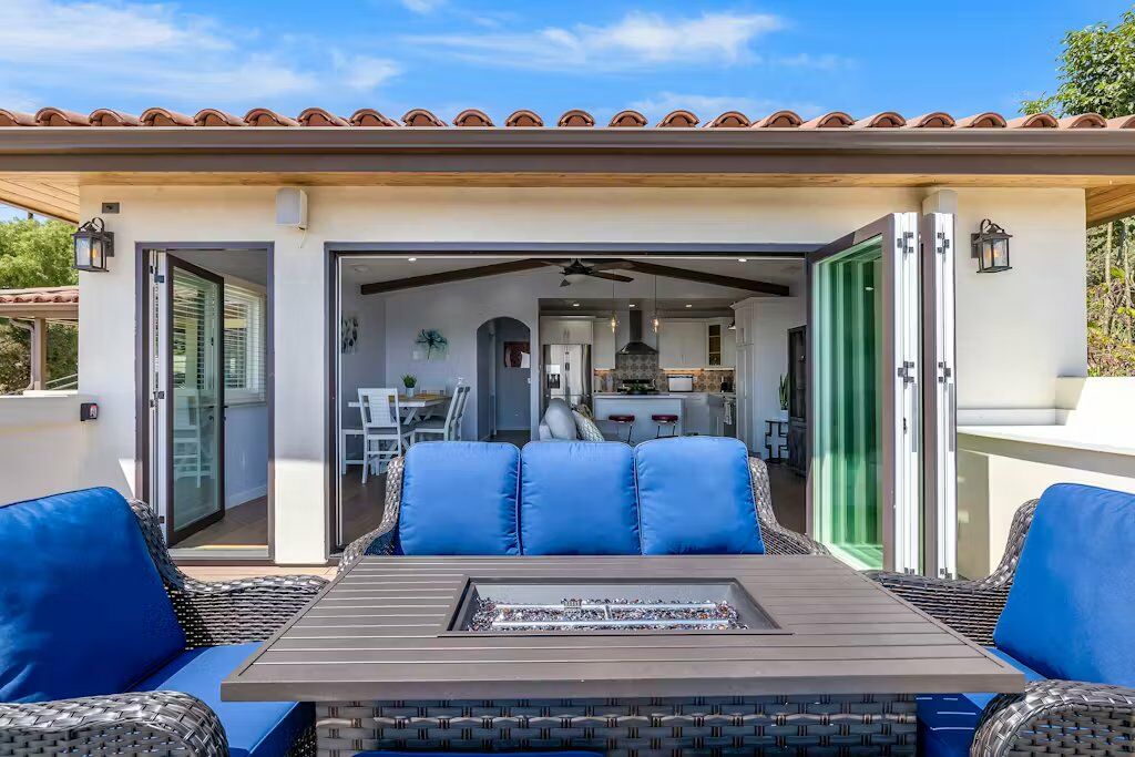 As you step inside, you're greeted by a bright and welcoming interior, where natural light pours in through La Cantina bifold doors, creating a seamless indoor-outdoor flow. The living area, with its plush furnishings and large TV, is the perfect spot to unwind after a day of adventure. Outside, the private patio is an entertainer’s dream, featuring a grilling station, a fire table, and cozy seating, all with gorgeous coastal views.