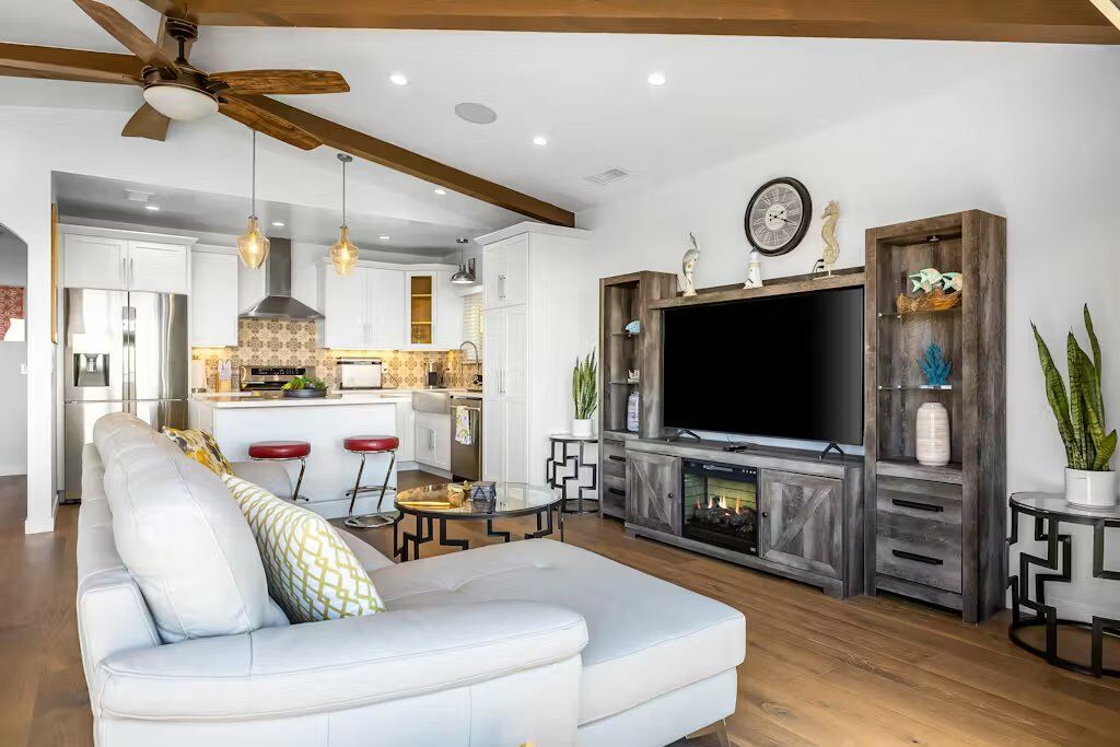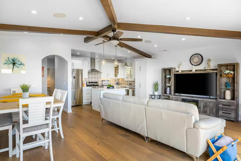 The heart of the home is the kitchen, equipped with stainless steel appliances and a floating island breakfast bar, ideal for preparing everything from group meals to beach picnic snacks. Whether dining indoors or alfresco at the outdoor dining table, you’ll savor every moment against the backdrop of Ventura’s stunning sunsets.