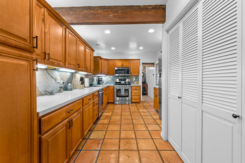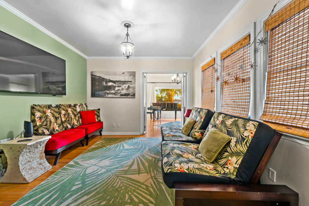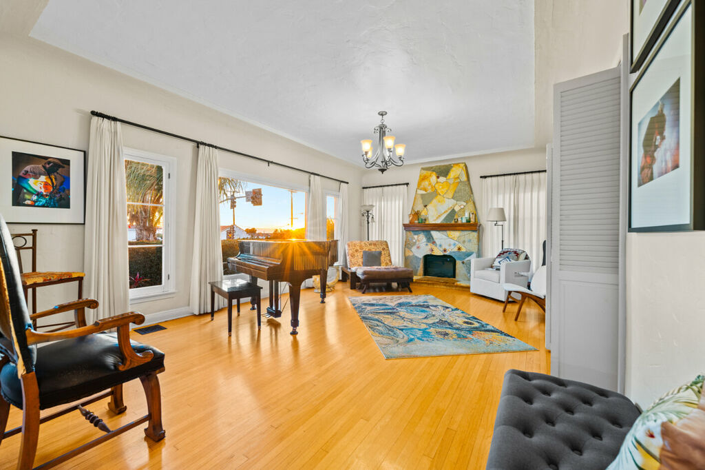 The living room invites you to unwind by the fireplace, and enjoy tinkering on the piano while enjoying the views of the Ocean and Channel Islands! The living room flows seamlessly into a remodeled galley kitchen with updated appliances and two dining areas perfect for entertaining. A den provides additional flexible space for a 3rd bedroom or office.