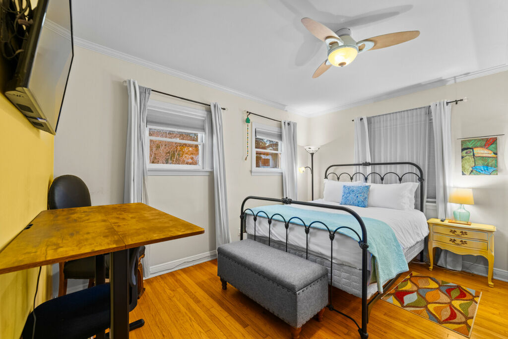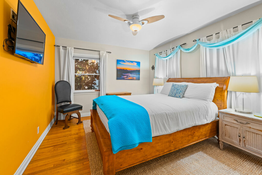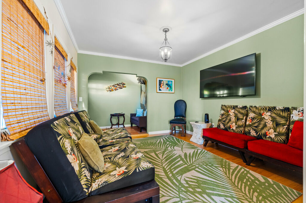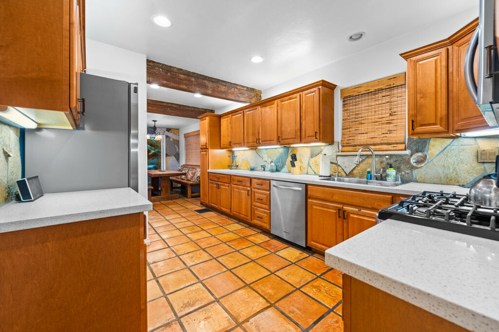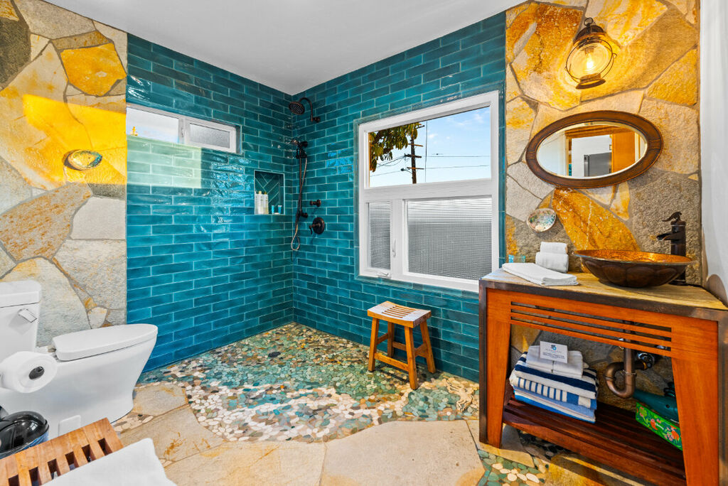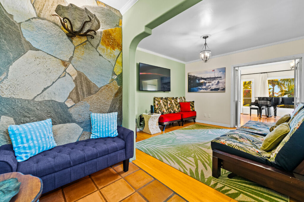 The 2-bedroom, 2-bath layout is thoughtfully designed for your comfort. One of the bathrooms even showcases natural rock elements for a 'canyon-inspired' feel, while the other features refreshing aqua subway tiles transporting you to the nearby ocean. Skylights and picturesque windows fill the home with natural light, highlighting gleaming hardwood floors and unique architectural touches throughout.