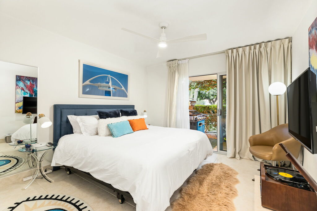 Step inside to find a comfortable living space with modern amenities, including a fully equipped kitchen, a spacious bedroom with a plush king-sized bed, and ensuite bathroom. The living area opens up to your own private patio, complete with outdoor seating and a BBQ grill—perfect for enjoying sunny days and starry nights in the privacy of your own space.