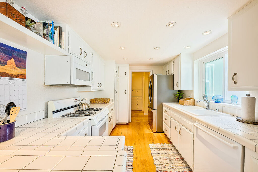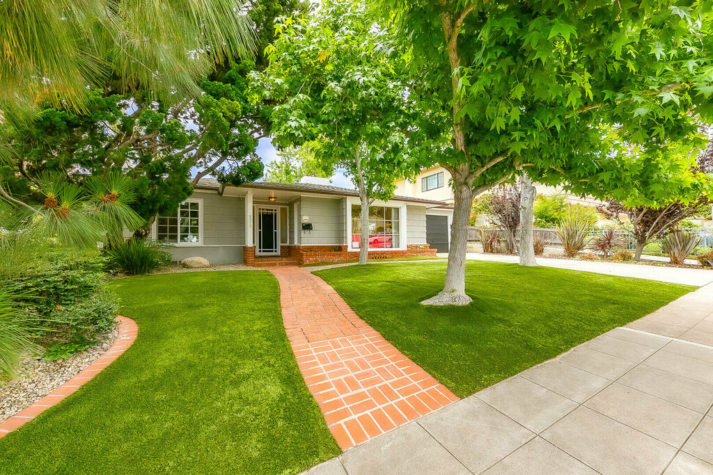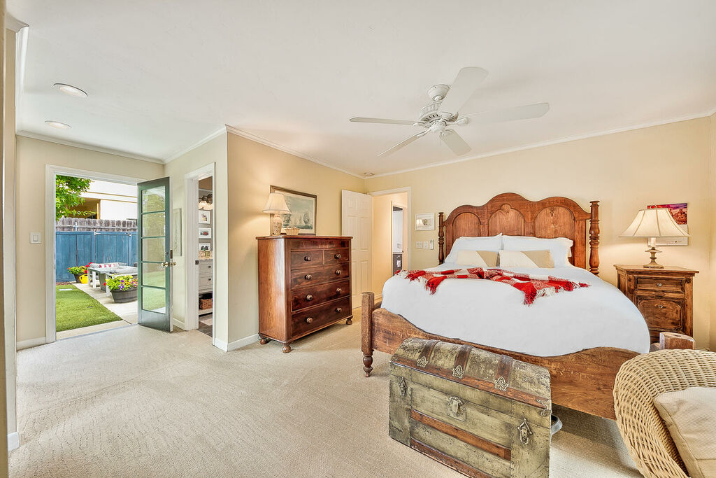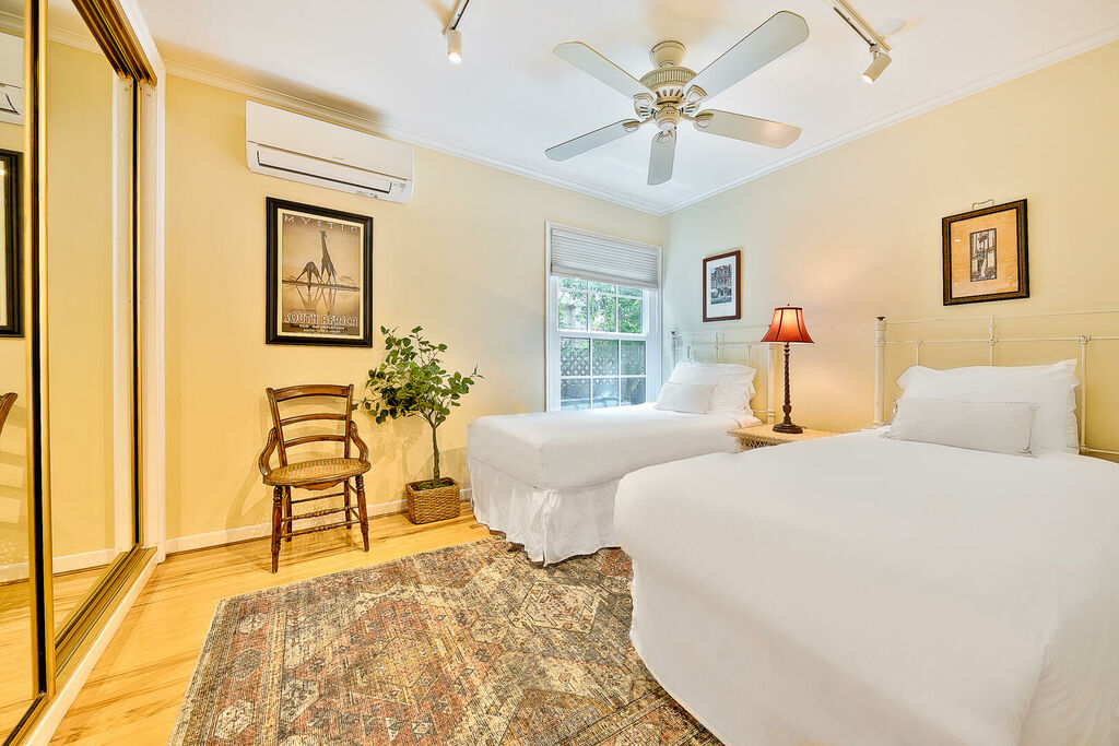 The primary queen bedroom also has a ceiling fan a large closet and an updated ensuite bath. Down the hallway the middle bedroom has two twin beds perfect for kids with the second queen bedroom featuring AC, a large closet and front of house views. The expansive private backyard features a large seating area for the whole family a firepit a large turf area for kids and pups to play and a lounge area with fruit trees for the picking.
