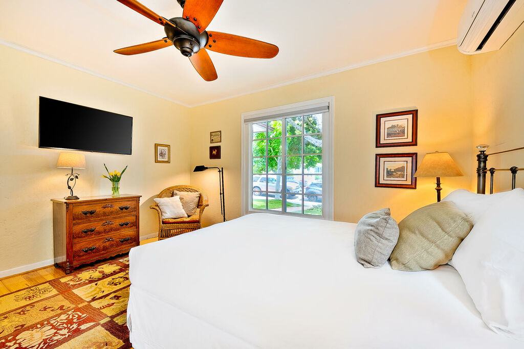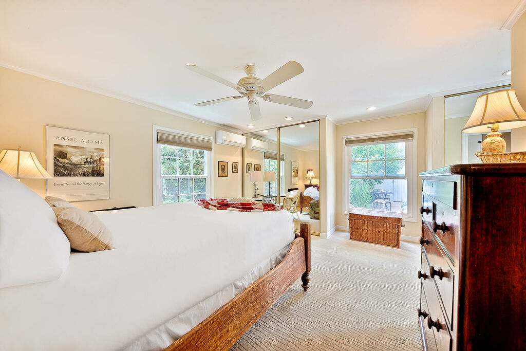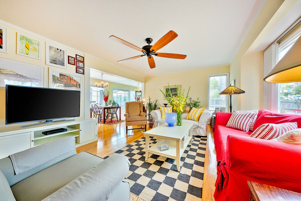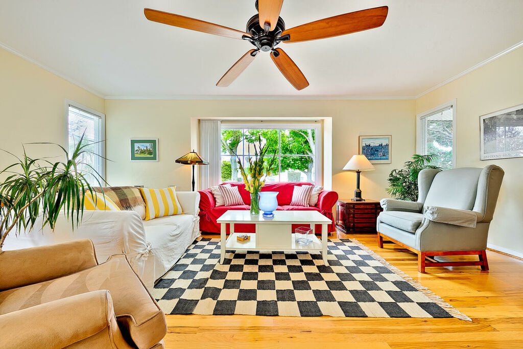 This spacious home comfortably sleeps six in beds and is also a great option for anyone who wishes to spend the winter months in a warmer climate in a beautiful seaside community. Walk up the serene tree-lined brick sidewalk of this home and when you open the door you will find yourself in a sunny great room with lots of large windows making it feel light bright and airy. The living room area has lots of comfortable cluster seating from which everyone can watch the large flat screen TV. A ceiling fan for your comfort is also a wonderful extra. Next to the living room is a desk space for remote working and a four-seat dining table with a kitchen breakfast bar for two. The nearby kitchen has everything you need to satisfy your culinary desires just add the food and camaraderie and have fun.