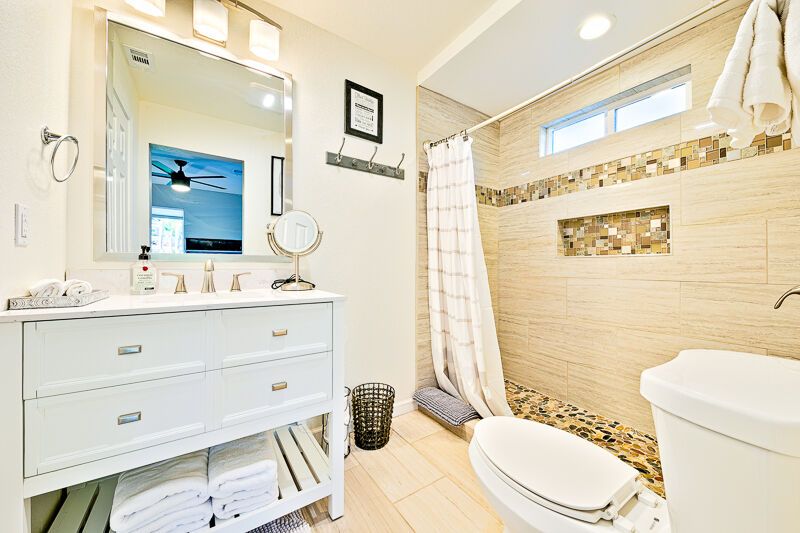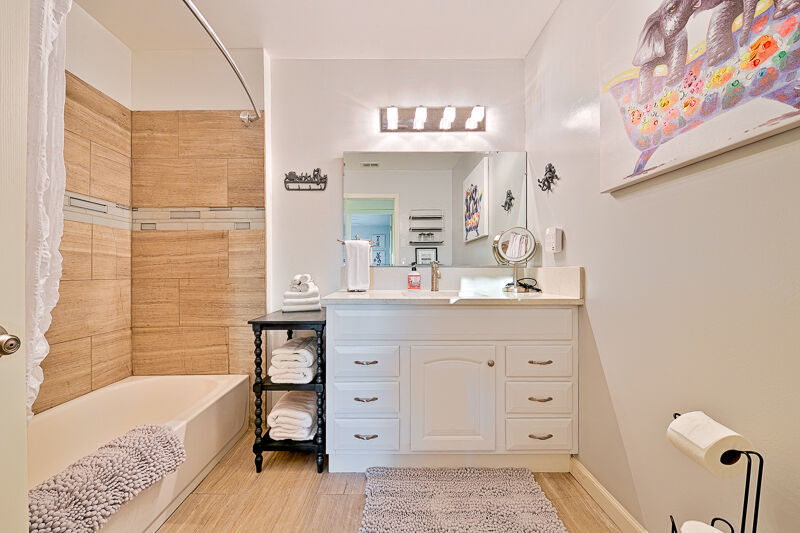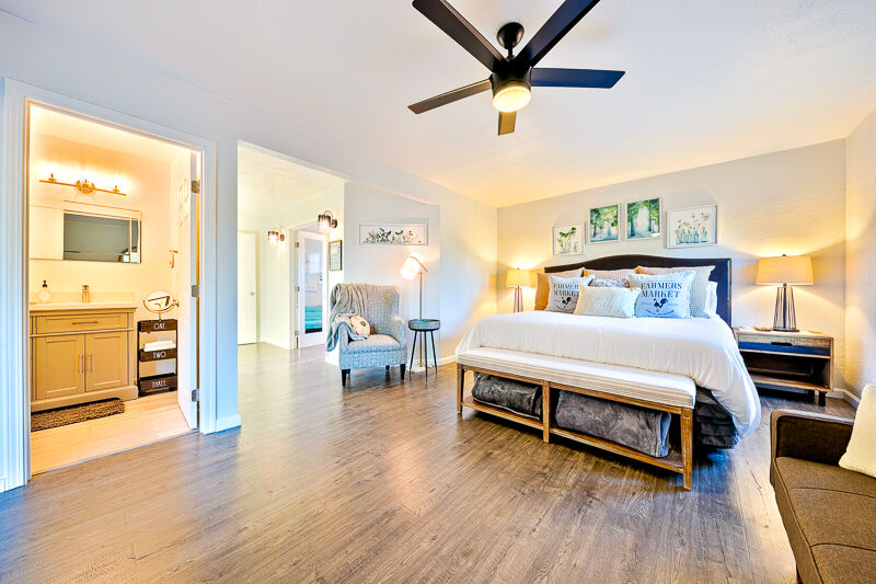 The king main bedroom has an en suite bath with a large walk-in shower and everything you need for private retreat space. There is also a second king bedroom and two queen bedrooms and a queen sofa bed. There are also two additional full baths, and all beds and bathrooms are furnished with an ample supply of premiere linens to ensure that you have everything you need to be comfortable at all times. Additional amenities include a washer and dryer, air conditioning, WiFi and cable, and a long driveway for parking.
