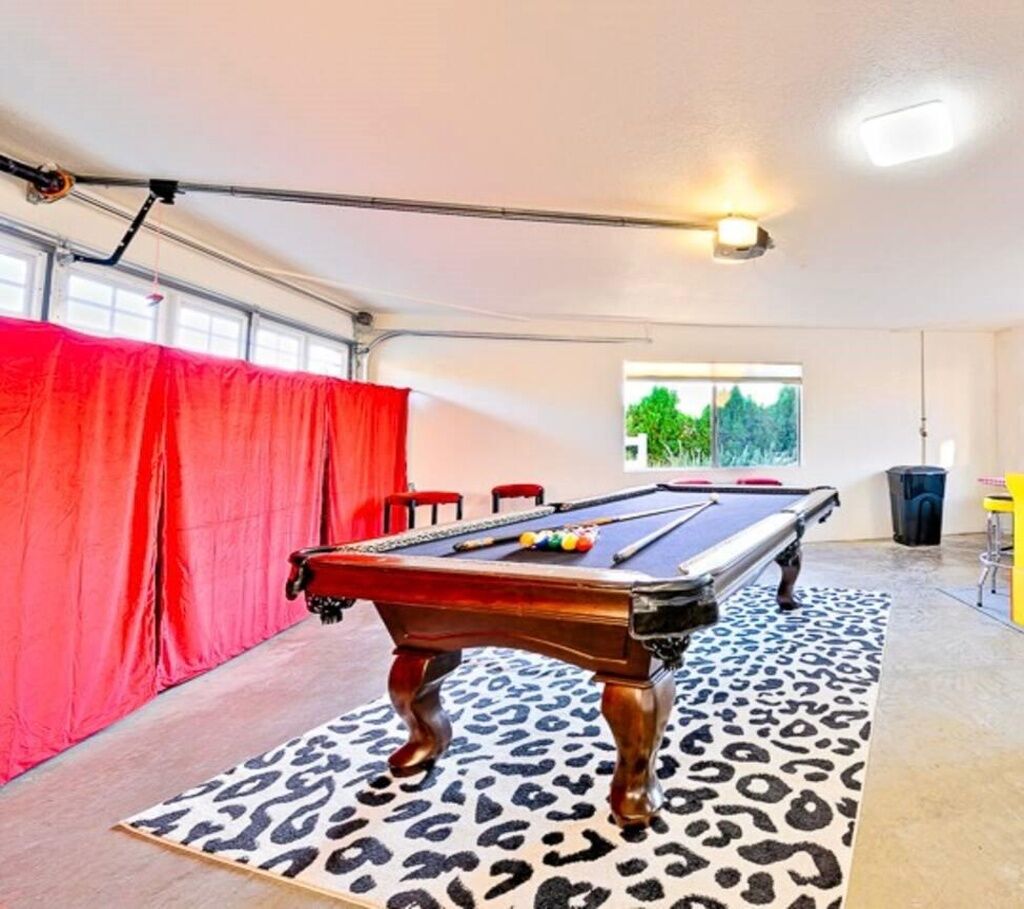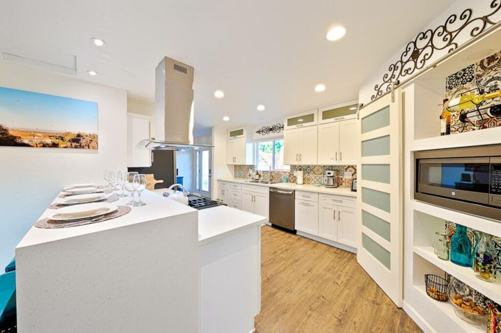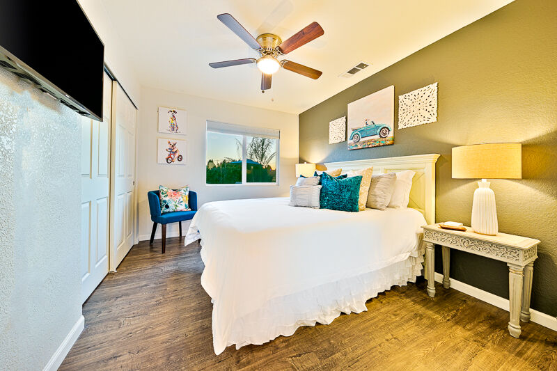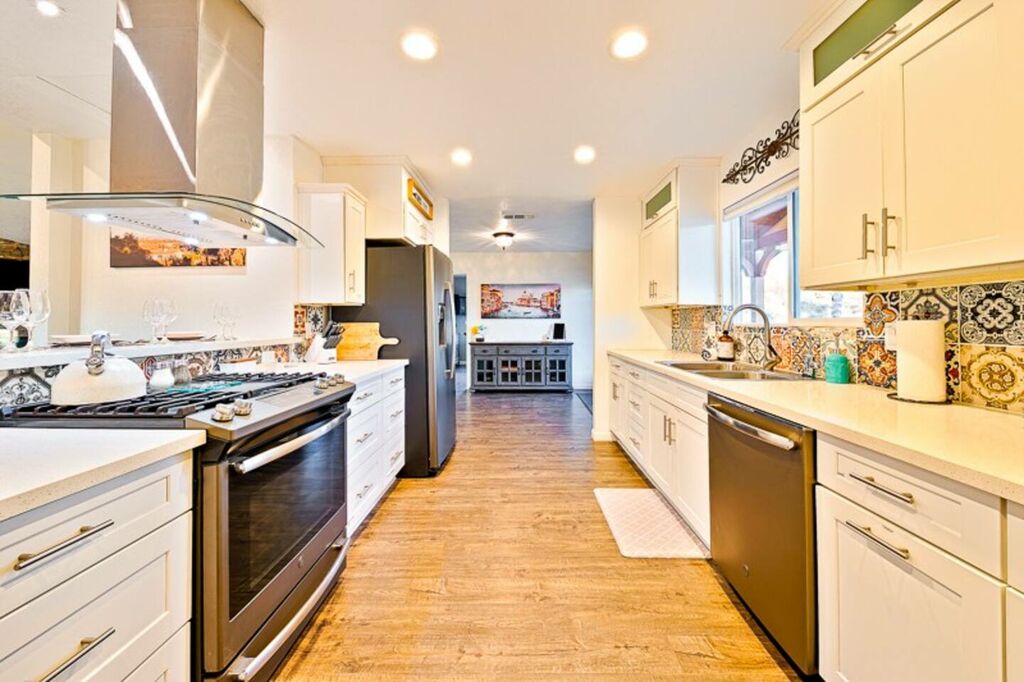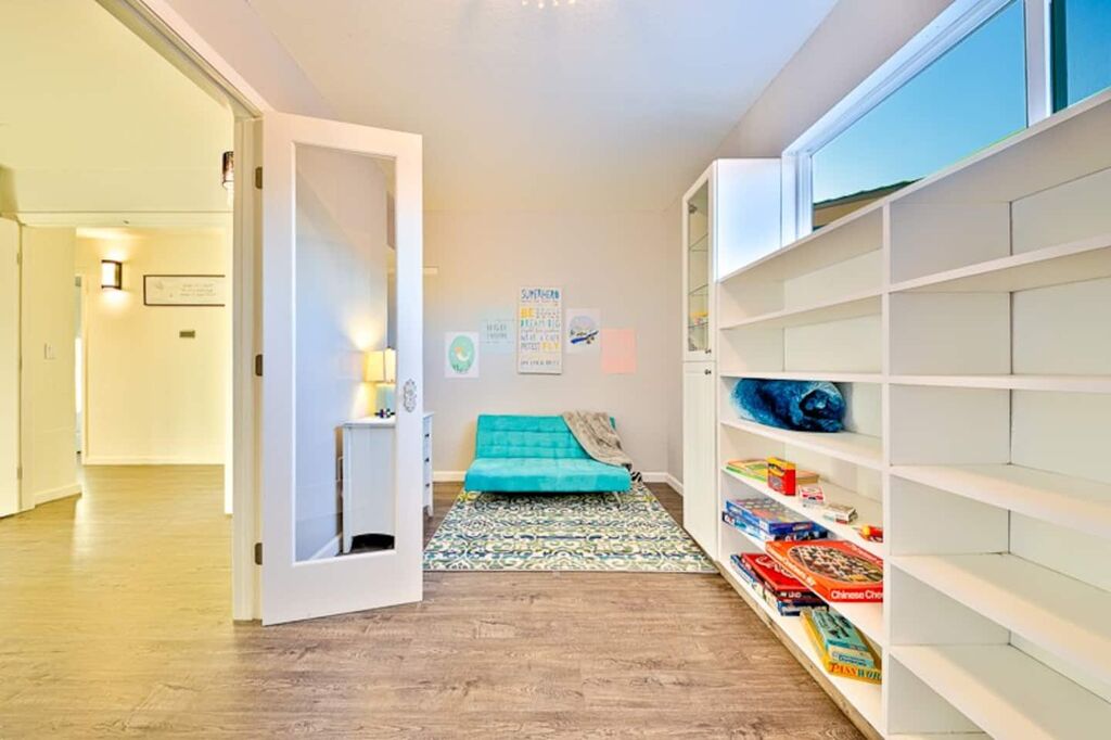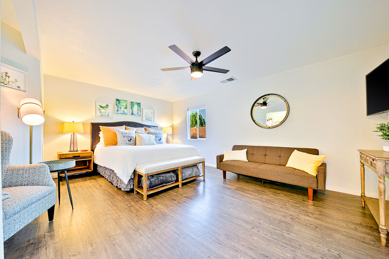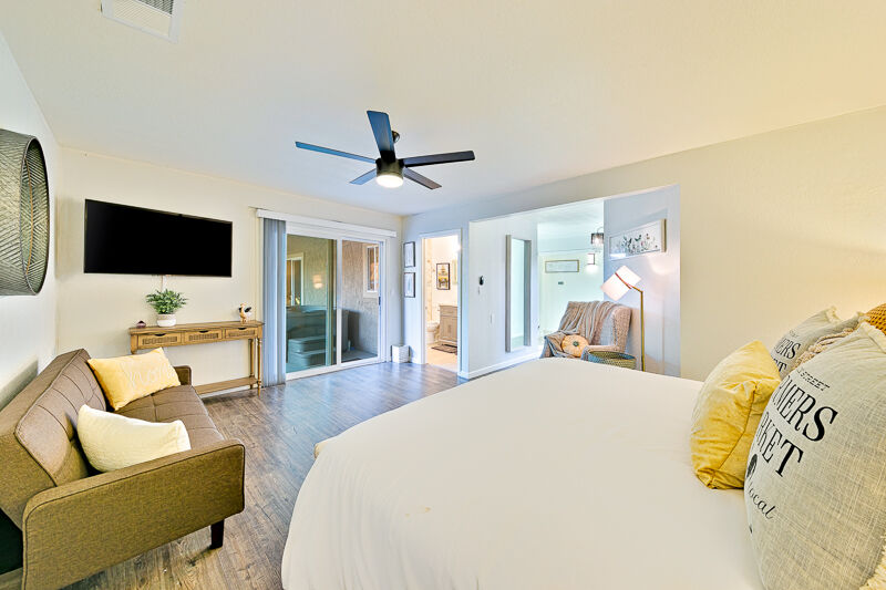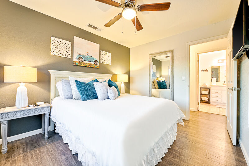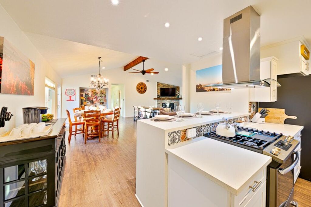 This home (with A/C) features a flowing, open floor plan in the cathedral ceiling living, family, and dining areas. There is a large flatscreen TV, a ceiling fan, lots of comfortable seating so everyone can be together, and easy access to the outside pool area. A dining area that seats eight is accompanied by a newly remodeled modern kitchen that has everything you need to satisfy your culinary desires. Additional bar seating creates dining space for the whole family. This home has a wonderful inside playroom next to the master bedroom so kids can also play there.