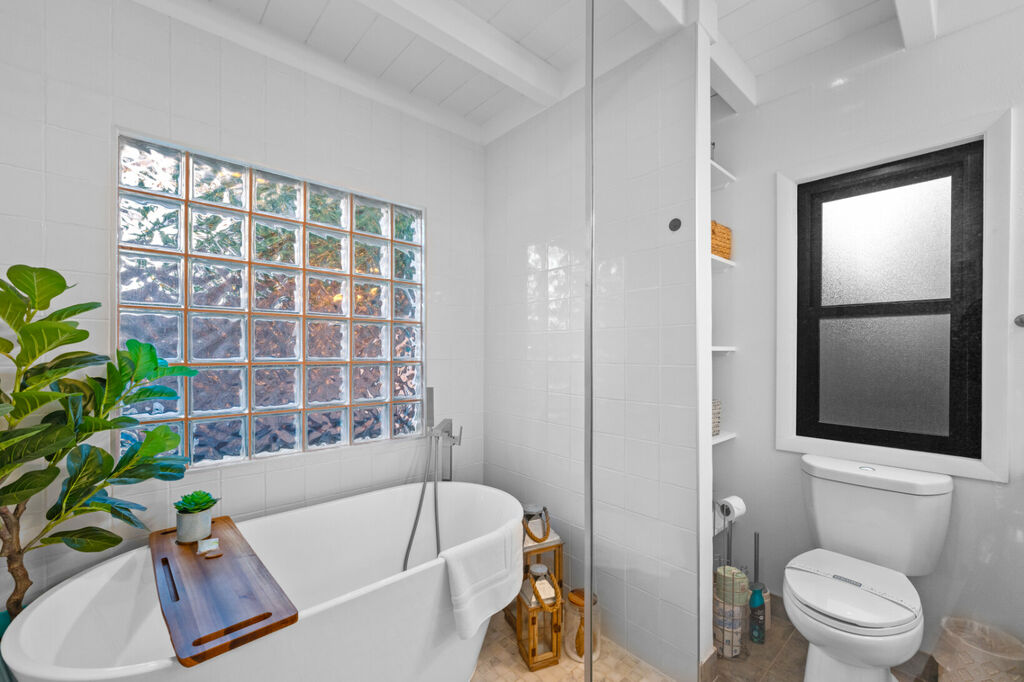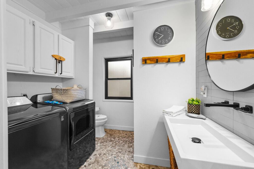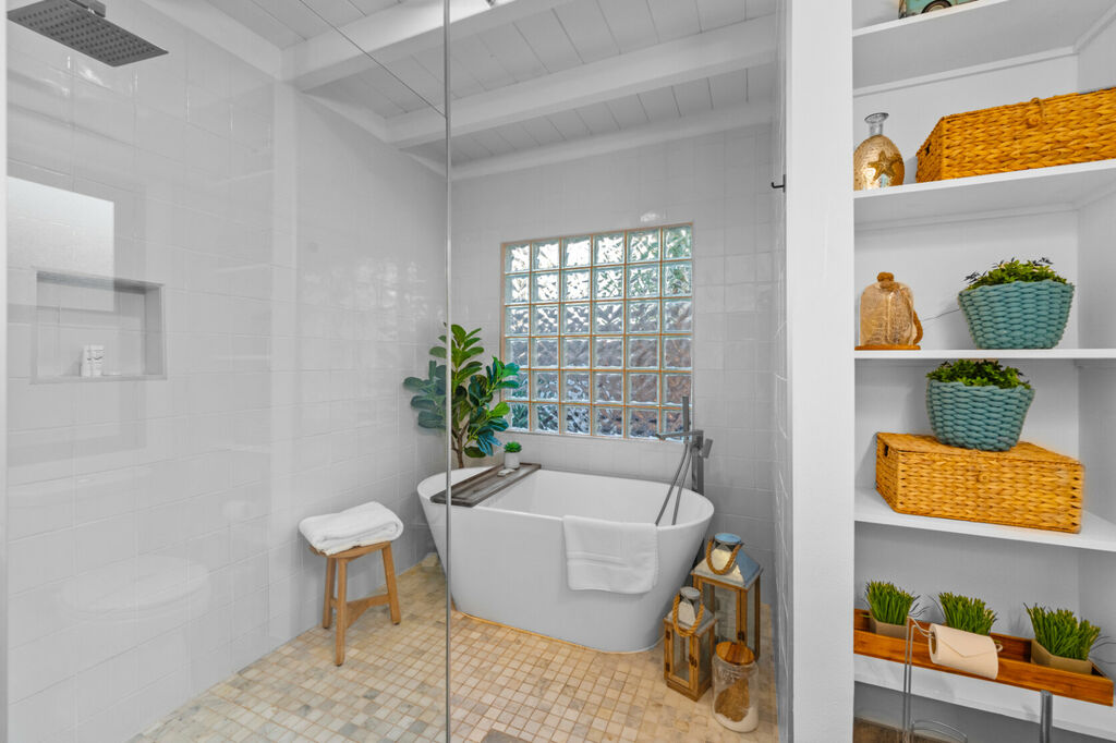 Retreat to the serene bedrooms, where rest and rejuvenation await. The primary suite boasts an en suite bathroom with the added convenience of a washer/dryer, while a second full bathroom offers a luxurious separate soaking tub and walk-in shower.