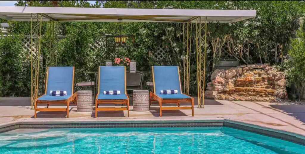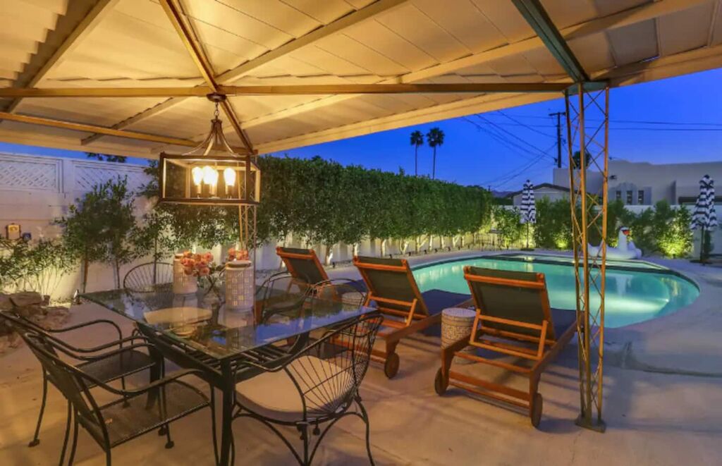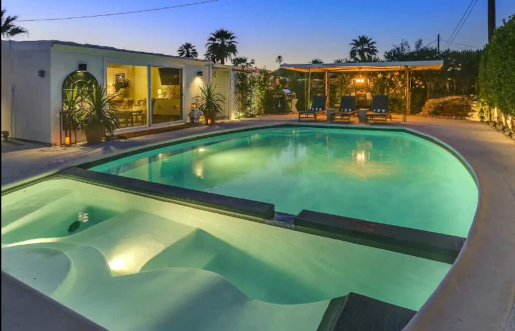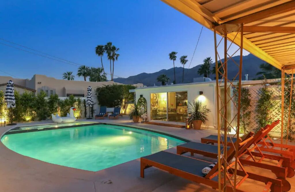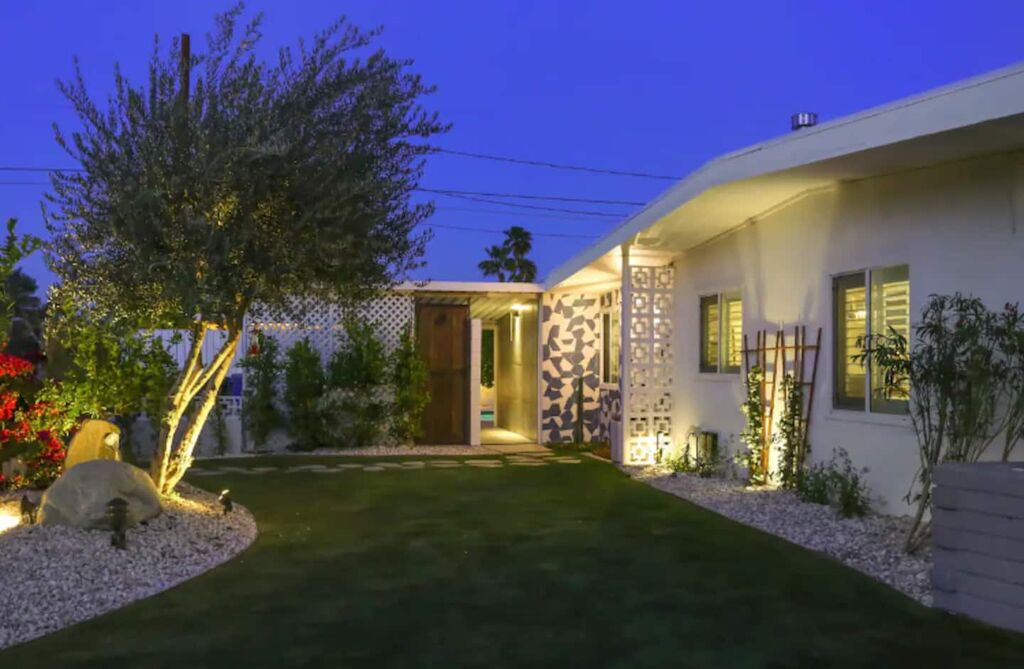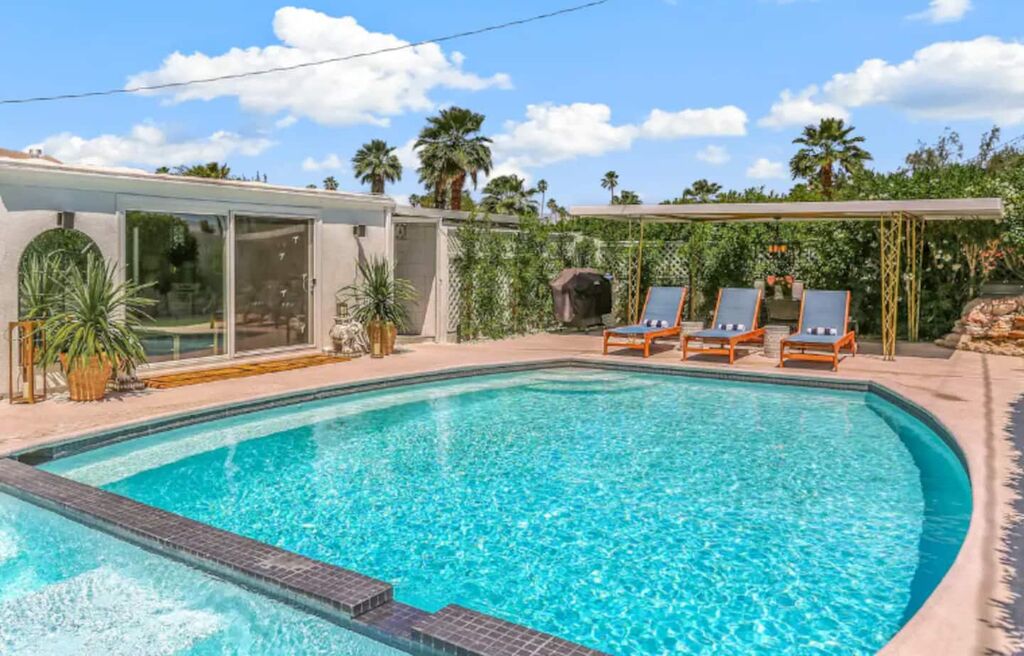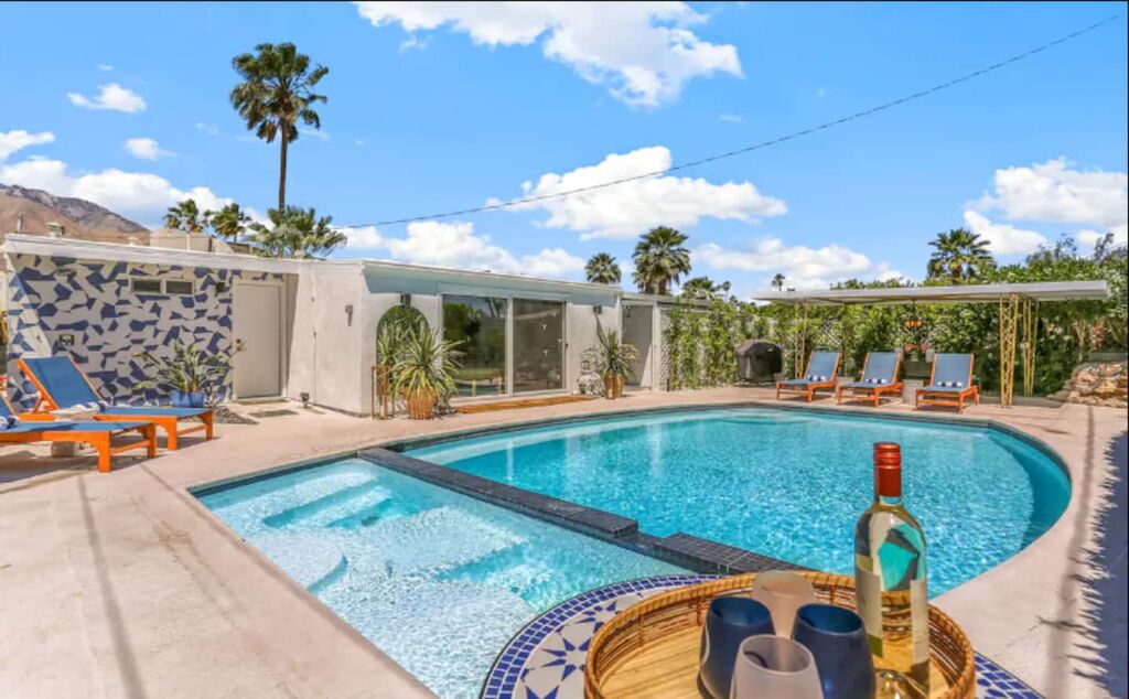 This 3-bedroom, 3-bath residence boasts designer furnishings, custom bedding, exquisite tile work, and two captivating water features. Take pleasure in a heated pool, a spacious hot tub, and a private oasis of Palm Springs-inspired landscaping adorned with three citrus trees. Conveniently located just a 5-minute drive from the airport and 1.7 miles from downtown Palm Springs.