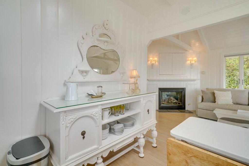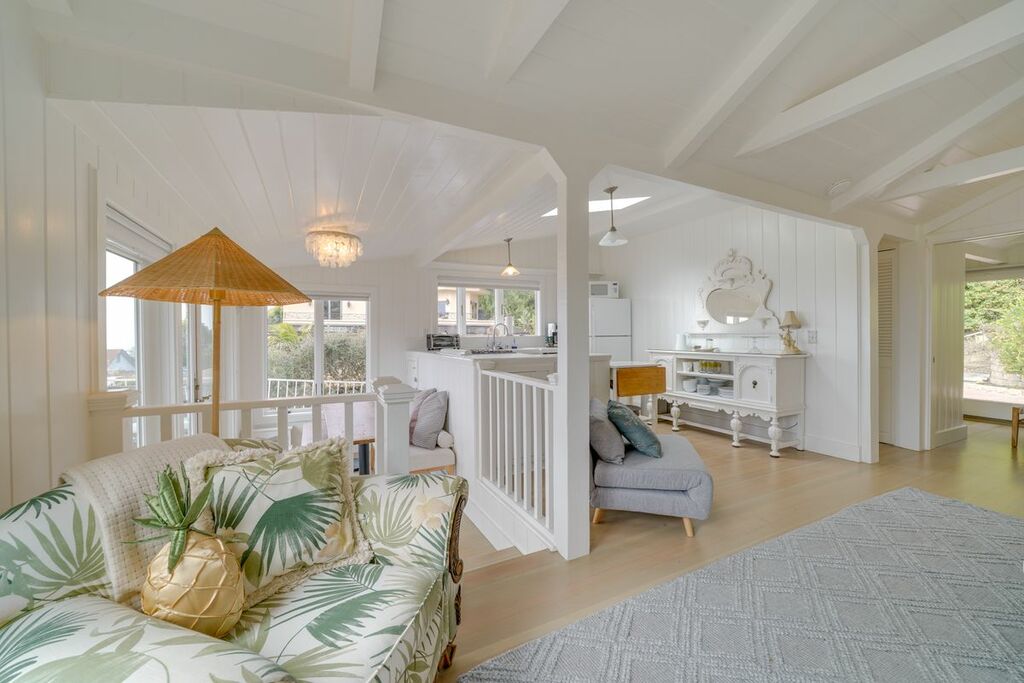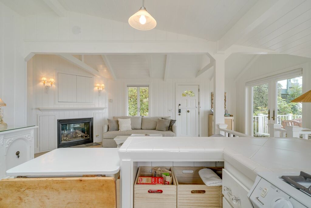 Inside, the cottage offers a clean, inviting atmosphere with natural light that fills the space, creating a calming, coastal feel. A cozy fireplace adds warmth to the living area, perfect for cooler evenings. The living space opens directly to a deck where you can relax, enjoy the sunset, or take in the morning light over the ocean.