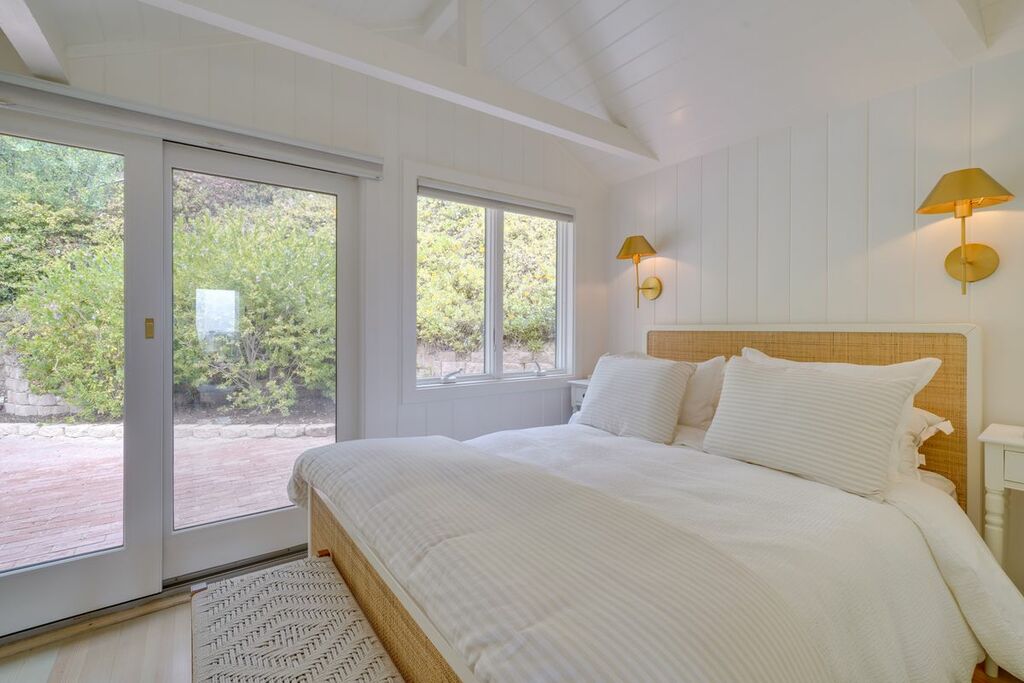 The bedroom is a quiet, restful space designed for comfort and relaxation. Soft lighting, quality linens, and natural textures create a welcoming atmosphere. A sliding glass door opens directly to the courtyard, making it easy to step outside for a morning coffee or evening relaxation. The bathroom is perfect for unwinding after a day by the coast, offering a space to refresh and relax.
