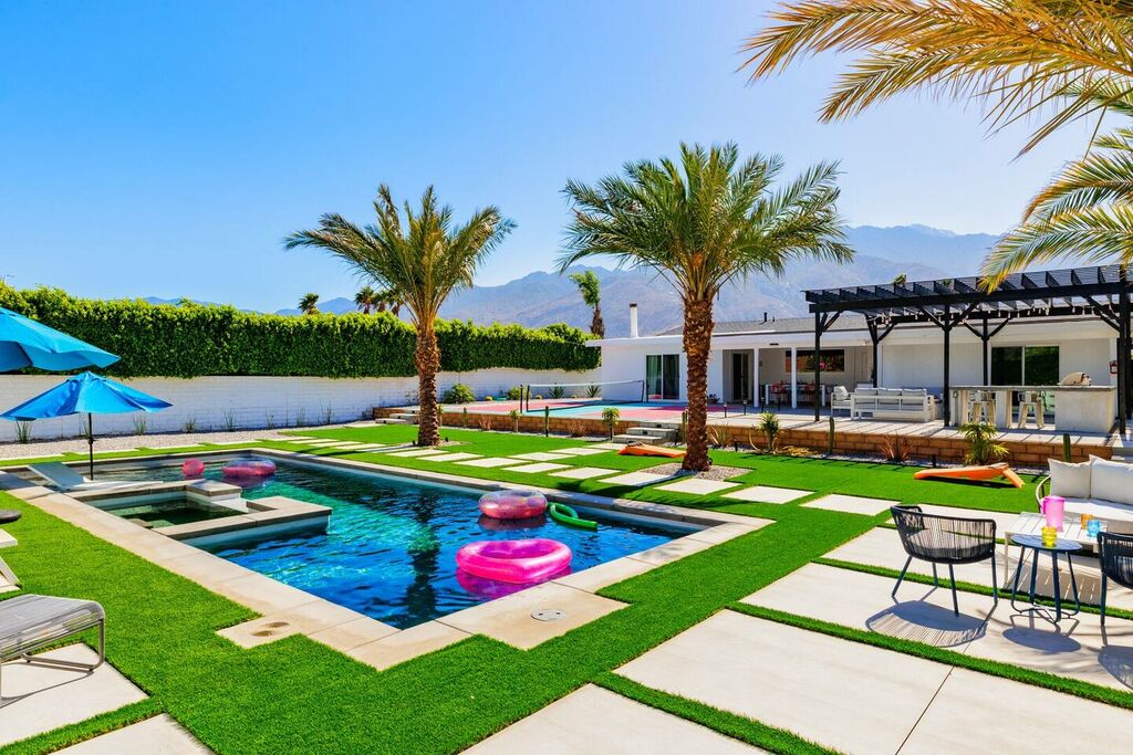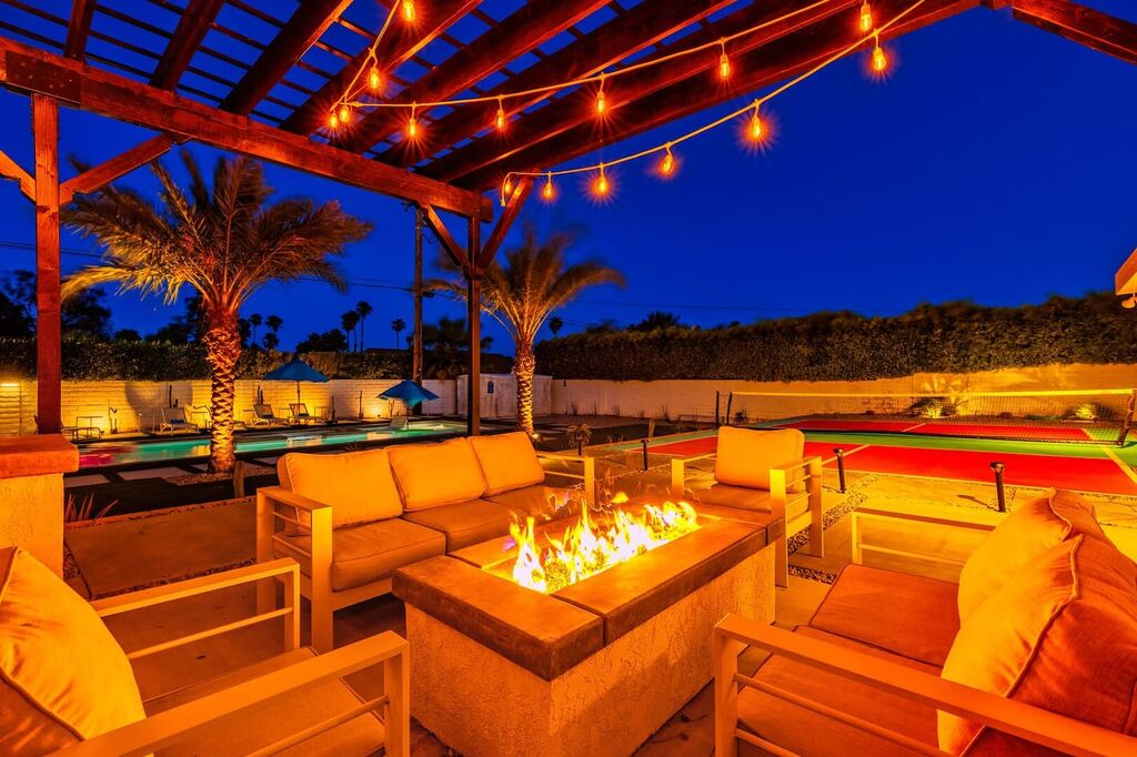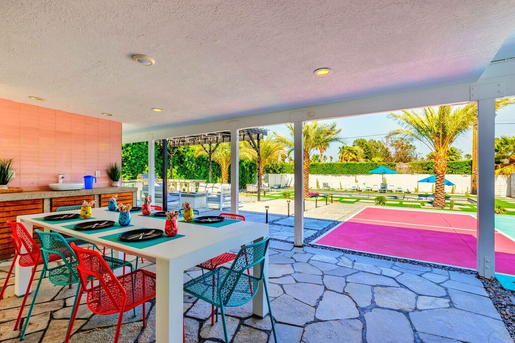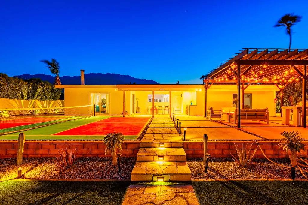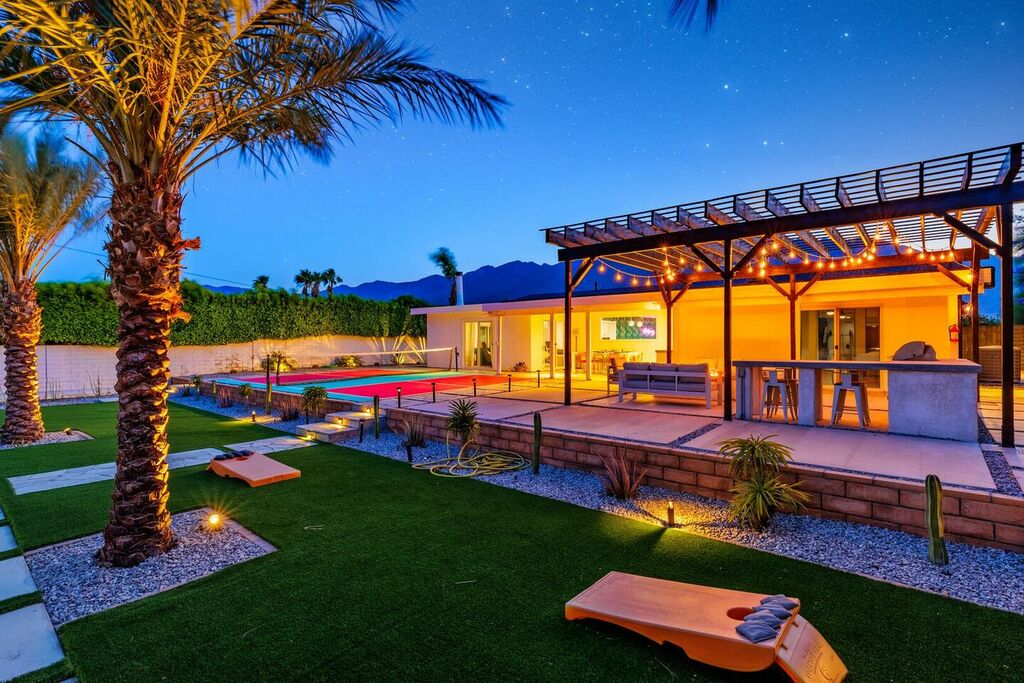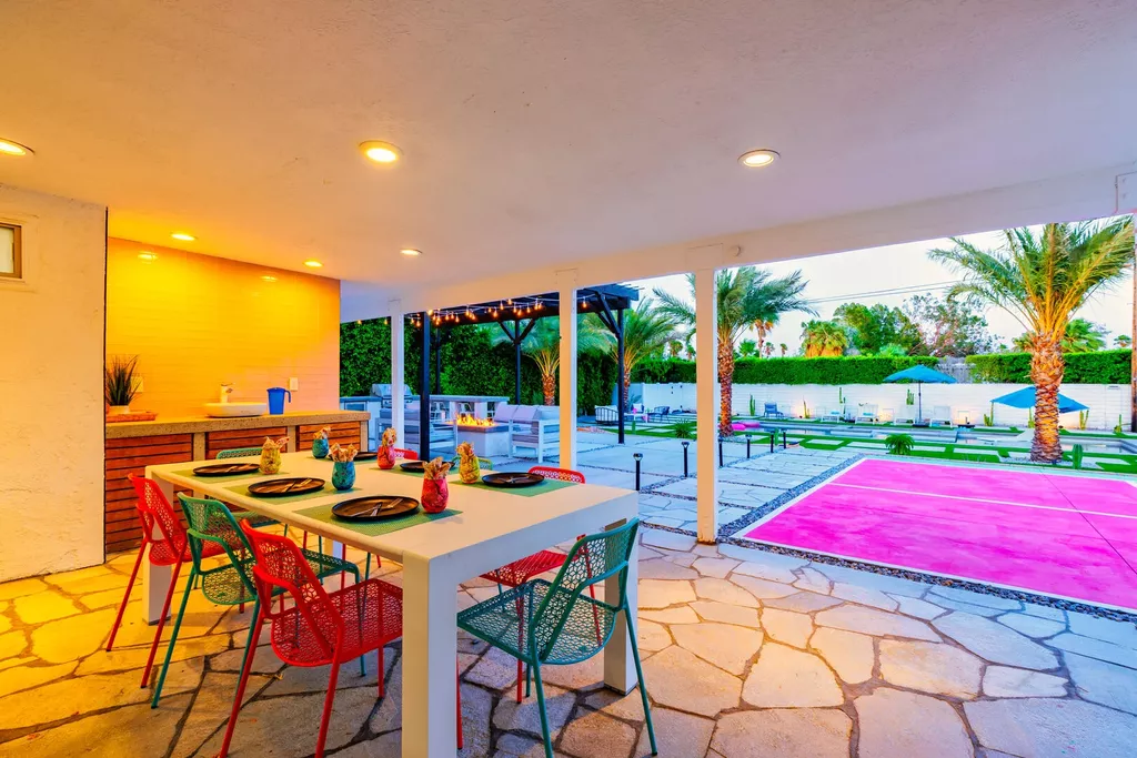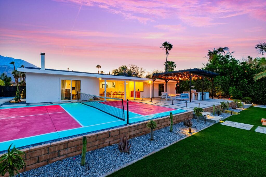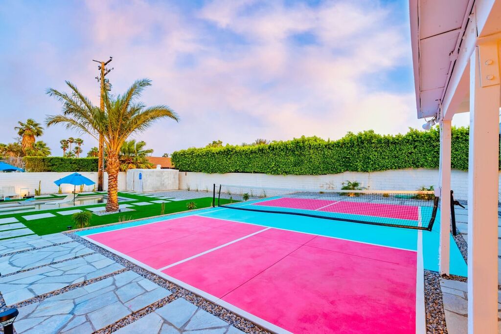 Welcome to Palm Springs! This exquisite 4-bedroom, 3-bath (plus 1 outdoor shower!) ‘Pickleball Haus’ offers an unparalleled experience of comfort, elegance, and recreation. Nestled in a serene location, this property is the epitome of relaxation, boasting a private pickleball court, an expansive pool with built-in hot tub and Baja shelf, and outdoor seating areas designed for ultimate relaxation and entertainment.